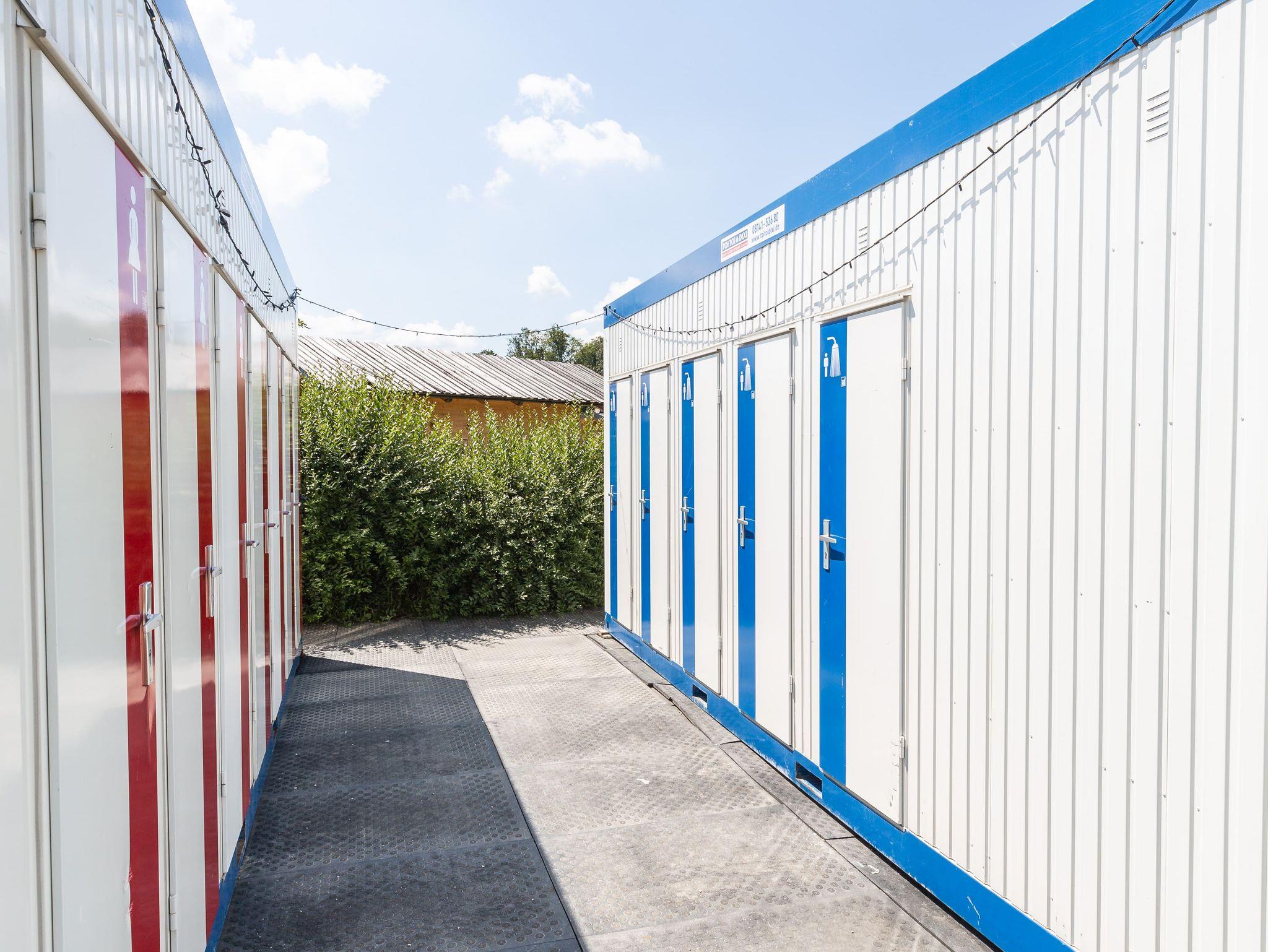 Fließend Wasser und sanitäre Anlagen befinden sich in einem Container auf dem Gelände.