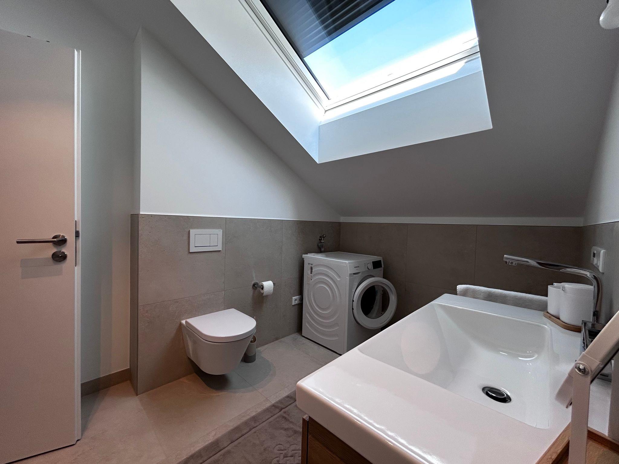 Auch das Badezimmer steht dem Rest in nichts nach: Mit viel Licht von oben, bodenebener Dusche, Waschmaschine und geschmackvollen Details ist es der perfekte Ort für einen entspannten Start in den Tag.