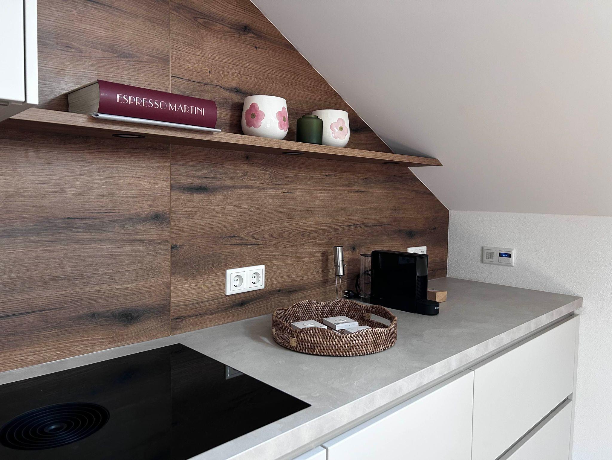 Die offene Wohnküche lässt keine Wünsche offen – mit modernen Geräten, stilvoller Ausstattung und liebevollen Details wie einer Espressomaschine für den ersten Kaffee mit Bergblick.