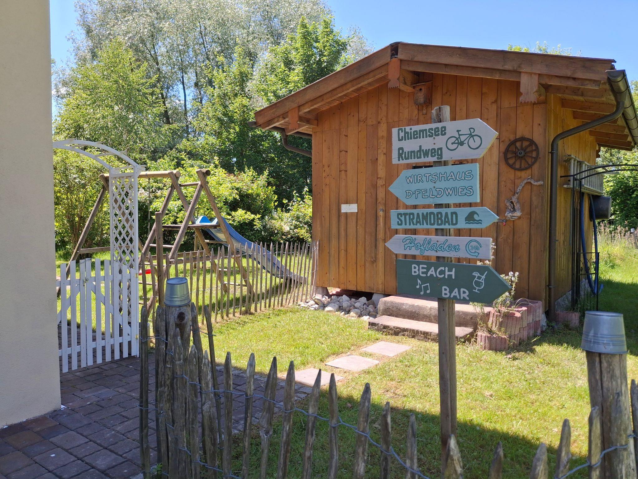 Das komplett eingezäunte Gartengrundstück liegt am Überseer Bach, der durch die blühenden Sträucher immer wieder durchschimmert. Mit dem SUP oder Kajak kannst Du vom Bacheinstieg aus Deine Tour auf dem wunderschönen Chiemsee beginnen.