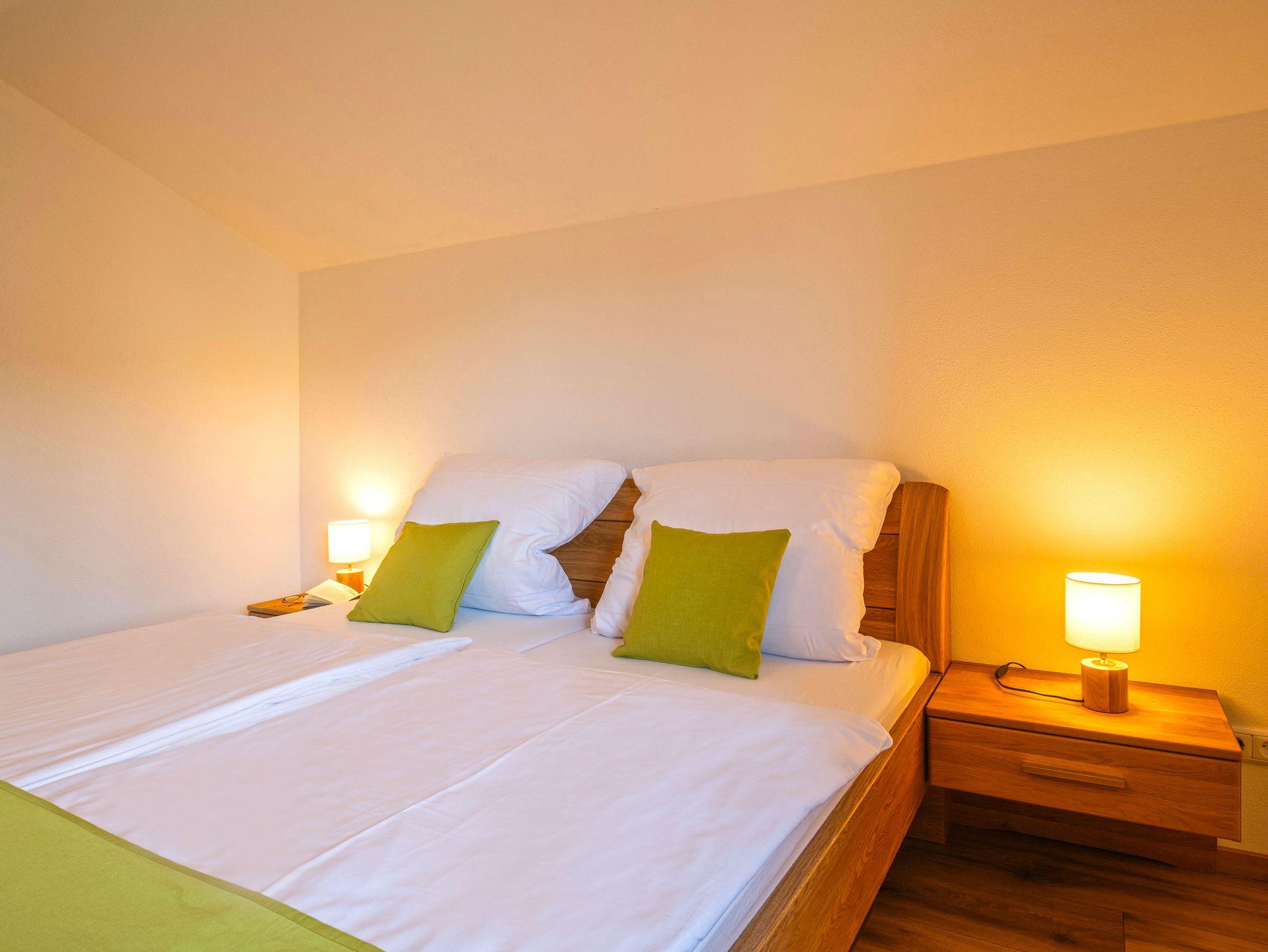 Unsere Ferienwohnung wurde komplett energetisch saniert und befindet sich im 1. Obergeschoss. Hochwertig und komfortabel ausgestattet mit modernen Einrichtung. Mit 100m² Wohnfläche bietet sie viel Platz für 1-4 Personen. Kinder sind bei uns sehr willkommen (Babybett und Hochstuhl kostenlos). Fußbodenheizung im gesamten Obergeschoß. Hand- und Duschtücher stehen für Sie zur Verfügung.