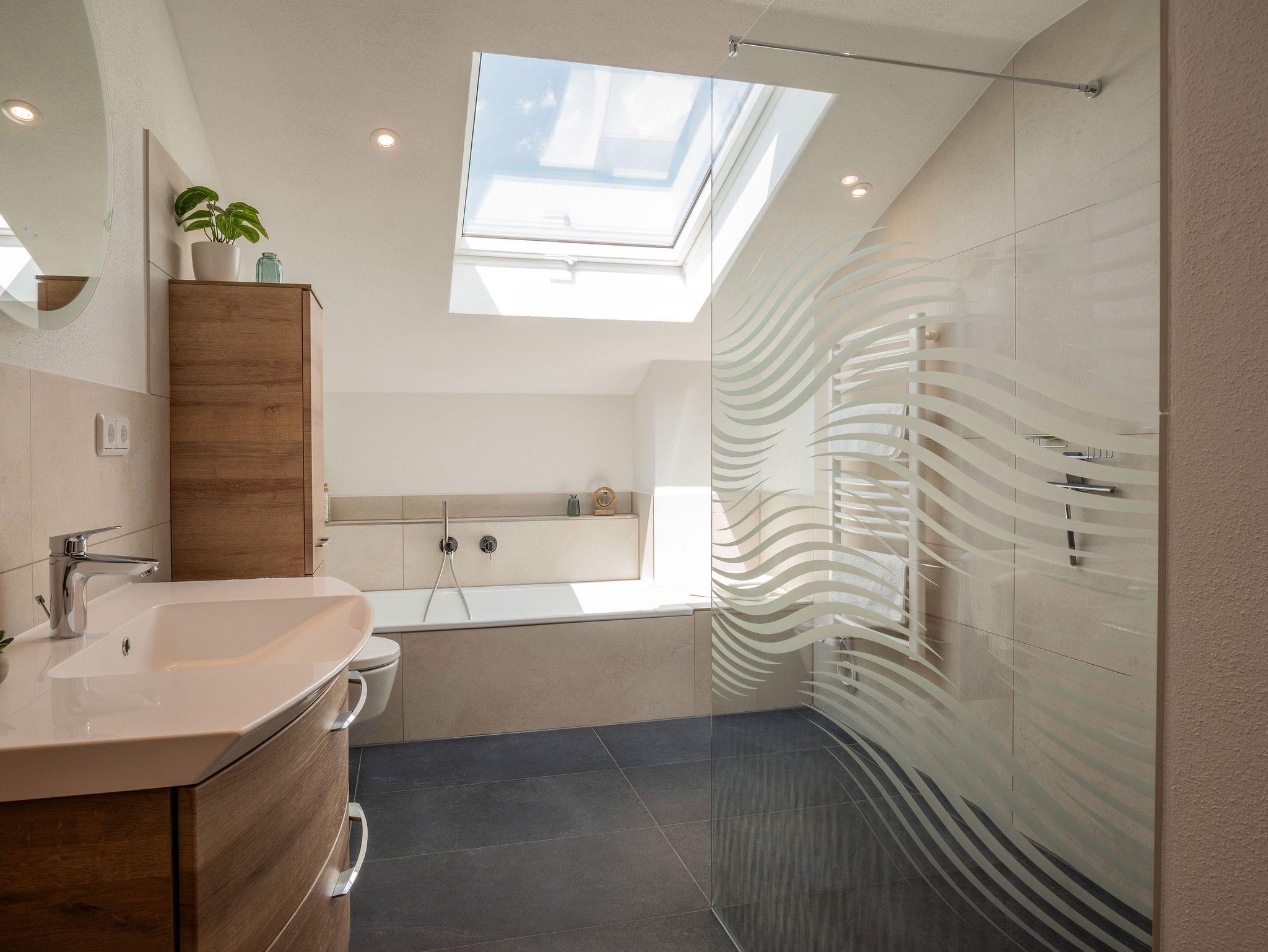 Bad: Badewanne, ebenerdige Dusche mit Glaswand, elektrischer Handtuchtrockner, Fön, Flüssigseife, Kosmetiktücher, LED Spiegel, Sitzplatz, Toilettenpapier, Wandheizung, WC, Waschtisch.
