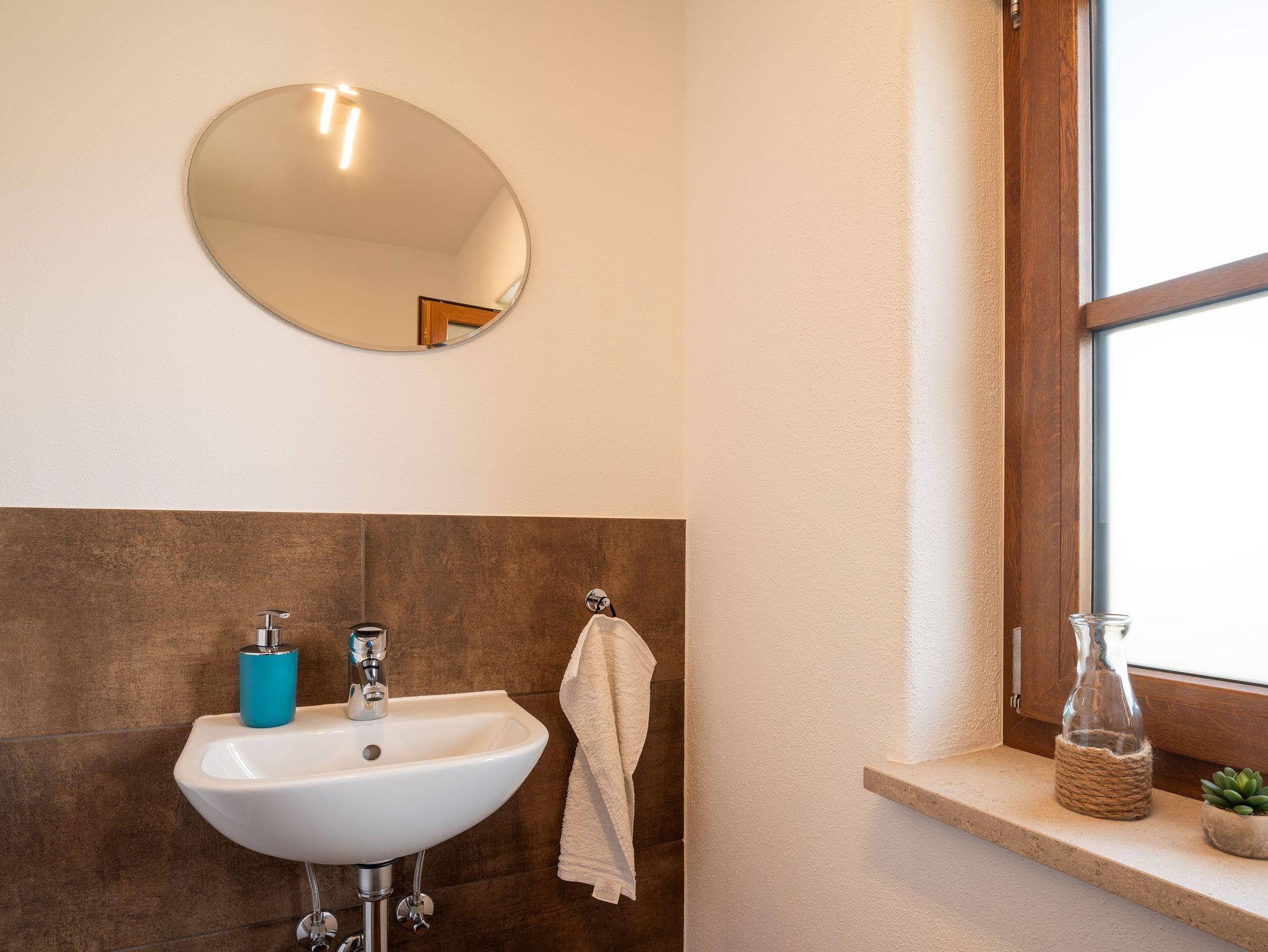 Gäste-WC: Flüssigseife, Gästehandtuch, Insektenschutzgitter, Toilettenpapier.