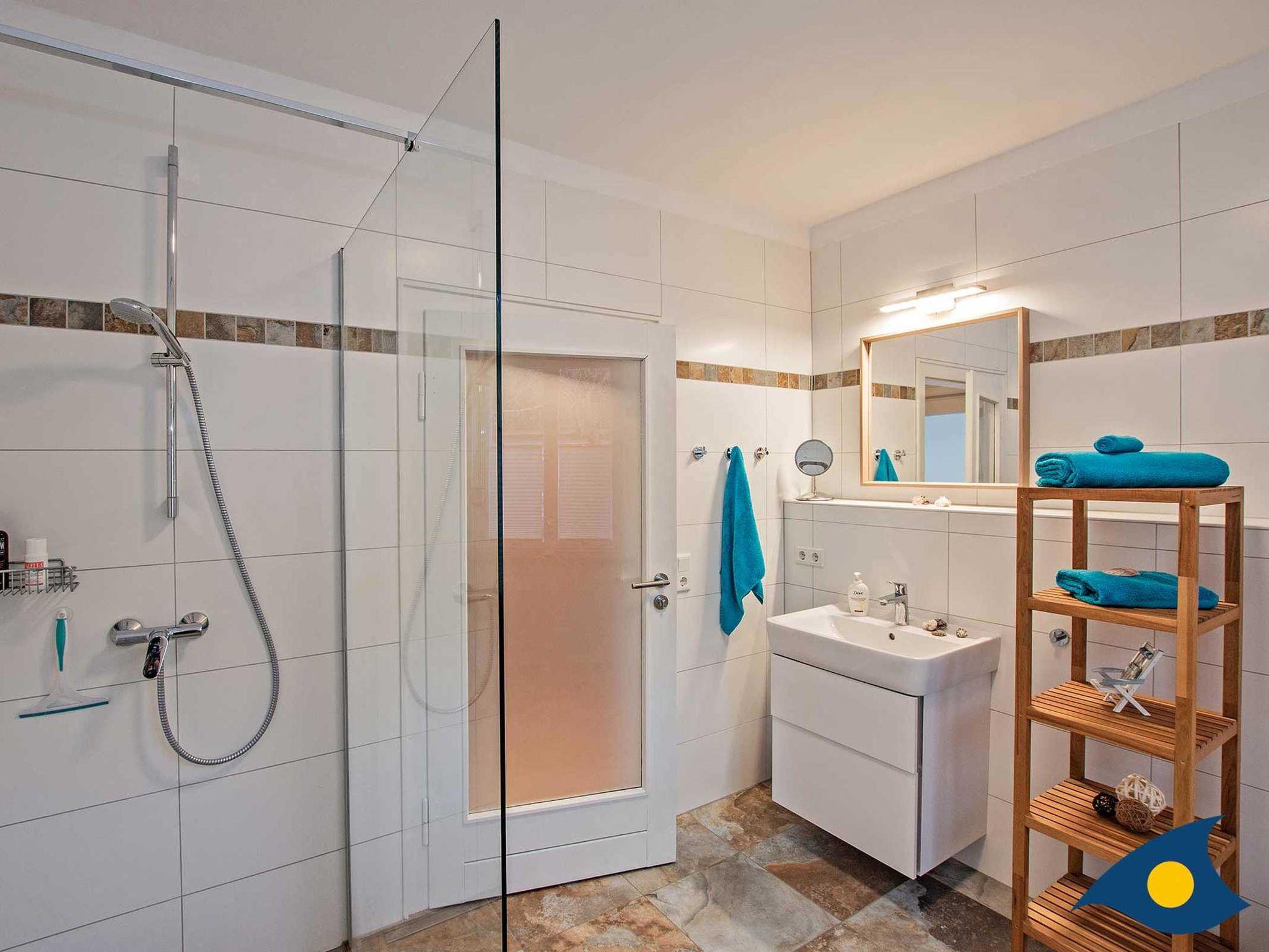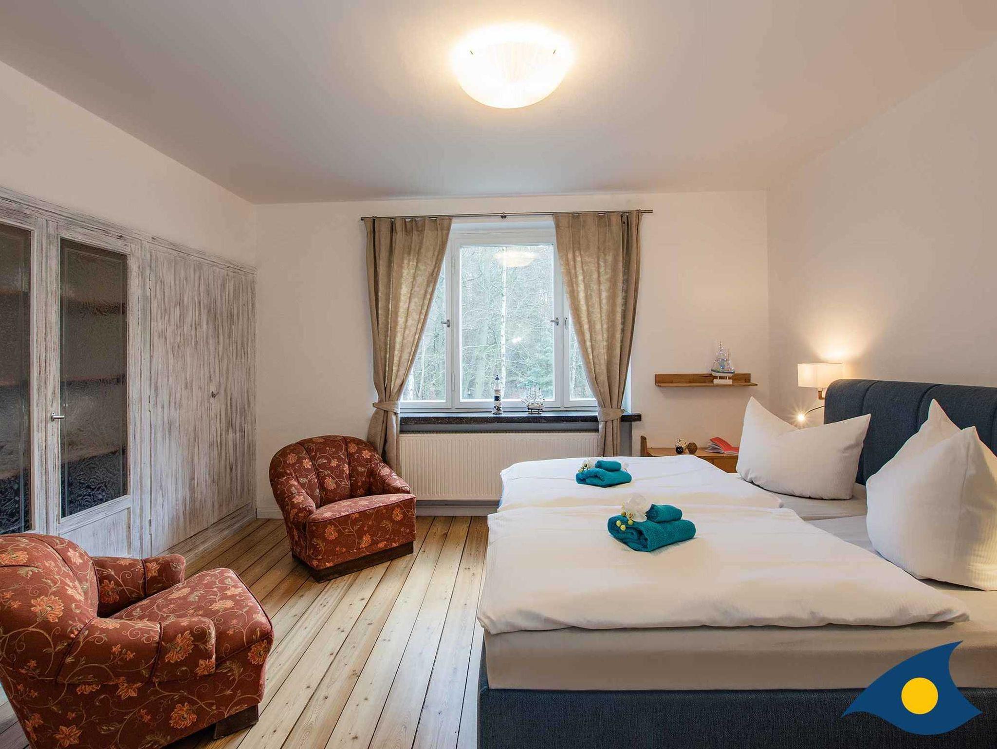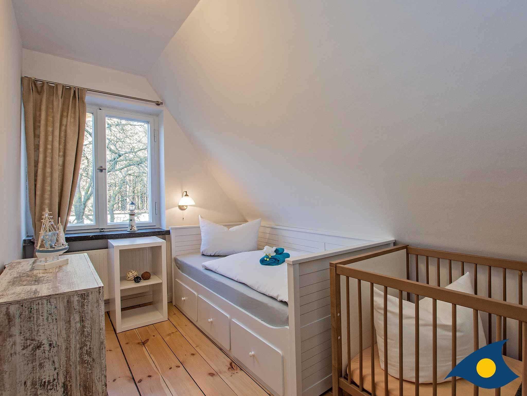 Im Obergeschoss stehen ein Doppelzimmer und zwei Einzelzimmern mit renoviertem Dielenboden zur Verfügung. In einem Einzelzimmer steht nach Wunsch auch ein Kinderbett zur Verfügung. Auch im Obergeschoss befindet sich ein hochwertiges Bad mit Dusche.