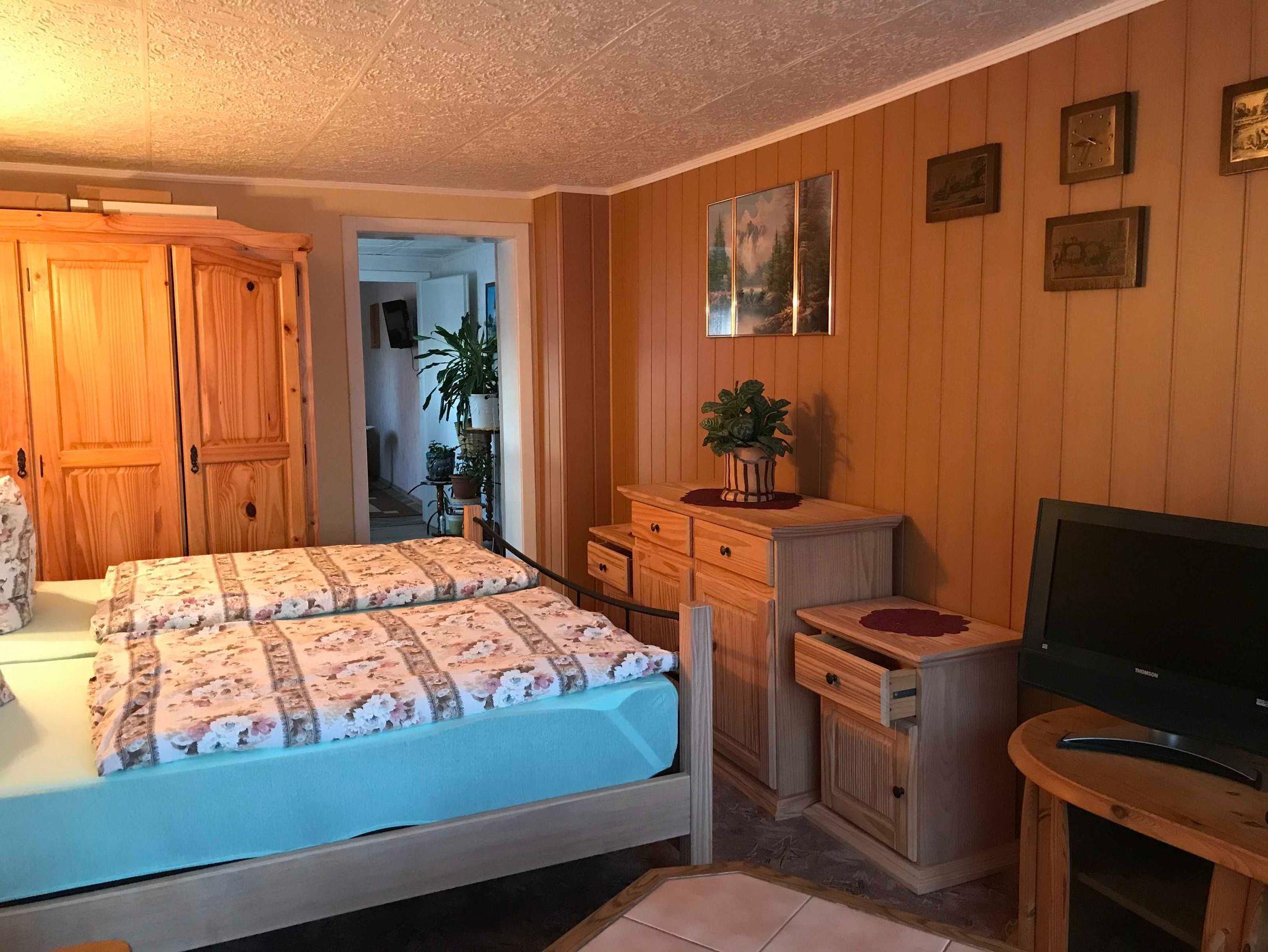 • Im Obergeschoss: kombinierter Wohn-Schlafraum (Ehebetten, zwei Beistellschränkchen, Kleiderschrank, Schrankwand, Couch (2-Sitzer), Hocker und Tisch) - durch ein zweites Zimmer mit einer Schlafcouch besteht die Möglichkeit, getrennt zu schlafen.