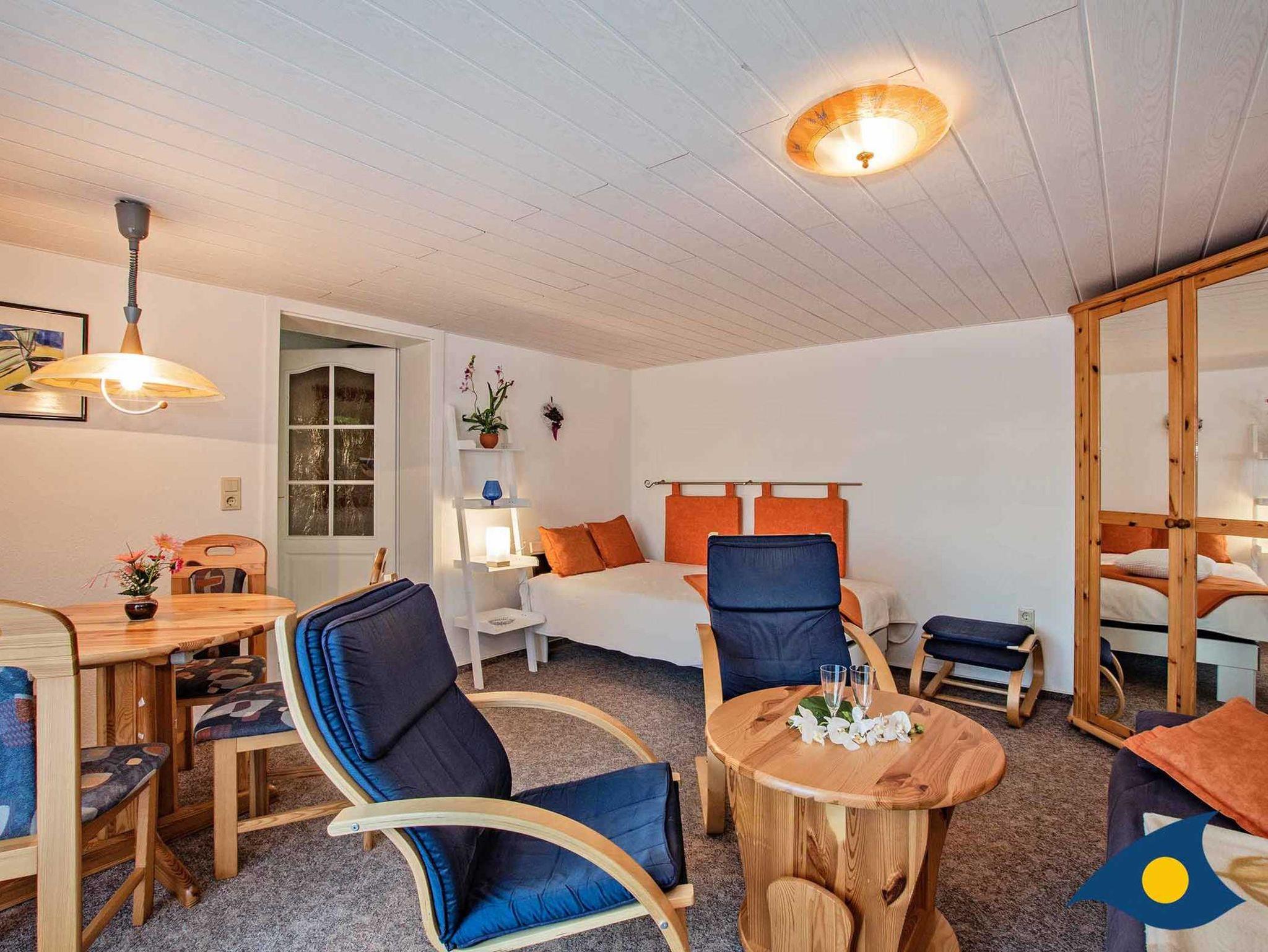 Die Parterrewohnung ist über einen separaten Eingang zu erreichen und bietet mit 50 qm Platz für 3 Personen. Im Wohnraum erwarten Sie ein kleiner Essplatz, ein gemütliches Sofa,2 Schwingsessel sowie eine Aufbettungsmöglichkeit für die 3. Person auf einer separaten Liege.