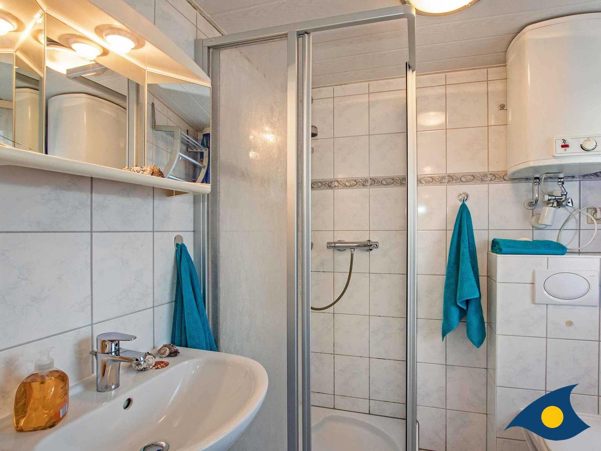 Das Badezimmer mit Fenster hält neben Handwaschbecken und WC eine Dusche bereit.