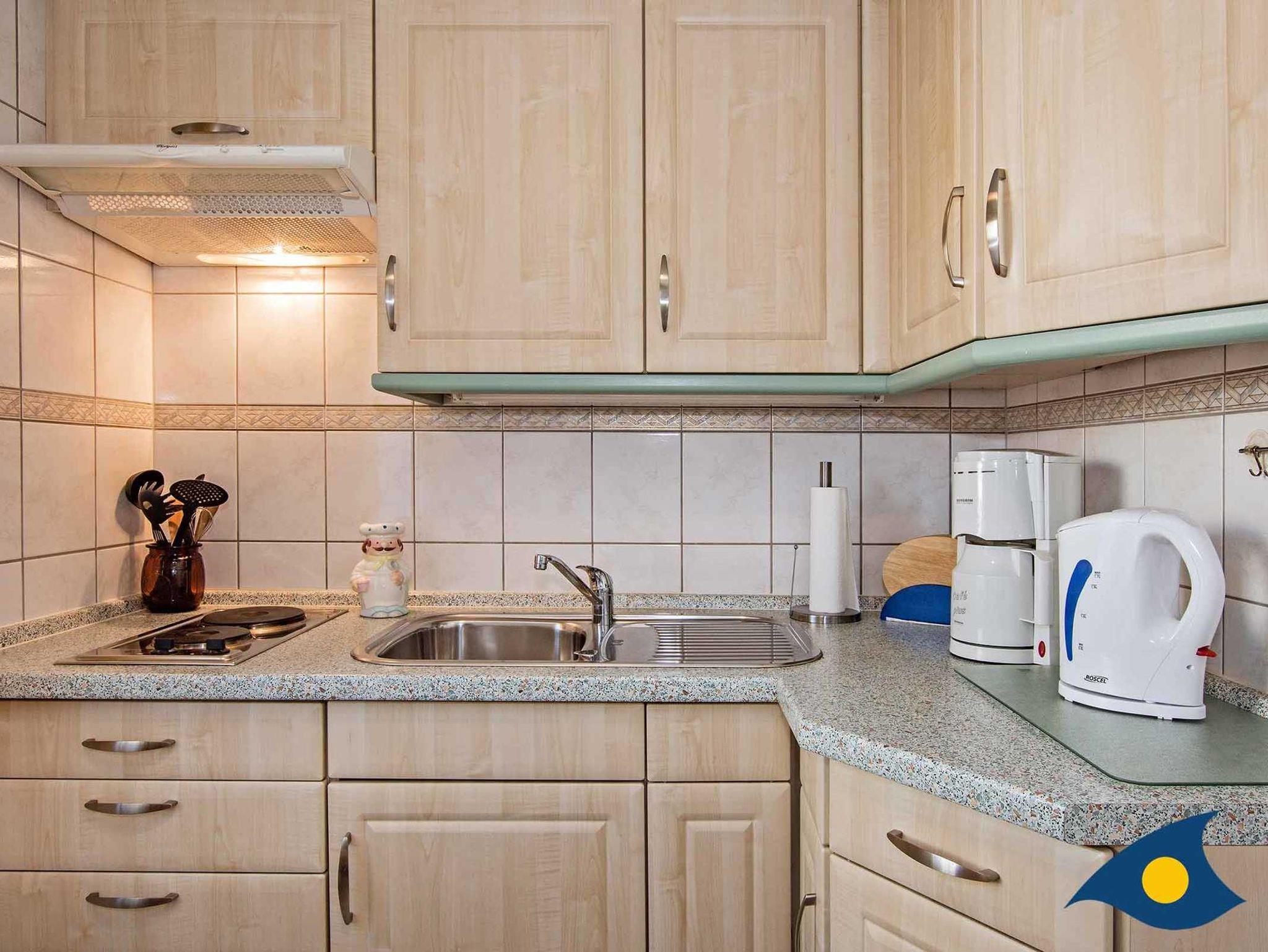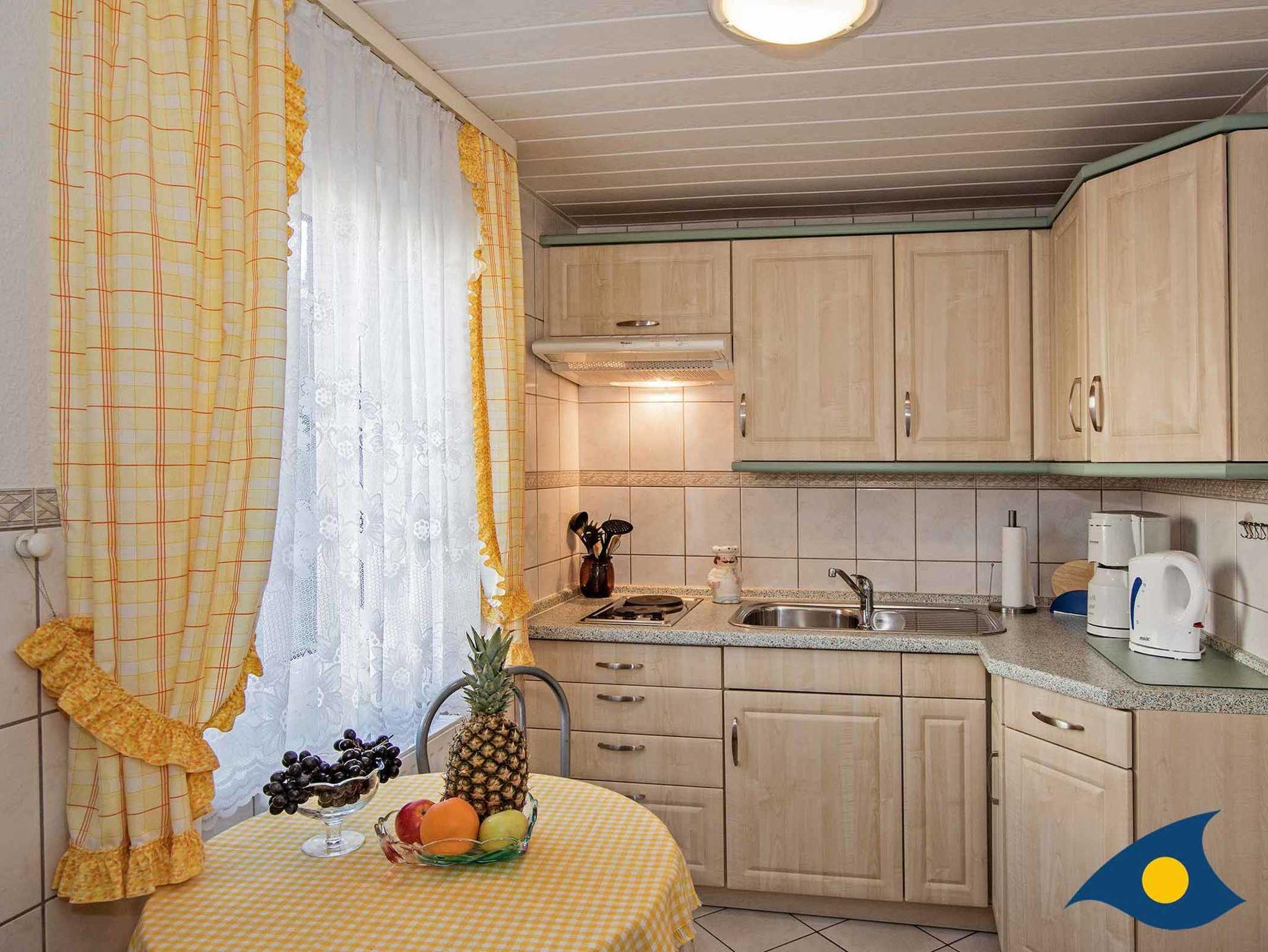 Die kleine separate und gut ausgestattete Küche wurde ebenfalls mit einem Esstisch ausgestattet. Diesen nutzen unsere Gäste für eine kleine Obstpause oder den Kaffee zwischendurch.