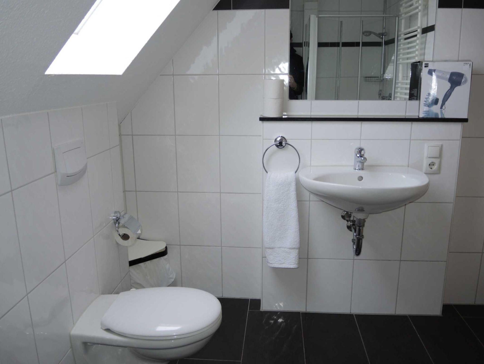 Das Badezimmer im Obergeschoss ist mit Dusche und Waschbecken ausgestattet. Zusätzlich gibt es im Erdgeschoss eine separate Gästetoilette.