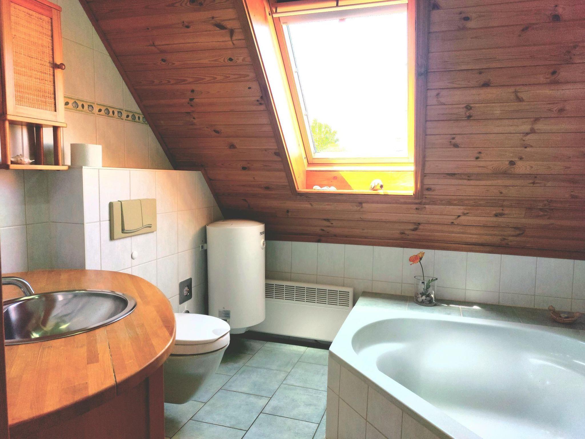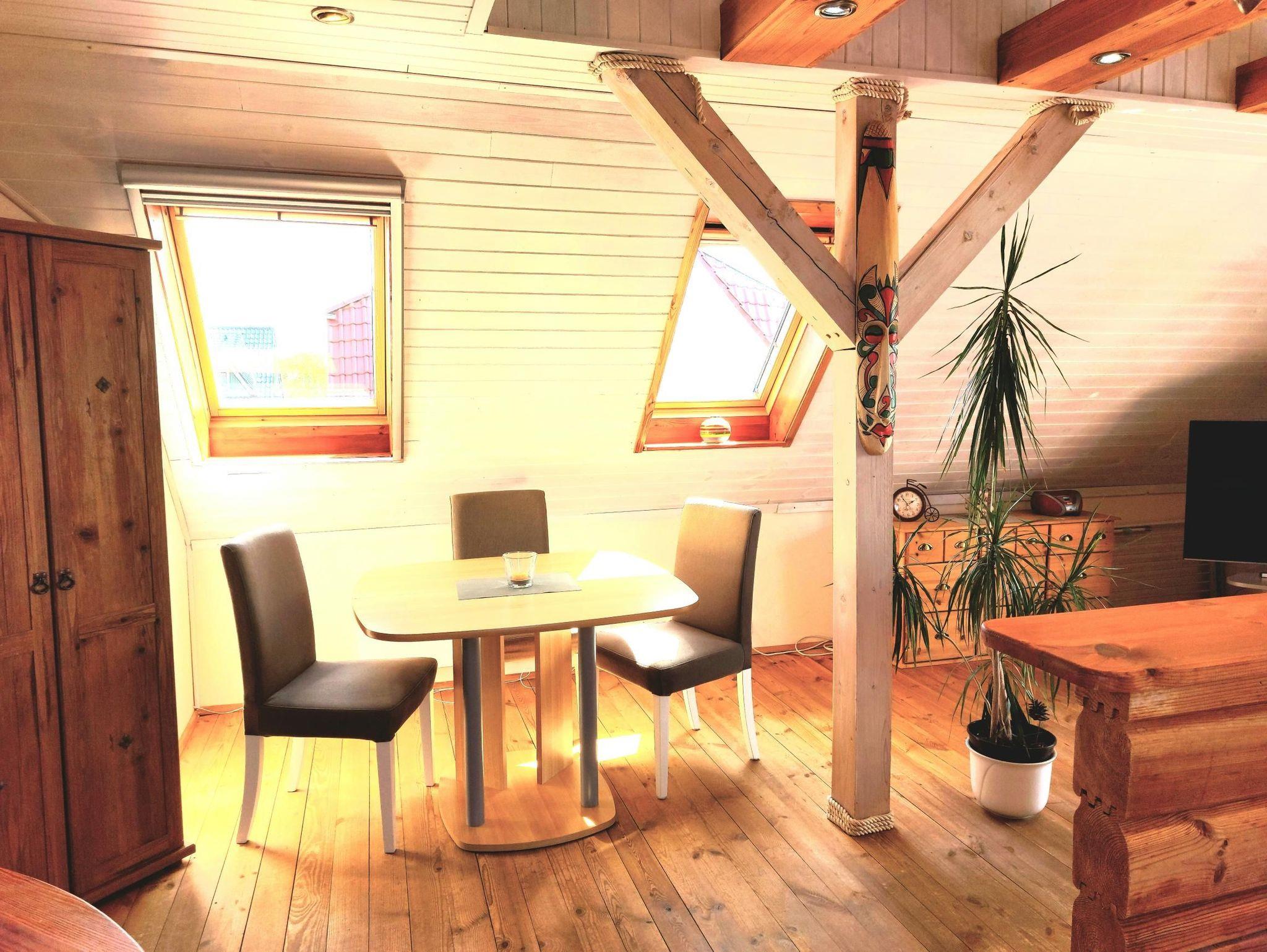 Gemütliche, modernisierte Dachgeschosswohnung im Holzblockhaus. Sie ist ausgestattet mit Fußbodenheizung und großer Sonnenterrasse zur Südseite mit Blick zum Achterwasser. Die Wohnung besteht aus einem Wohnzimmer mit offener Küche, Schlafzimmer und Bad mit Duschwanne und WC.
