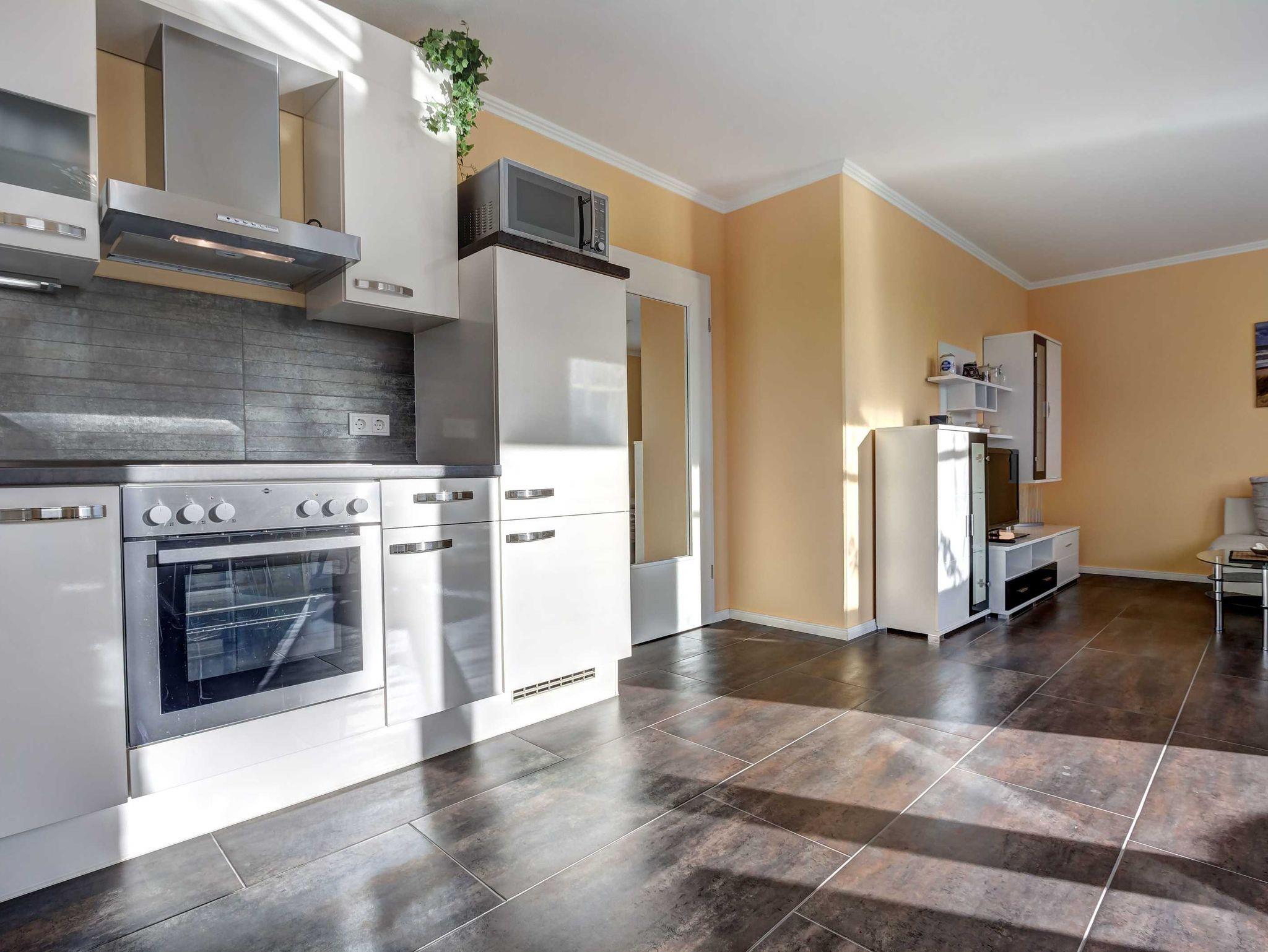 Auf 60 qm erwartet Sie in dieser ebenerdigen Wohnung ein modernes Flair mit einem großzügigen Wohn-/Essbereich mit offener Küche, Abstellraum, ein Badezimmer mit Dusche und einem Schlafzimmer mit einem Doppelbett. Im Schlafzimmer ist ein zusätzlicher Fernseher vorhanden.