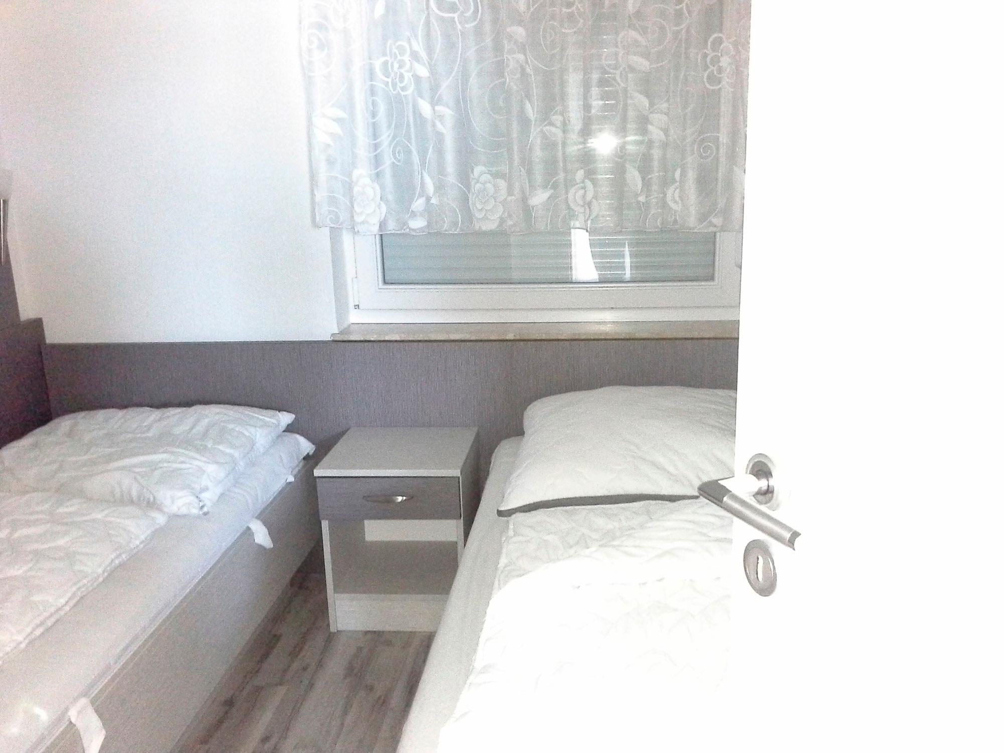 Die Ferienwohnung wurde 2014 saniert. Hier stehen Ihnen 2 Schlafzimmer zur Verfügung. In dem einem Zimmer befindet sich ein Doppelbett 180x200 cm und im anderen Zimmer sind 2 getrennt stehende Betten. Die Möbel sind von einem Tischler in hellem Design angefertigt. Eine ausklappbare Schlafcouch befindet sich im Wohnraum.