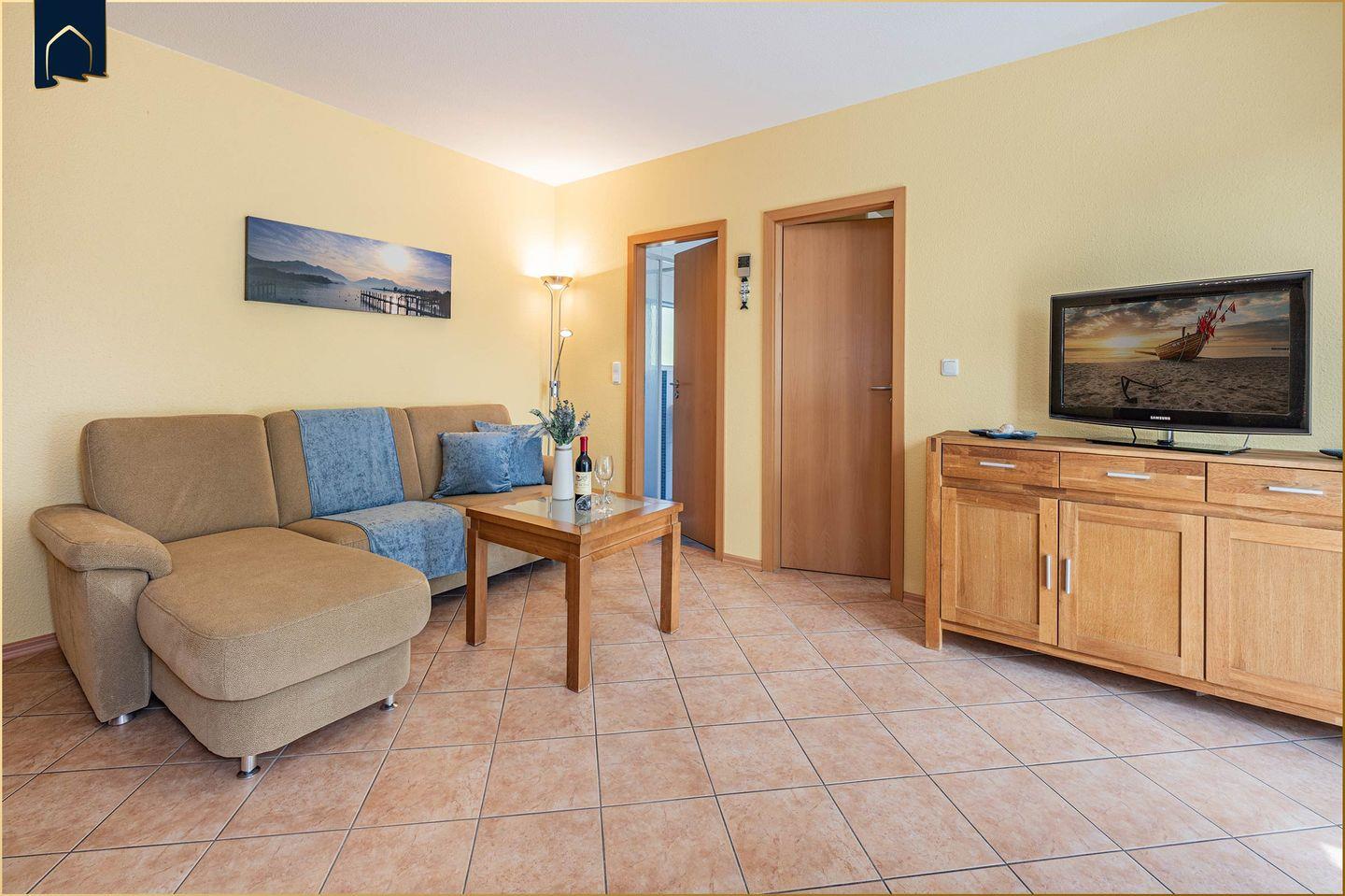 Der offene Wohnbereich bietet Ihnen alles, was Sie für einen angenehmen Aufenthalt benötigen. Die gut ausgestattete Küche ermöglicht es Ihnen, mühelos leckere Mahlzeiten zuzubereiten, die Sie am angrenzenden Esstisch gemeinsam genießen können. Das Wohnzimmer lädt mit einem großen Sofa zum Entspannen ein, das sich abends in eine Schlafmöglichkeit verwandeln lässt. Vom Wohnzimmer aus gelangen Sie direkt auf den Balkon, der mit Tisch und Stühlen ausgestattet ist – perfekt, um die frische Meeresluft zu genießen oder den Tag bei einem Frühstück im Freien zu beginnen. Das separate Schlafzimmer ist mit einem bequemen Doppelbett ausgestattet, in dem Sie erholsamen Schlaf finden. Für Ihre Urlaubsgarderobe gibt es genügend Stauraum, sodass alles seinen Platz findet.