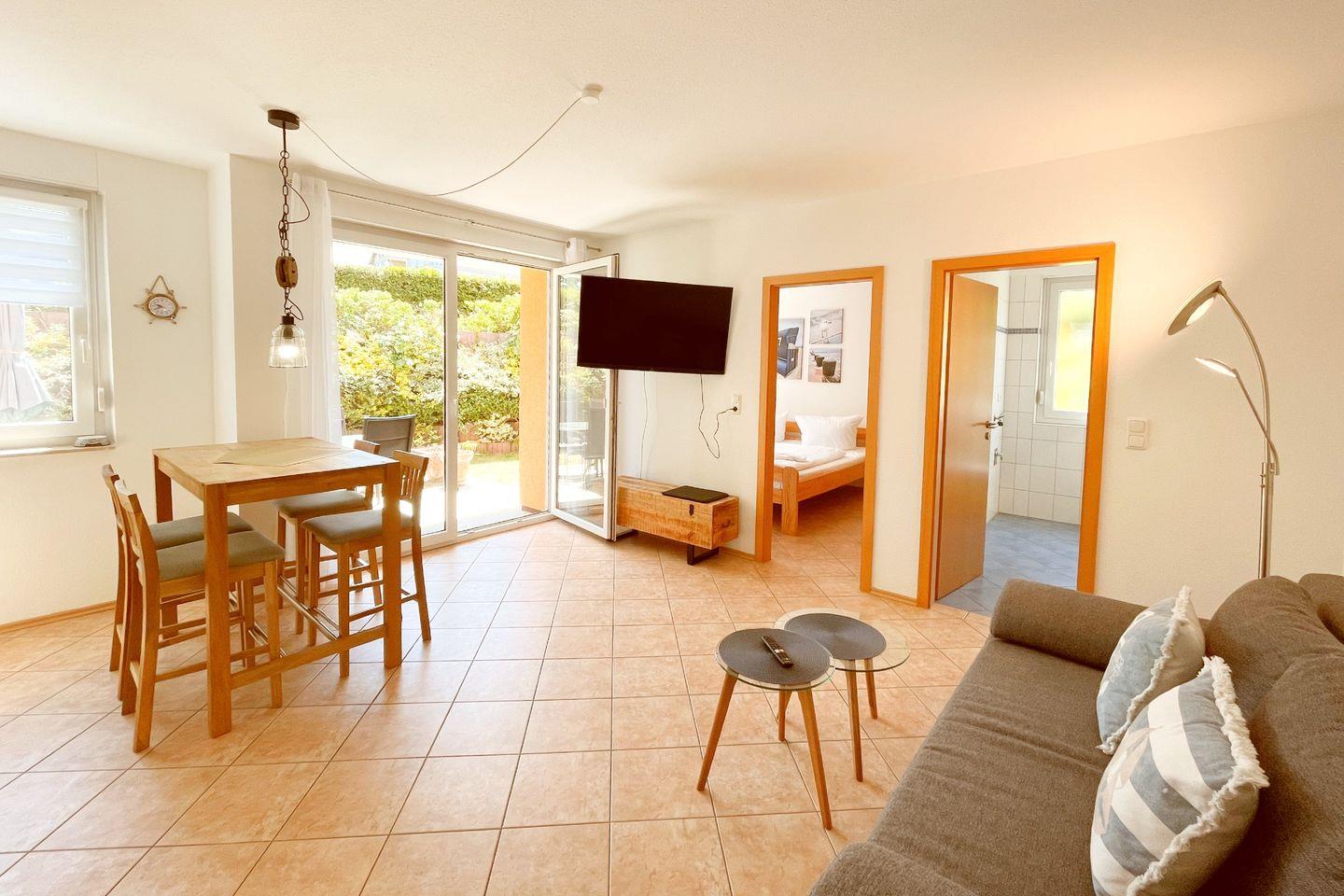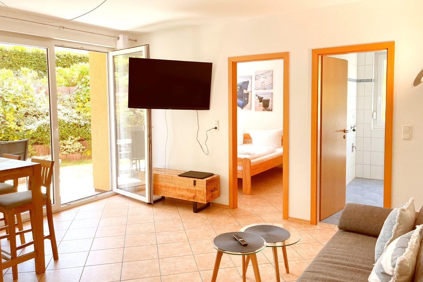 Die Wohnung erstreckt sich über eine Fläche von 44 m² und bietet Platz für bis zu drei Personen. Sie verfügt über ein Schlafzimmer, ein modernes Badezimmer und ein lichtdurchflutetes Wohnzimmer, das einladend und komfortabel gestaltet ist. Die offene Küche wurde mit modernen Geräten ausgestattet, darunter ein Cerankochfeld, ein Backofen, eine Spülmaschine sowie eine Mikrowelle – alles, um Ihnen den Aufenthalt so angenehm wie möglich zu gestalten. Für gesellige Mahlzeiten ist der Essbereich ideal, und die Sofaecke lädt zum Entspannen nach einem aufregenden Tag an der Ostsee ein.