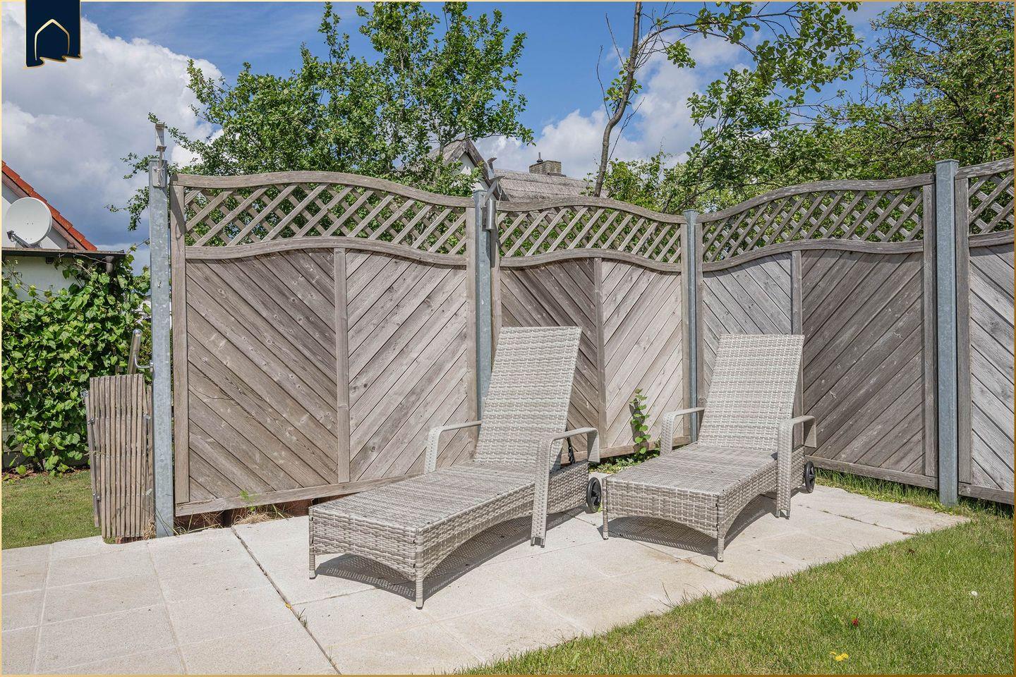 Das eingezäunte Grundstück mit rund 620?m² bietet viel Privatsphäre und eignet sich ideal für Familien mit Kindern oder Haustieren. Sonnenliegen, Gartenmöbel, Sonnenschirm und ein Grill machen den Außenbereich zu einem echten Highlight. Fünf private Stellplätze, ein Carport, WLAN und Waschmaschine/Trockner sorgen für zusätzlichen Komfort.