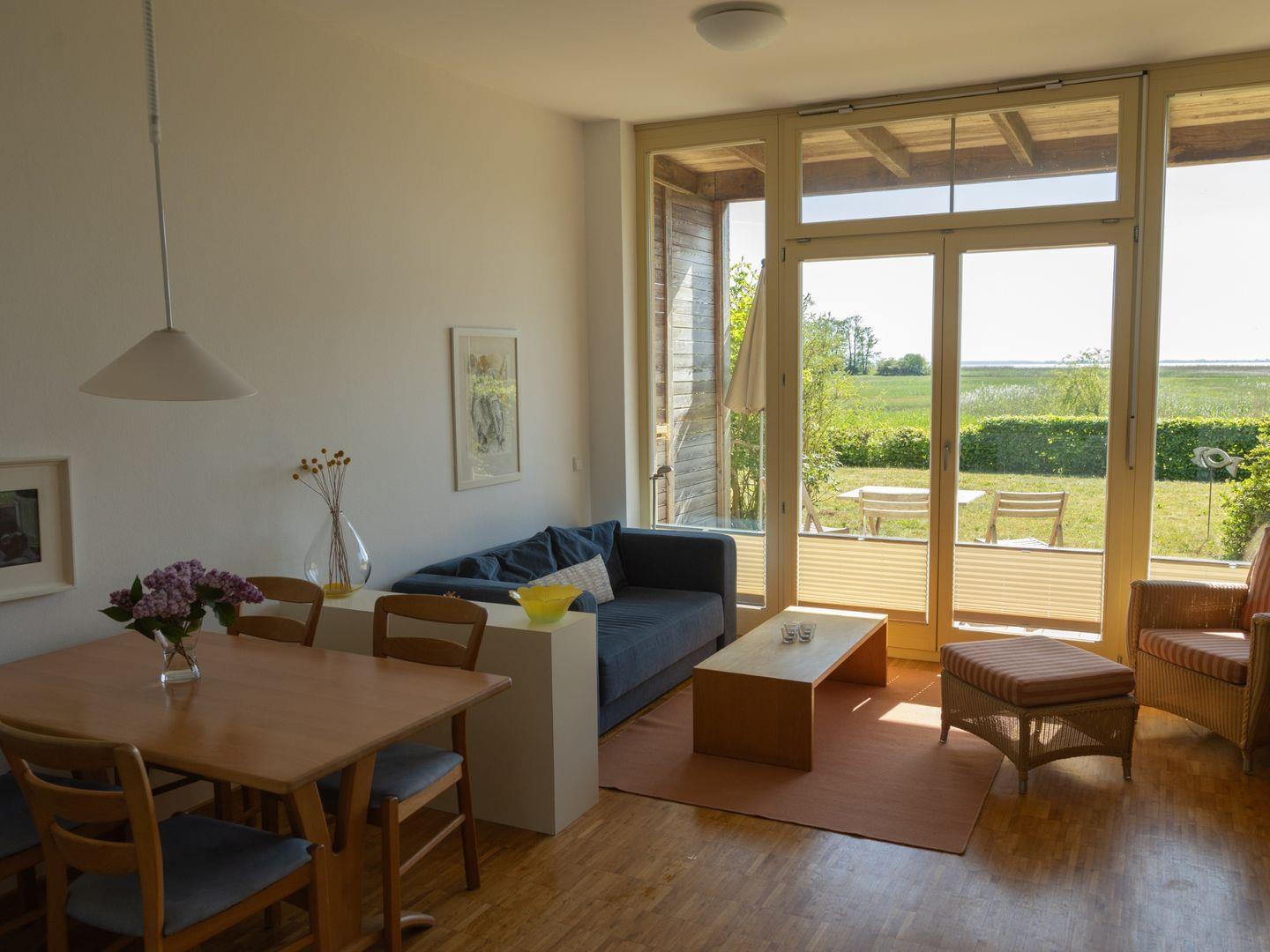 Neben dem wunderschönen weiten Blick auf das Achterwasser und Wiesengrün finden Besucher eine behagliche und hochwertig eingerichtete Wohnung. Bilder und Fotografien norddeutscher Künstler, Bücher und CDs tragen zum Wohlbefinden bei.