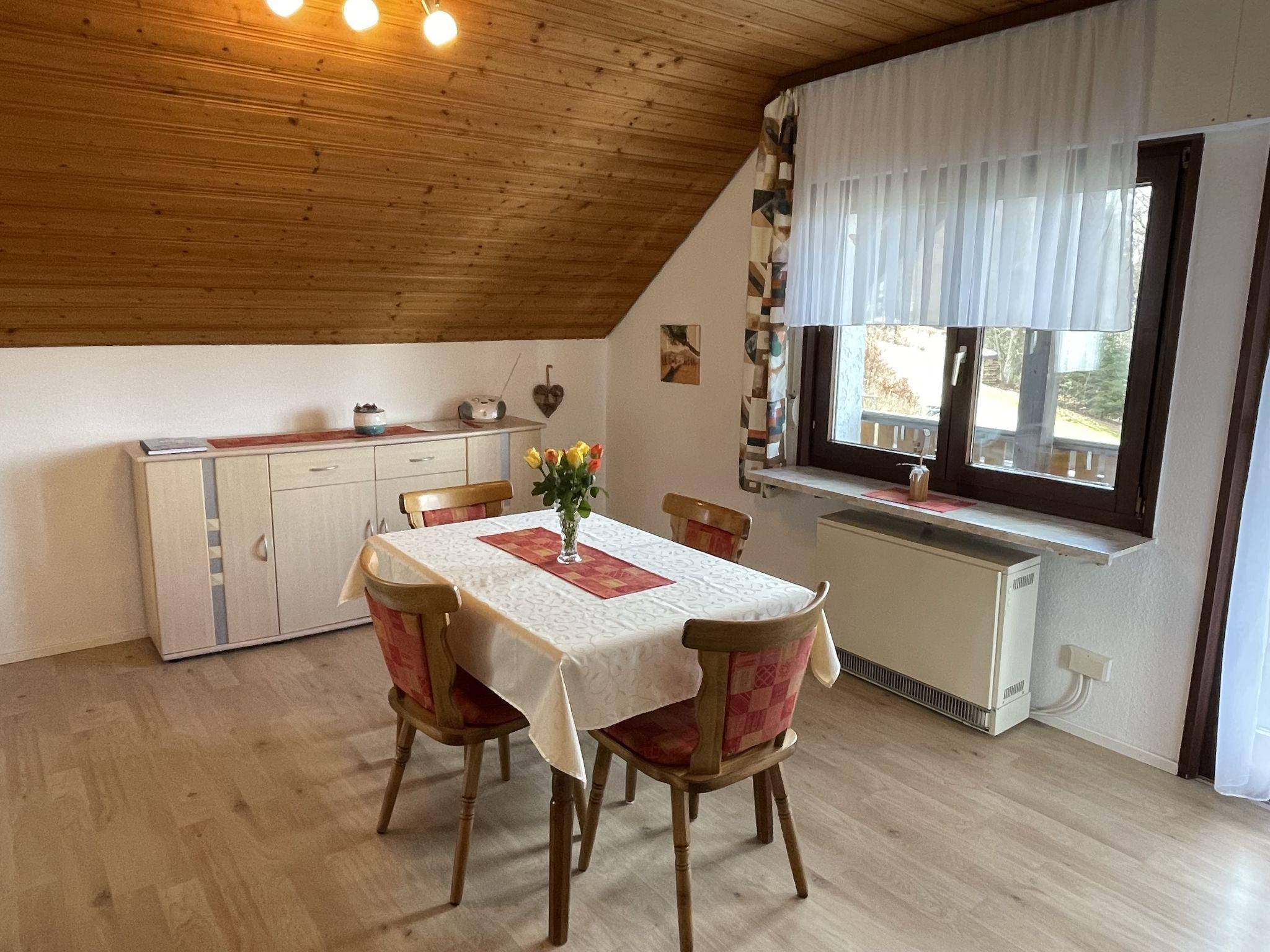 "Wartbuck", 2-room apartment 60 m2 on 1st floor. With sloping ceilings, beautiful and cosy furnishings: living/sleeping room with sloping ceilings with 1 double sofabed, Scandinavian wood stove, dining table, satellite TV and CD-player. Exit to the balcony. 1 room with sloping ceilings with 1 double bed. With sloping ceilings kitchen (oven, dishwasher, 4 ceramic glass hob hotplates, toaster, kettle, freezer, electric coffee machine) with dining table. Bath/shower/WC. Electric heating. Balcony. Balcony furniture. Facilities: Internet (WiFi, free). Please note: non-smokers only. Smoke alarm. Maximum occupancy: 4 adults, including children. The landlord does not accept bookings with more than 4 adults.