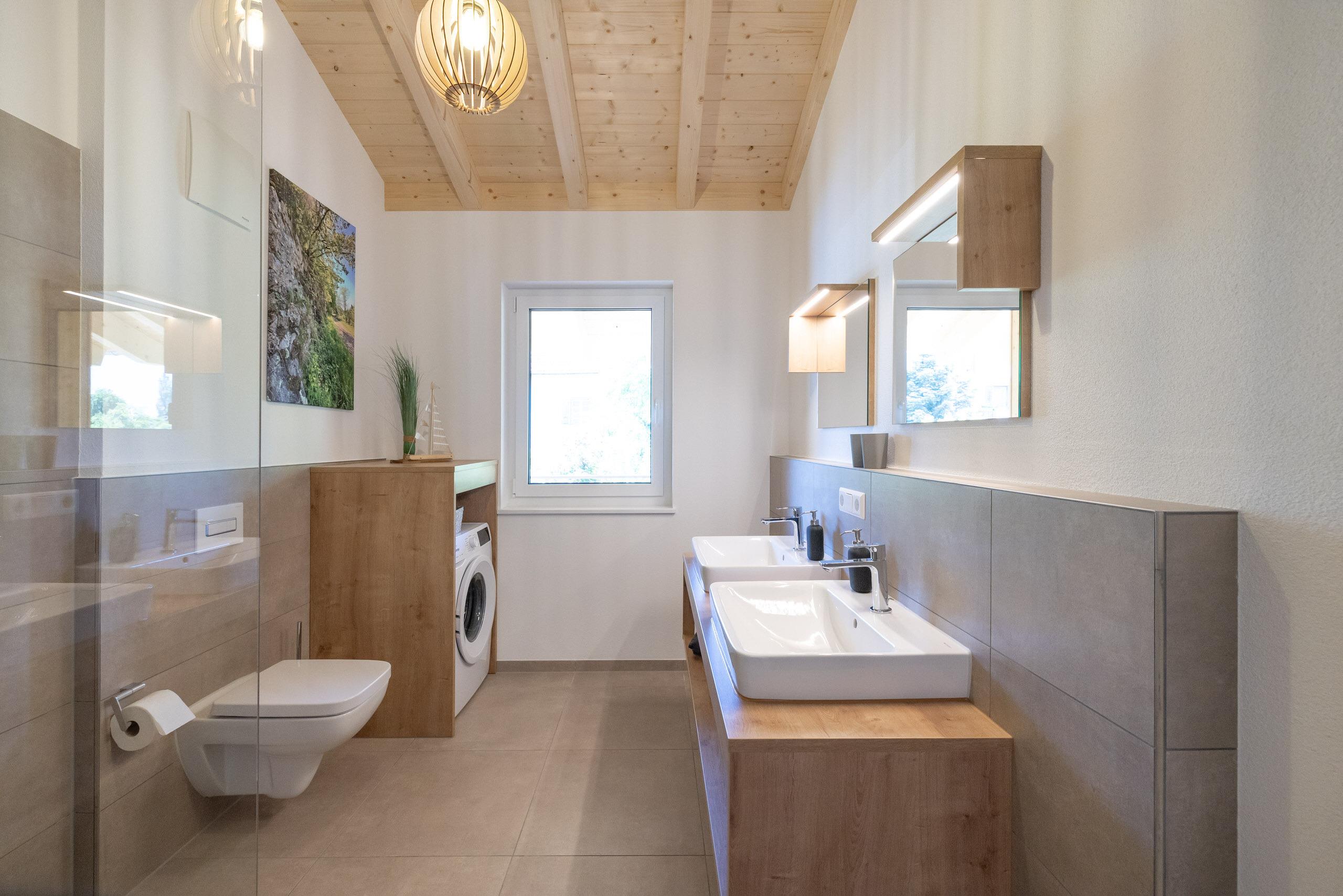 - ein Badezimmer mit bodenebener Dusche, WC und Haartrockner