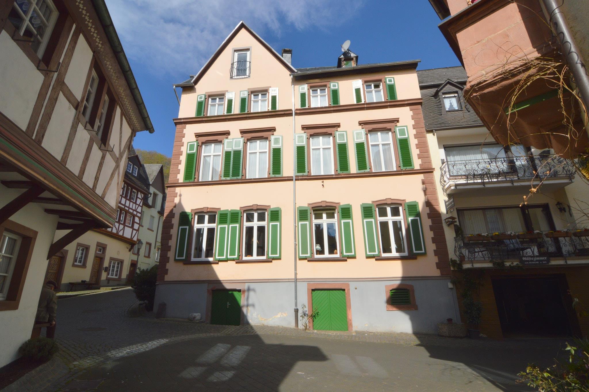 Denne bemærkelsesværdige bolig med 9 soveværelser i hjertet af Ürzig er gennemsyret af lokal historie og tilbyder en sjælden mulighed for store grupper til at opleve Moseldalen i total komfort. Huset, der tidligere var et boutiquehotel, er blevet omhyggeligt omdannet til et privat tilflugtssted, der bevarer sin historiske charme, samtidig med at det tilbyder moderne faciliteter til op til 18 gæster. Hvert soveværelse har luksusen af et ensuite badeværelse, hvilket sikrer maksimal privatliv, mens fællesområderne - forankret af en hyggelig pejs - danner den perfekte baggrund for aftensammenkomster efter en dag med udforskning af vinmarkerne. Ejendommen er beliggende i det historiske centrum af en af Mosels mest maleriske landsbyer, berømt som filmstedet for tv-serien "Moselbrück". Kun få skridt væk finder du gamle bindingsværkshuse og de snoede gader, der giver Ürzig sin tidløse karakter. For dem, der rejser i bil, er der praktiske aflæsningspladser lige foran huset, med rigelig gratis parkering kun 80 meter væk langs den naturskønne flodbred. Friluftsentusiaster og vinelskere vil finde sig selv i et sandt paradis. Huset fungerer som et perfekt udgangspunkt for vandrestier til Moselsteig og den familievenlige Rødstjertrute, der begge tilbyder panoramaudsigt over floden. Du kan tilbringe eftermiddagene med at besøge Ürzig Krydderihave - en middelhavsoase med 15.000 planter - eller udforske det ældste solur på Mosel. Med de termiske bade i Traben-Trarbach kun 15 minutter væk og Triers romerske historie inden for rækkevidde, er dette storslåede hjem en uovertruffen base for et dybt dyk ned i tysk vinkultur og -arv.