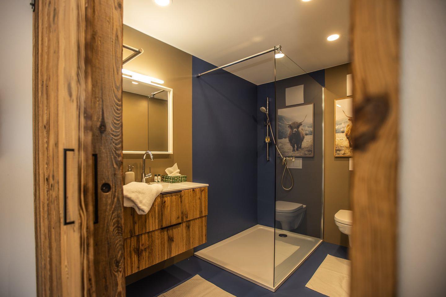Ein besonderes Highlight ist die gemütliche Kinderschlafgelegenheit auf der Empore (120 x 200 cm), liebevoll aus Südtiroler Altholz gefertigt. Erreichbar über eine Leiter, ist sie ein echtes Abenteuer – geeignet für Kinder ab 6 Jahren. Das moderne Badezimmer mit fast ebenerdiger Dusche und WC rundet das Angebot ab.