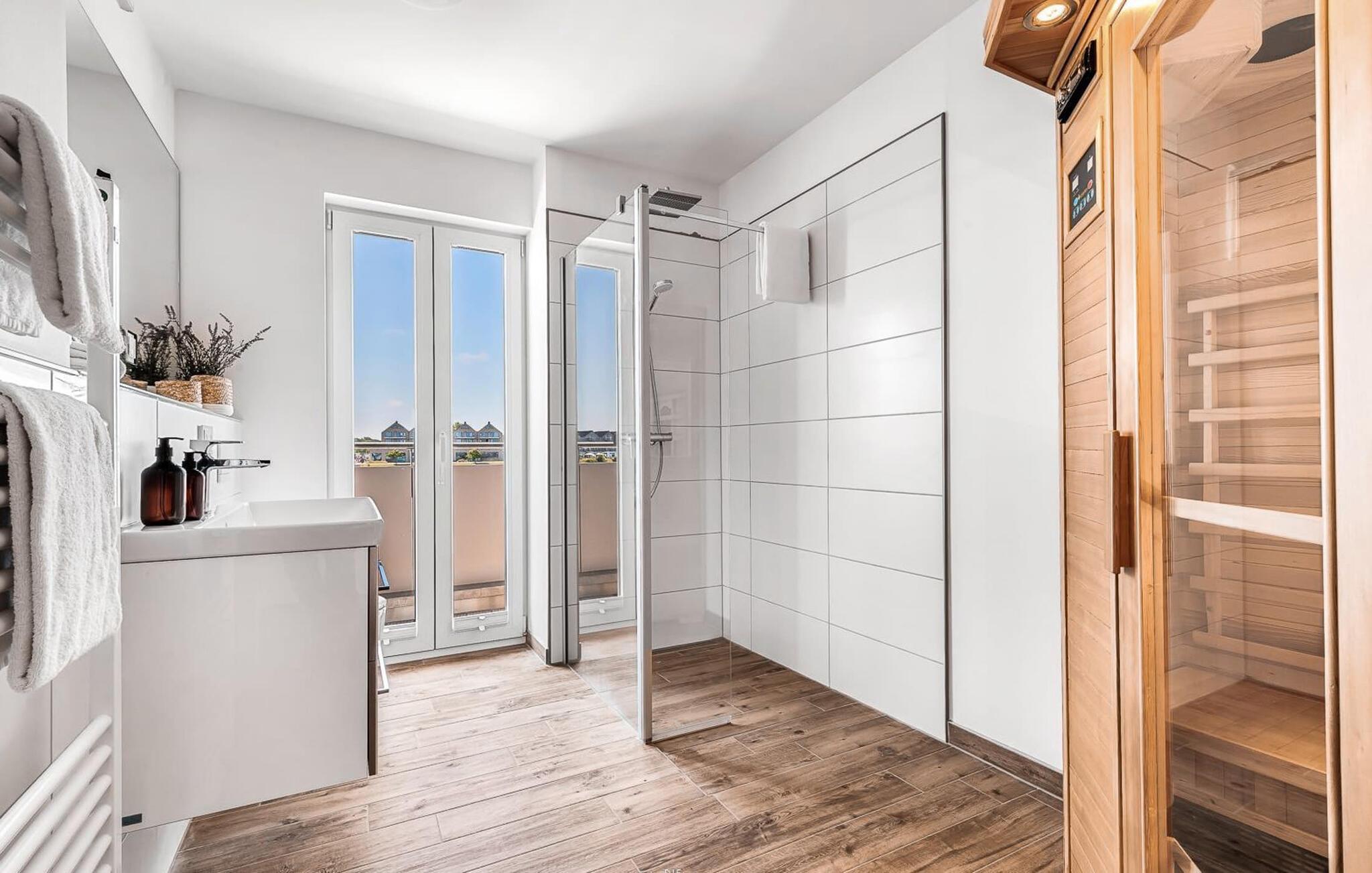 Ud over alt det andet, er der en bruser på gulvniveau og en infrarød kabine. Glæd jer til at sidde her og få varmen efter nogle timer ude i blæsevejret eller en lang dag på stranden.
