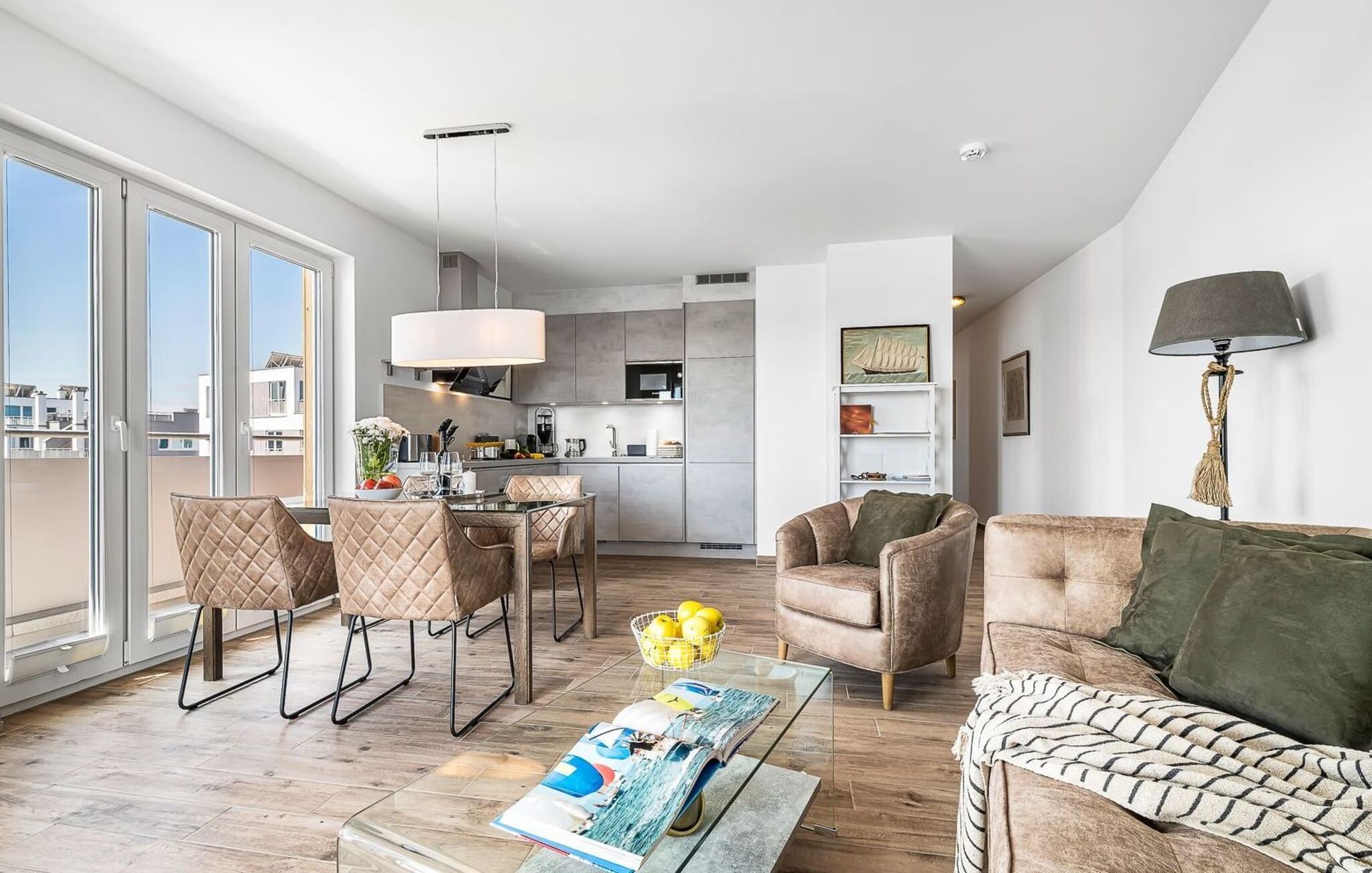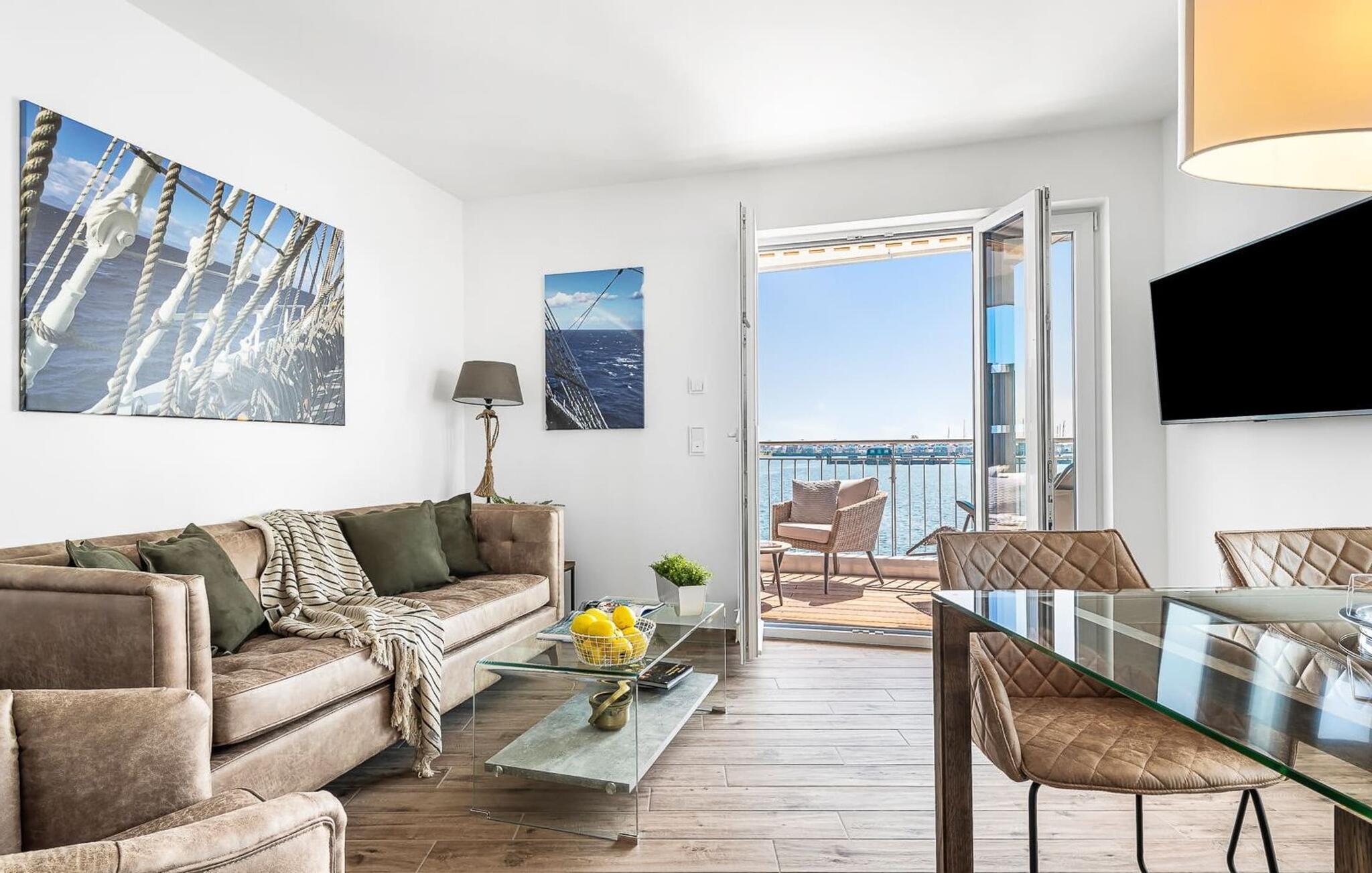 Den åbne stue og det integrerede køkken giver en rummelig følelse. Fra stuen er der udgang til den store terrasse med udsigt over havnebassinet mod Østersøen. Nyd de spektakulære solopgange her med morgenkaffen ved hånden. Udsigten over havnen, skibene og Østersøen længere ude giver følelsen af at være admiral på en lang rejse for en stund.