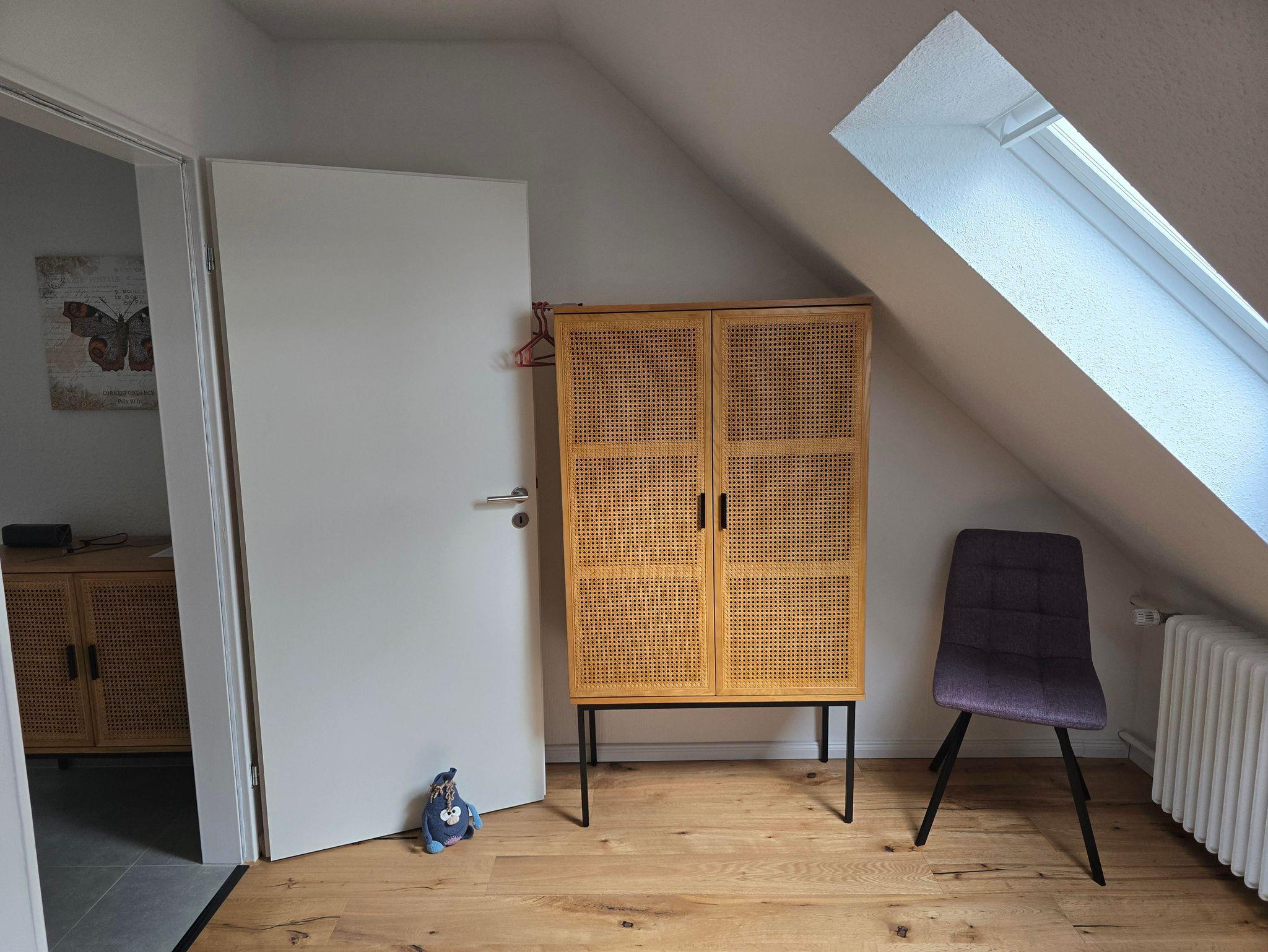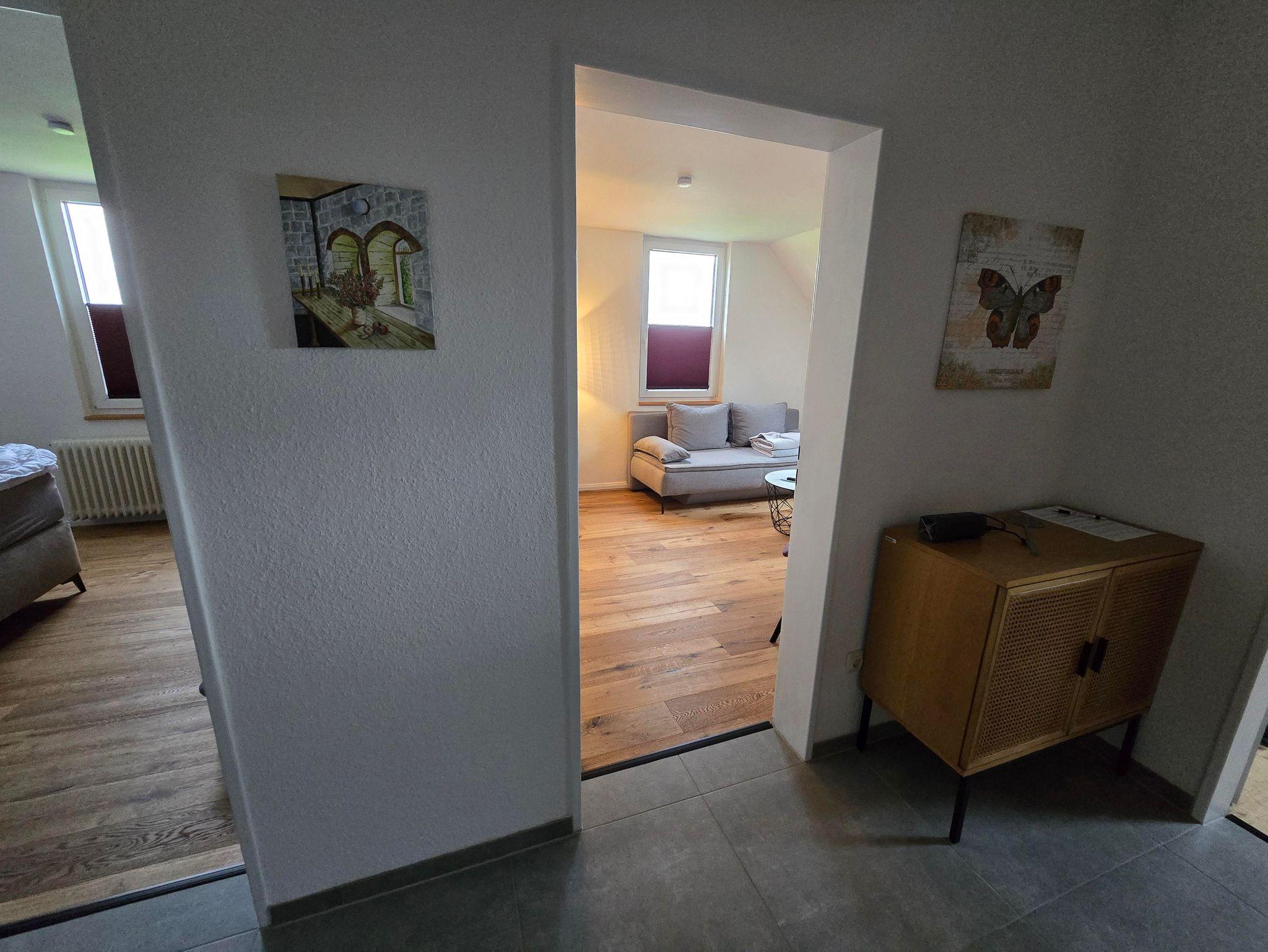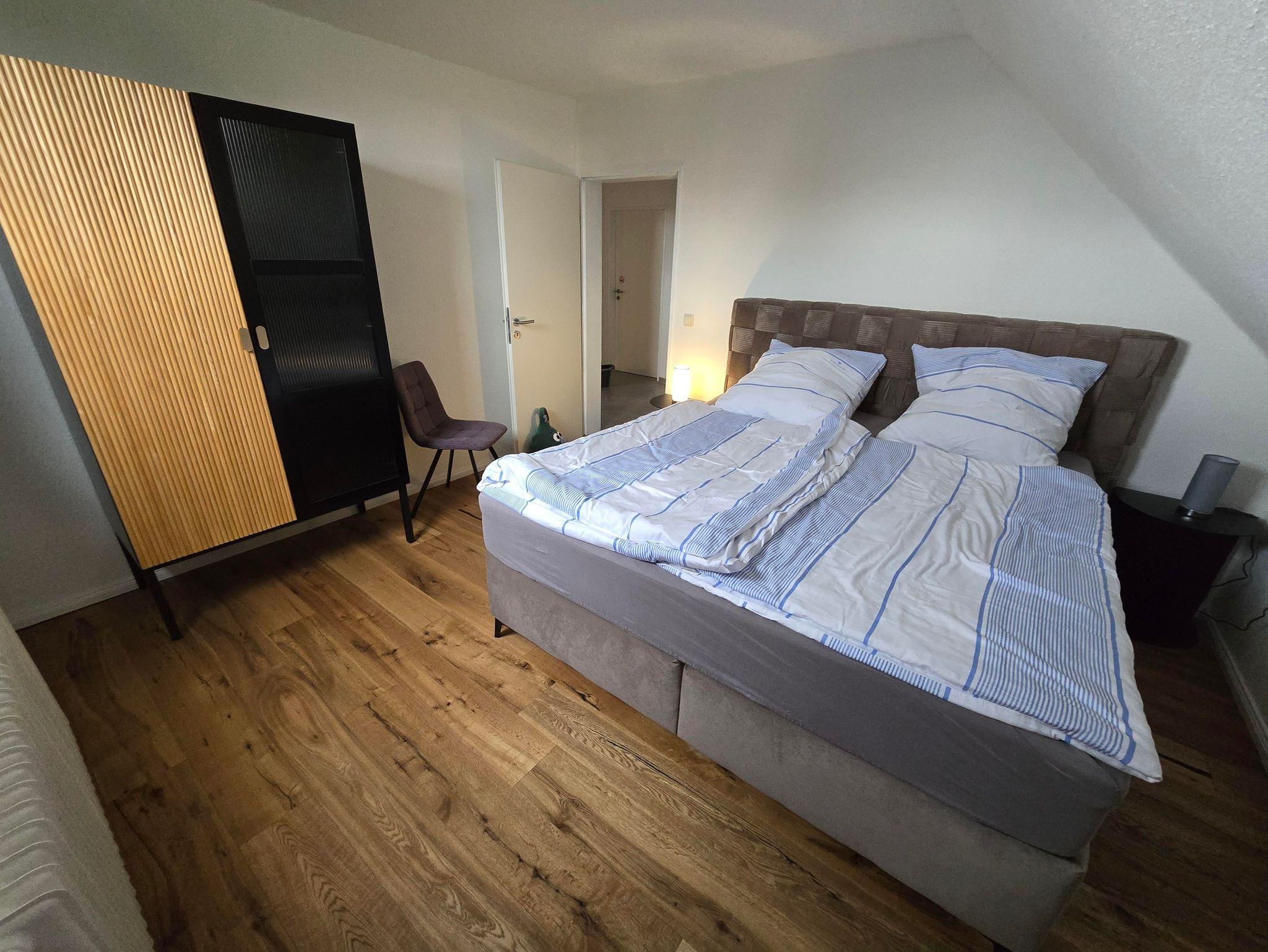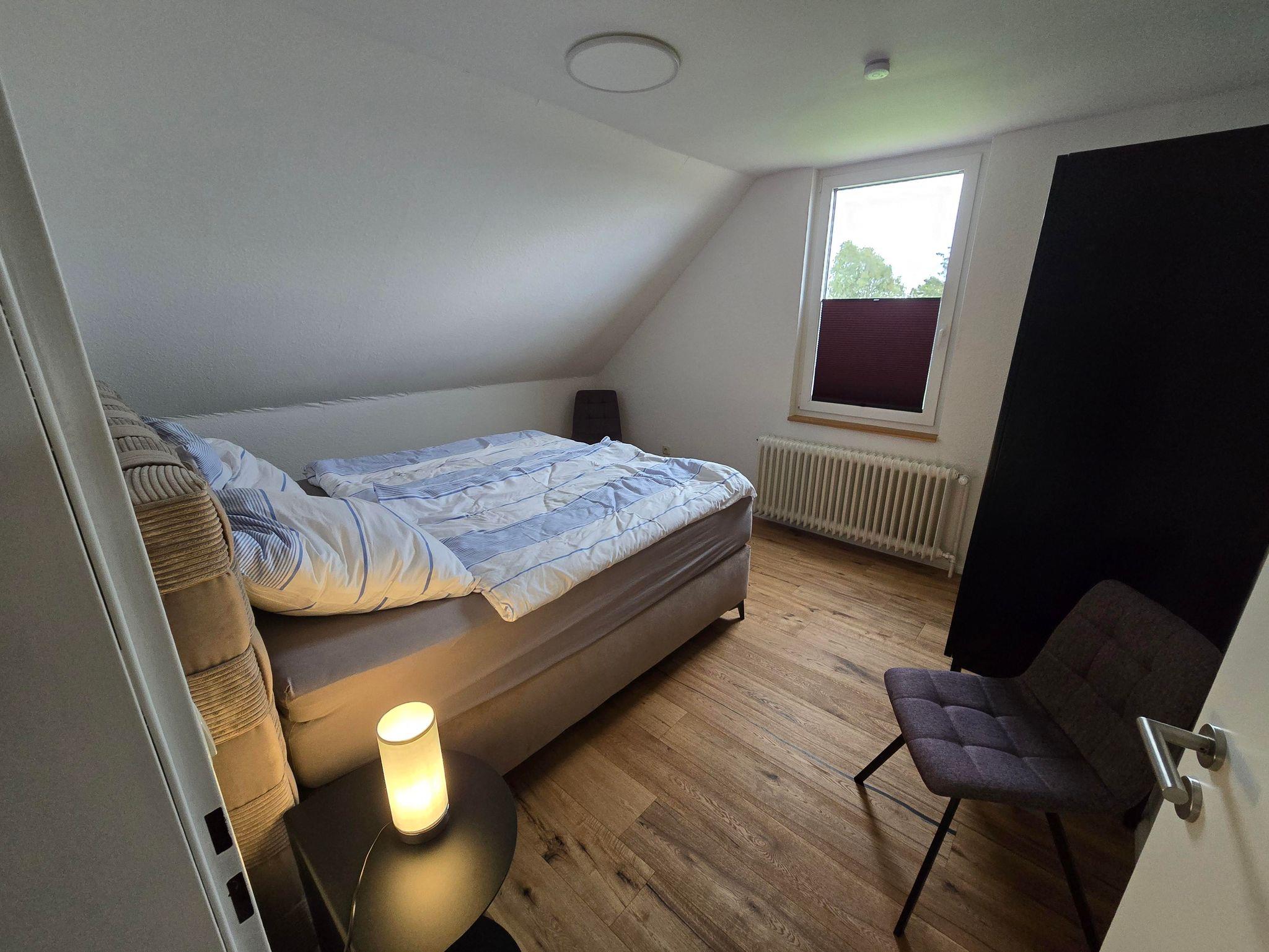 Unsere Ferienwohnung im Dachgeschoss (ca. 70qm). Ein großzügiges Wohnzimmer (Ausziehsofa) und zwei Schlafzimmer (Elternschlafzimmer mit großem Doppelbett und ein Kinderschlafzimmer mit einem Einzelbett) bieten bis zu 4 erwachsenen Personen ausreichend Platz für einen erholsamen Urlaub. Gemütlich kann man den Abend mit der ganzen Familie vor dem 55 Zoll großen TV ausklingen lassen.