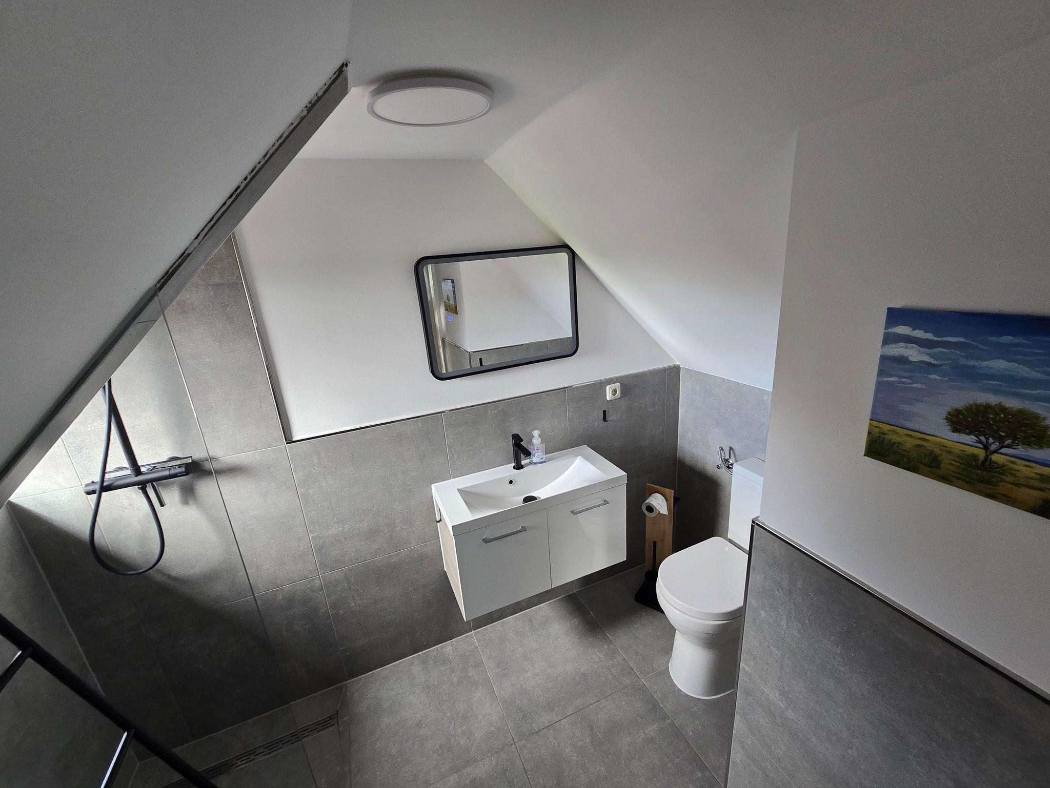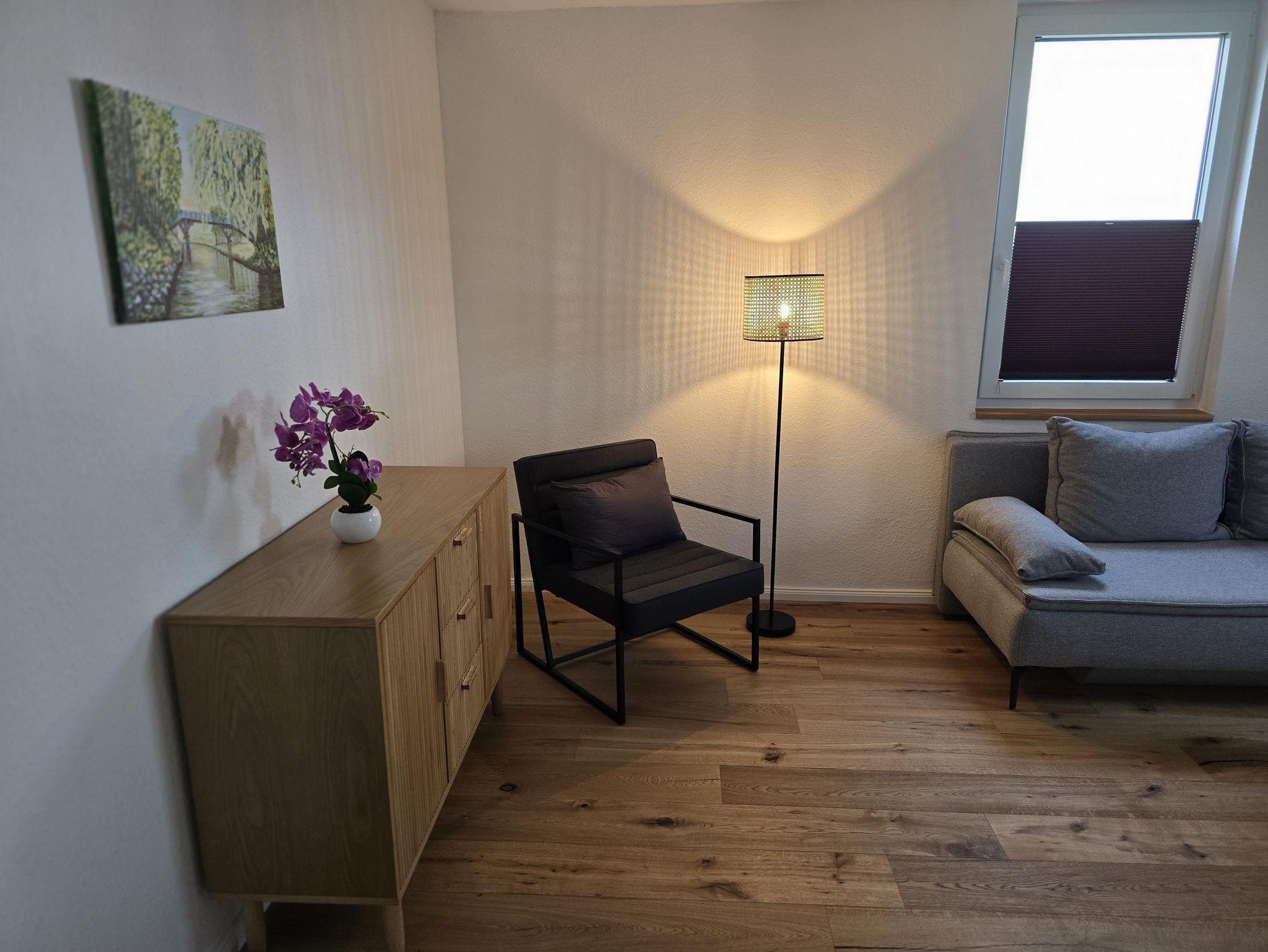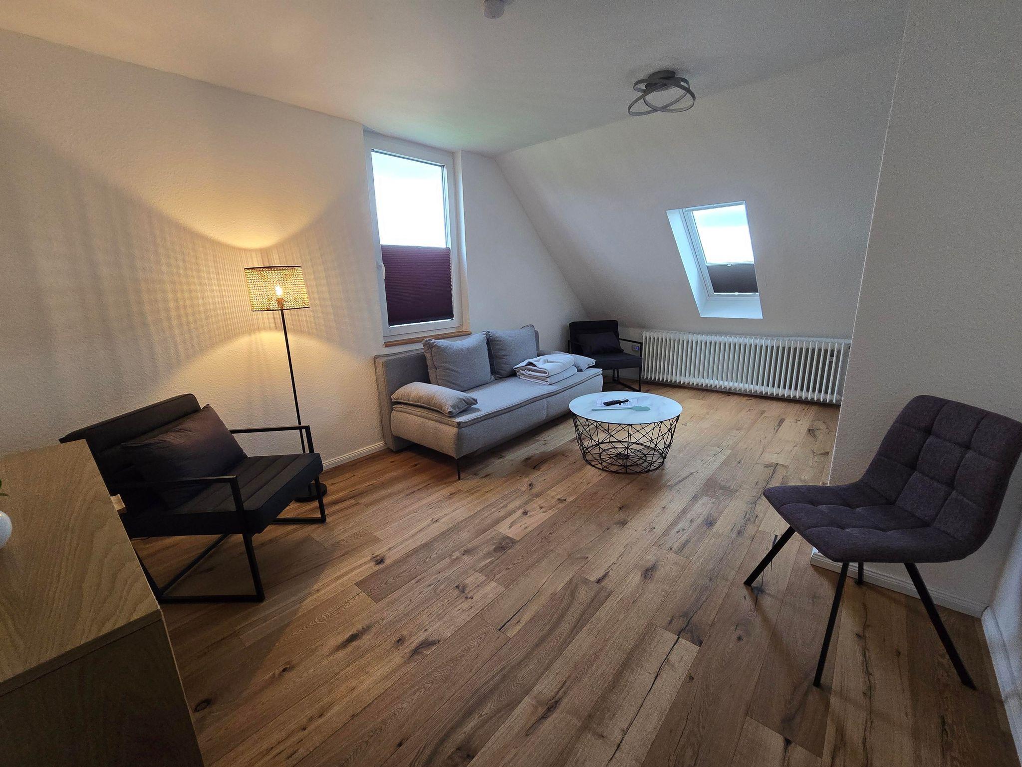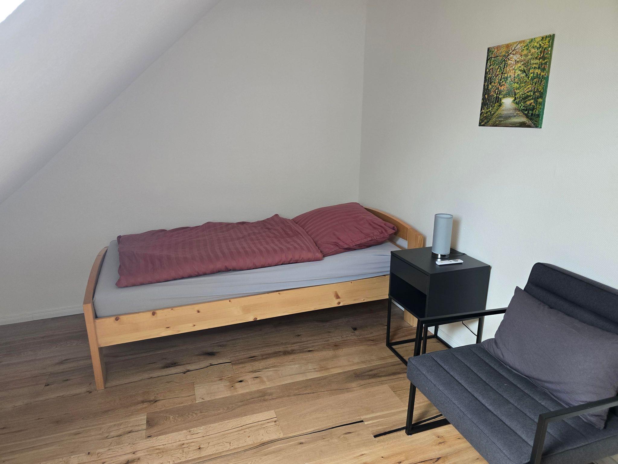 Unsere Ferienwohnung im Dachgeschoss (ca. 70qm). Ein großzügiges Wohnzimmer (Ausziehsofa) und zwei Schlafzimmer (Elternschlafzimmer mit großem Doppelbett und ein Kinderschlafzimmer mit einem Einzelbett) bieten bis zu 4 erwachsenen Personen ausreichend Platz für einen erholsamen Urlaub. Gemütlich kann man den Abend mit der ganzen Familie vor dem 55 Zoll großen TV ausklingen lassen.