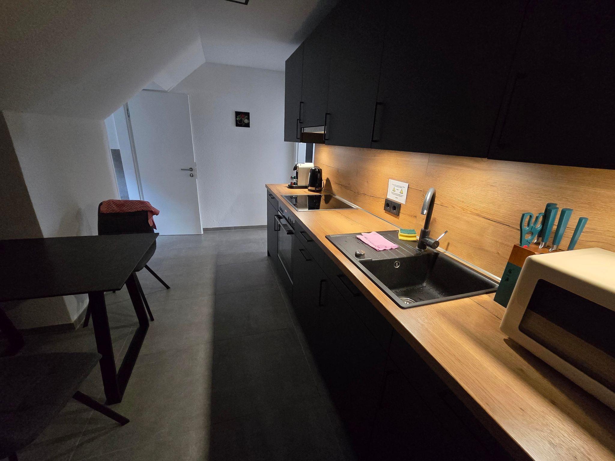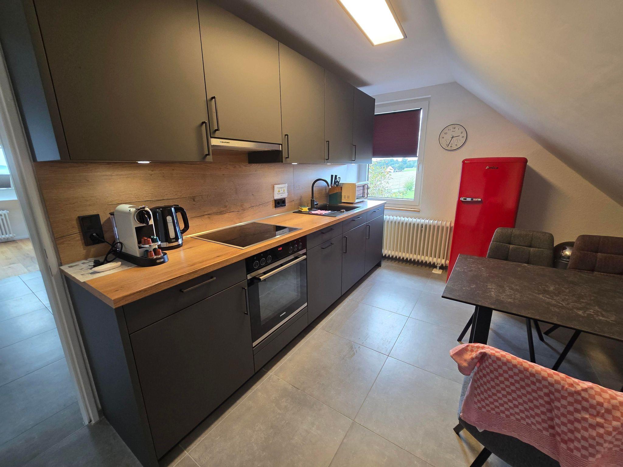 Die vollausgestatte moderne Küche (Induktionskochfeld, Ofen, Geschirrspüler, Microwelle, Kühlschrank mit Gefrierfach, etc.) bietet, alles was Sie während ihres Aufenthalts wünschen.
