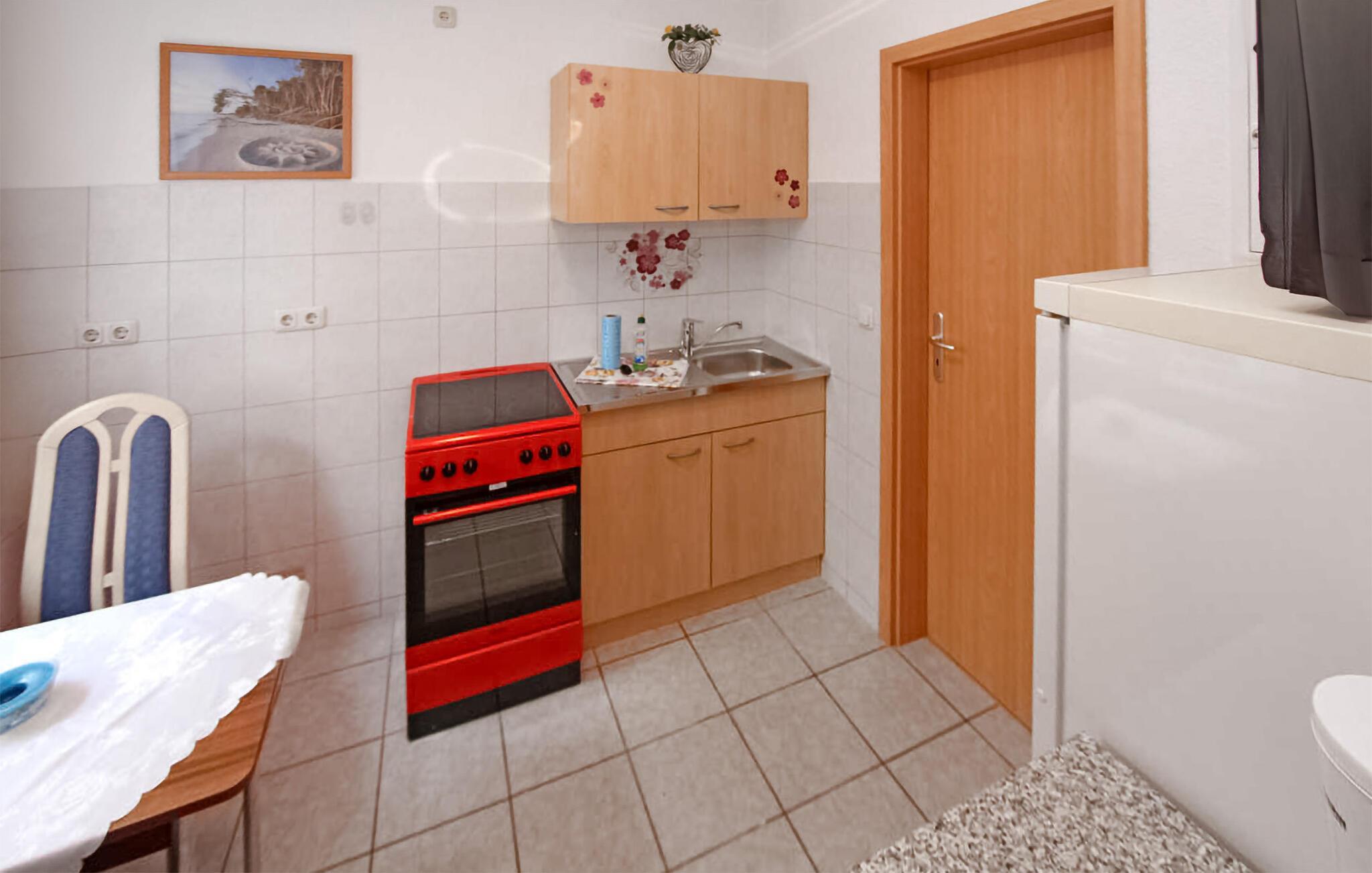 Ferielejligheden og de tre lejligheder ligger i stueetagen og øverste etage i et separat feriehus i gården til en badevilla, kun cirka 200 m fra Ahlbeck-molen og Østersøstranden. Butikker og restauranter ligger inden for få hundrede meter. Ejendomsbeskrivelsen findes for den respektive boligenhed. På det udendørs område er der et lille overdækket opholdsområde, grillfaciliteter, to strandstole til fælles brug samt cykelkælder og parkeringsplads (fra 2024 mod et gebyr på EUR 3,00/dag). Den samlede pris inkluderer slutrengøring, sengelinned, håndklæder samt vand- og energiforbrug. Da Østersøferiestedet Ahlbeck er et spa-/rekreationsresort, opkræves der en spaskat på stedet. En hund er tilladt i denne ejendom. Lejligheden (ca. 28 kvm til 2 personer) er beliggende i stueetagen af feriehuset.Den er udstyret med kombineret opholds-/soveplads (dobbeltseng, garderobeskab, opholdsområde, tv og radio), separat køkken med bl.a. el-komfur, bad/toilet, centralvarme og møbleret udendørs opholdsområde. Badebyerne Bansin, Heringsdorf og Ahlbeck er de såkaldte kejserlige feriesteder på øen Usedom. De har brede sandstrande, moler med moler og er forbundet med hinanden af en promenade, der fører til Swinoujscie i Polen. I byerne er der leje af cykler, båd og strandstole, tennisbaner og et netværk af godt afmærkede vandrestier. Et moderne vandland, "Ostseetherme", ligger centralt mellem Heringsdorf og Ahlbeck. Grænseovergangen til Polen kan nås fra Ahlbeck på få minutter.