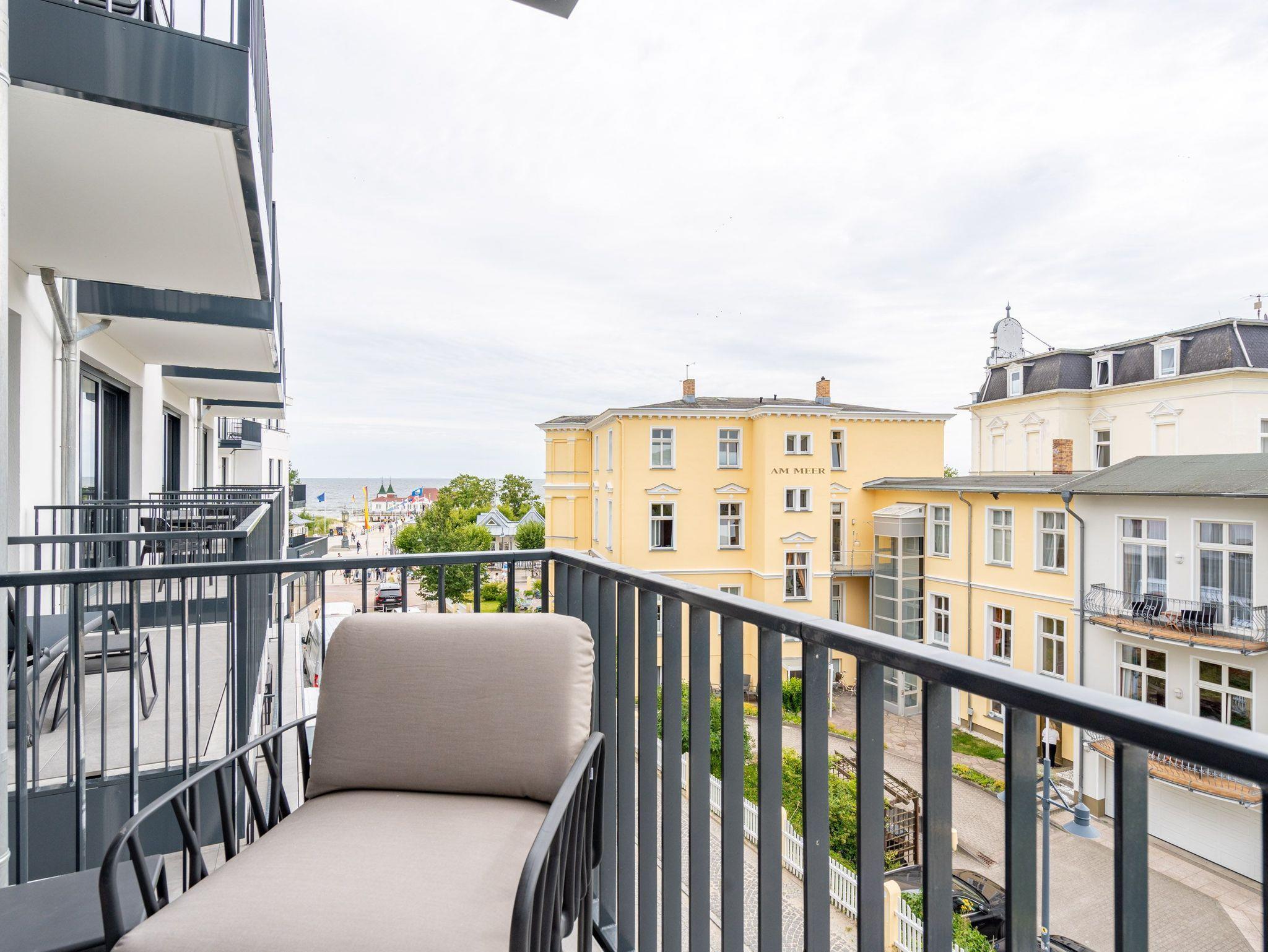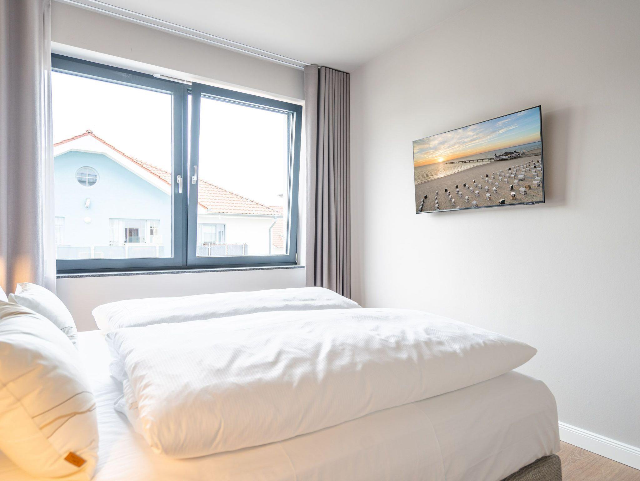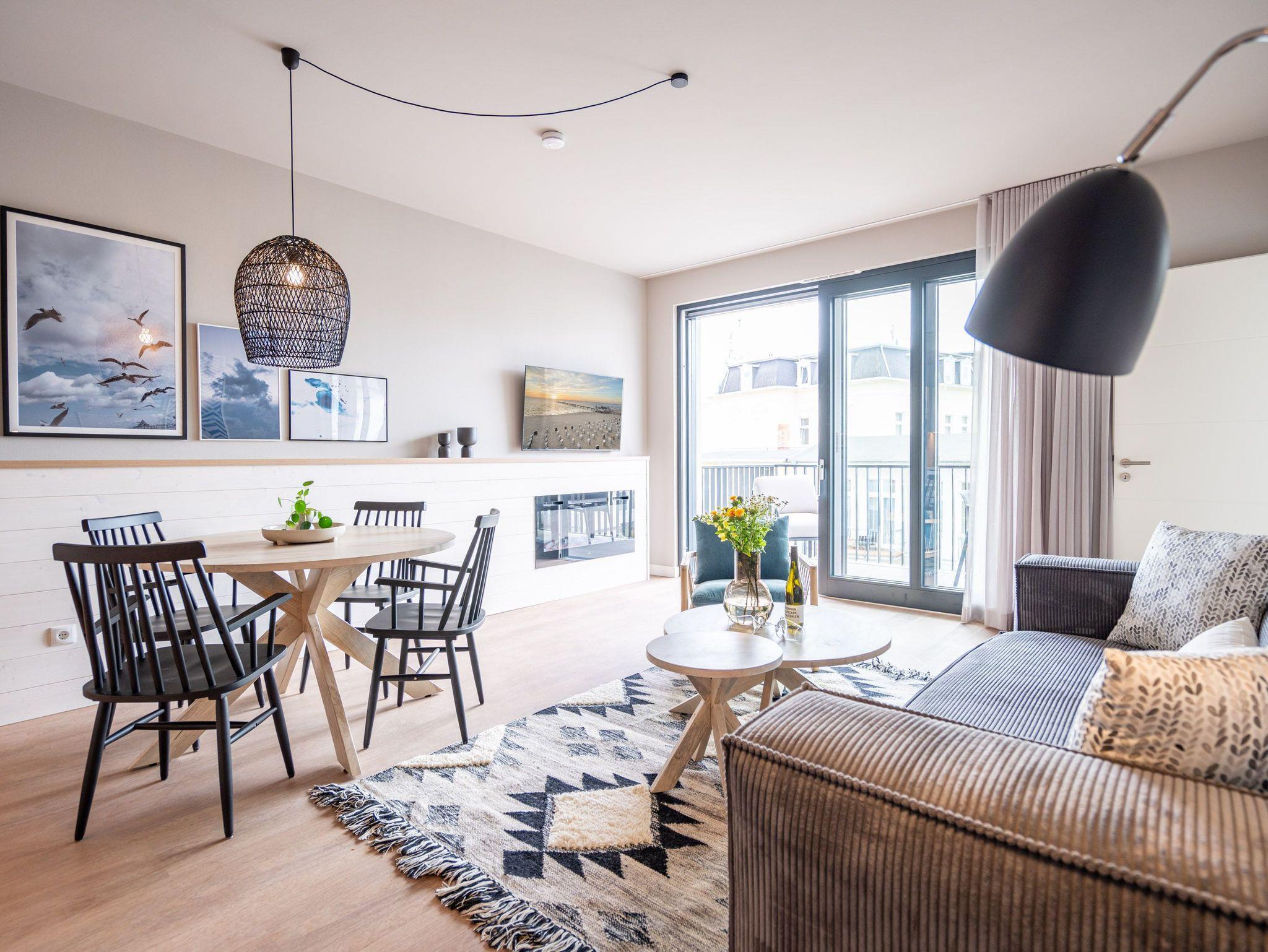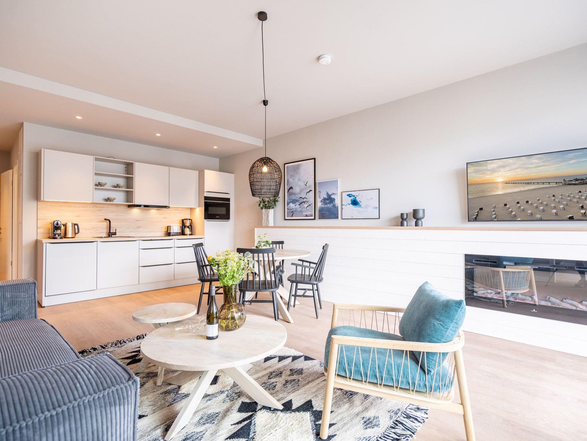 Ein Appartement zum Wohlfühlen, zum Aus-und Entspannen und zum Verlieben ist das 3-Raum-Appartement B 2.4 (Haus B) in der 2. Etage der Strandterrasse. Die 88 Quadratmeter sind mit Geschmack und viel Liebe zum Detaileingerichtet und ein ideales Domizil für bis zu 4 Personen und 1 Kleinkind im Kinderreisebett, die gemeinsam eine Auszeit direkt am Meer genießen wollen. Die Ostsee ist nur 80 Meter entfernt und vom Balkon der Wohnung aus sogar zu sehen. Der Blick reicht seitlich bis über die wunderschöne alte Ahlbecker Seebrücke hinaus. Blaue Weite bis zum Horizont. Ein großzügiger Wohn-Essraum bietet viel Platz zum Entspannen. Geben Sie sich auf der stylischen Couch mit Sessel vor dem großen Flat-TV (50 Zoll) dem süßen Nichtstun hin. Ein gemütlicher Essplatz versammelt alle zu den selbst gekochten Leckereien. Die können Sie in der offenen Küchenzeile ganz leicht zubereiten. Sie ist mit allen Annehmlichkeiten und hochwertigen Elektrogeräten wie einem Backofen, einem 4-Platten-Induktionsherd und einer Nespresso-Kapselmaschine ausgestattet. Die Wohnung hat einen Elektrokamin (ohne Wärmeabgabe), der für eine behagliche Atmosphäre sorgt. Sie können sowohl vom Wohnzimmer als auch von einem der beiden Schlafzimmer aus auf den Balkon mit Ostausrichtung hinaustreten. Ein Esstisch und eine Sonnenliege verschönern die Momente unter freiem Himmel. Das Rauschen der Wellen wirkt sich beruhigend und entschleunigend auf Geist und Körper aus. Ganz besonders, wenn man vom sanften Rauschen in den beiden komfortablen Schlafzimmern in den Schlaf gebracht wird. Jedes der Zimmer verfügt über ein bequemes Boxspringdoppelbett (1,80m x 2,00m), einen Kleiderschrank und einen Flat-TV (43 Zoll). Zwei moderne Duschbäder bieten mit Dusche, Waschtisch und WC allen Komfort. Für kuschelig warme und entspannende Stunden gibt es in einem der Bäder eine Infrarotsaunakabine. Ein PKW-Stellplatz in der Tiefgarage ermöglicht schon ein relaxtes Ankommen. Erholung also rundherum. Freuen Sie sich auf eine stilvolle Ferienwohnung mit einer hochwertigen Ausstattung ganz nah am Meer.