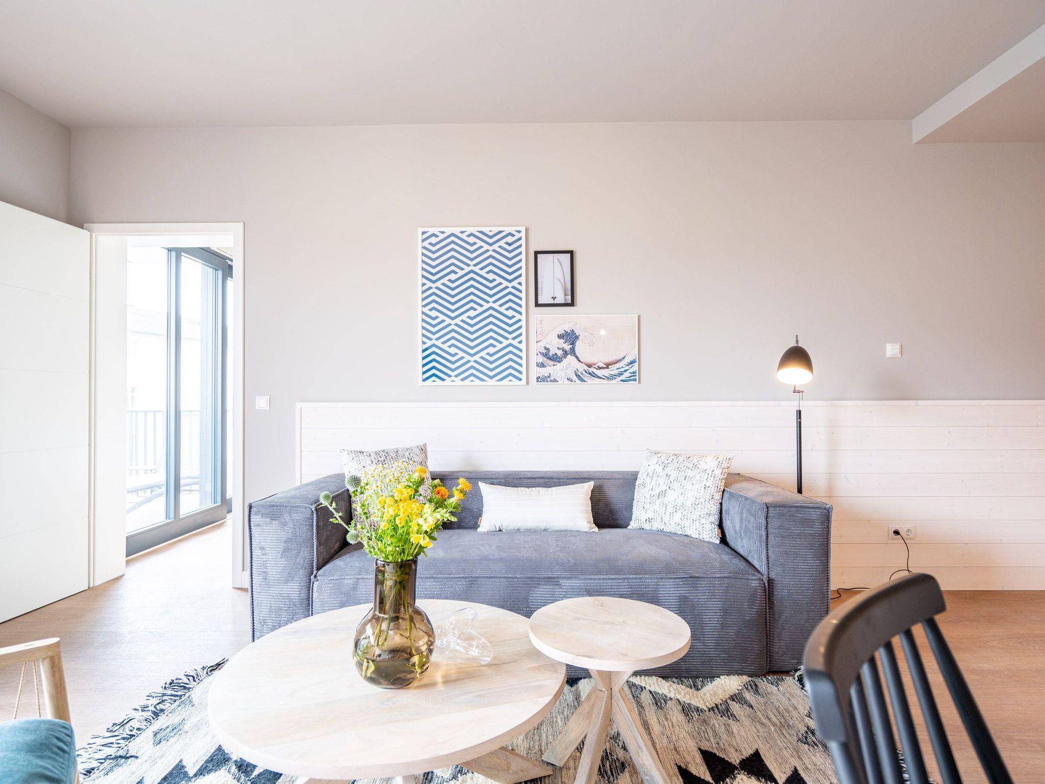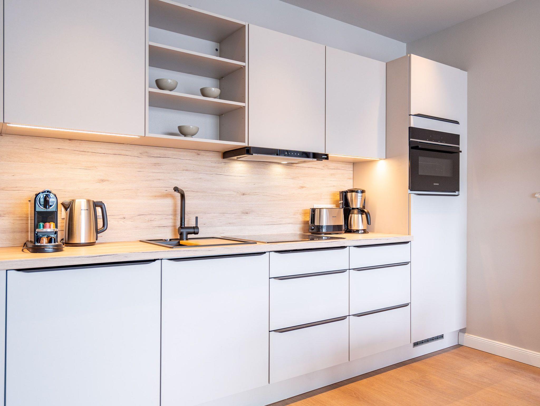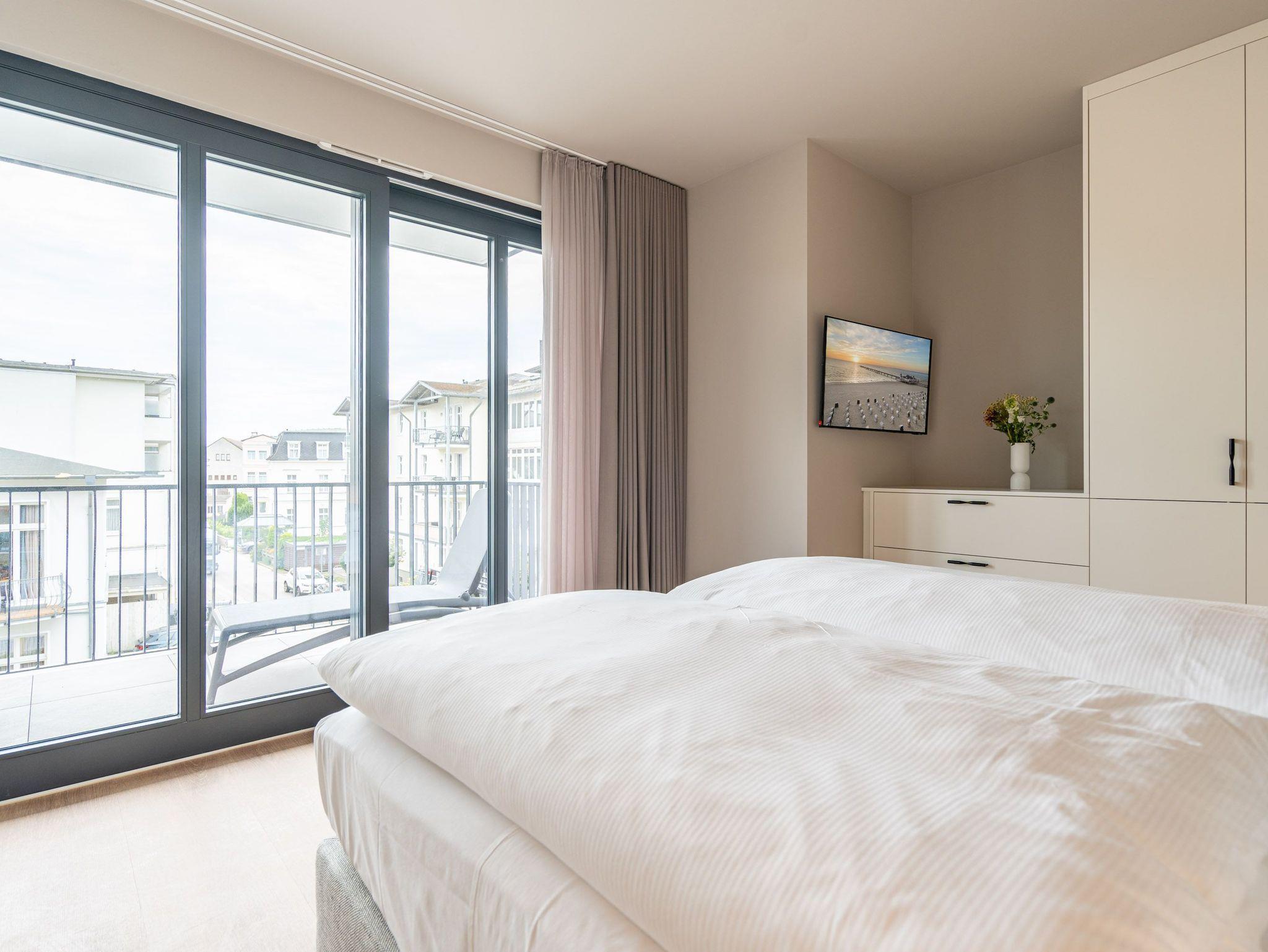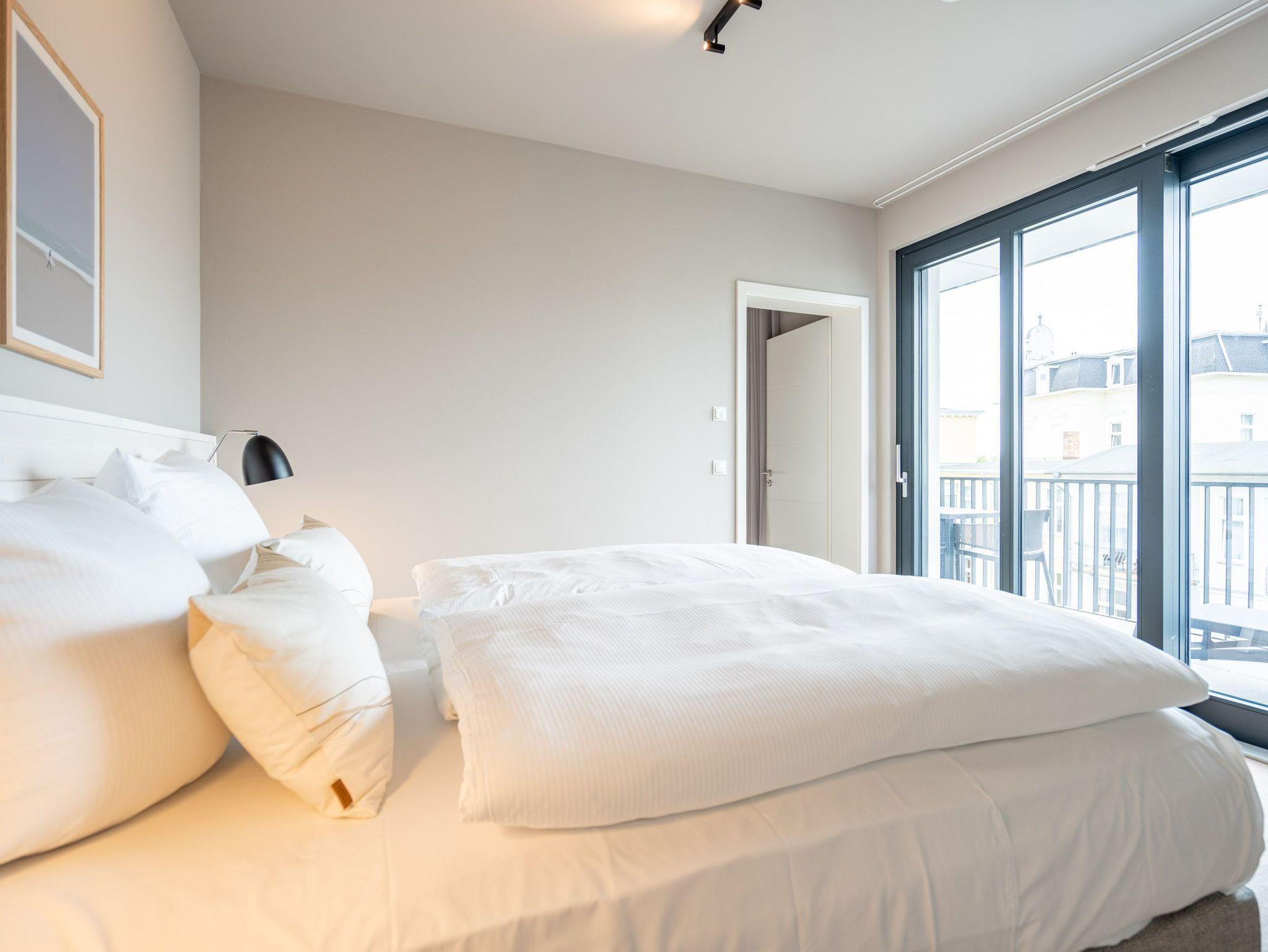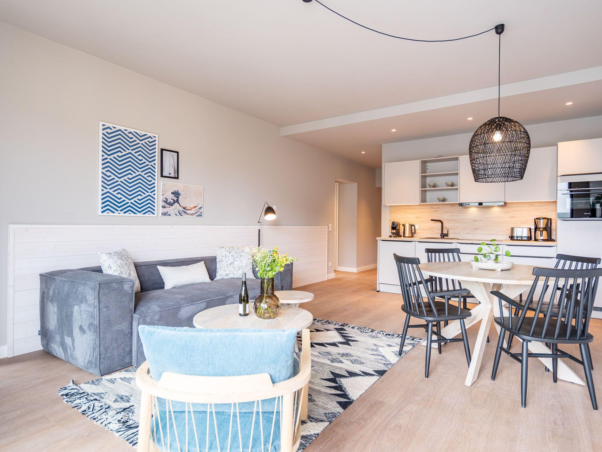 Ein Appartement zum Wohlfühlen, zum Aus-und Entspannen und zum Verlieben ist das 3-Raum-Appartement B 2.4 (Haus B) in der 2. Etage der Strandterrasse. Die 88 Quadratmeter sind mit Geschmack und viel Liebe zum Detaileingerichtet und ein ideales Domizil für bis zu 4 Personen und 1 Kleinkind im Kinderreisebett, die gemeinsam eine Auszeit direkt am Meer genießen wollen. Die Ostsee ist nur 80 Meter entfernt und vom Balkon der Wohnung aus sogar zu sehen. Der Blick reicht seitlich bis über die wunderschöne alte Ahlbecker Seebrücke hinaus. Blaue Weite bis zum Horizont. Ein großzügiger Wohn-Essraum bietet viel Platz zum Entspannen. Geben Sie sich auf der stylischen Couch mit Sessel vor dem großen Flat-TV (50 Zoll) dem süßen Nichtstun hin. Ein gemütlicher Essplatz versammelt alle zu den selbst gekochten Leckereien. Die können Sie in der offenen Küchenzeile ganz leicht zubereiten. Sie ist mit allen Annehmlichkeiten und hochwertigen Elektrogeräten wie einem Backofen, einem 4-Platten-Induktionsherd und einer Nespresso-Kapselmaschine ausgestattet. Die Wohnung hat einen Elektrokamin (ohne Wärmeabgabe), der für eine behagliche Atmosphäre sorgt. Sie können sowohl vom Wohnzimmer als auch von einem der beiden Schlafzimmer aus auf den Balkon mit Ostausrichtung hinaustreten. Ein Esstisch und eine Sonnenliege verschönern die Momente unter freiem Himmel. Das Rauschen der Wellen wirkt sich beruhigend und entschleunigend auf Geist und Körper aus. Ganz besonders, wenn man vom sanften Rauschen in den beiden komfortablen Schlafzimmern in den Schlaf gebracht wird. Jedes der Zimmer verfügt über ein bequemes Boxspringdoppelbett (1,80m x 2,00m), einen Kleiderschrank und einen Flat-TV (43 Zoll). Zwei moderne Duschbäder bieten mit Dusche, Waschtisch und WC allen Komfort. Für kuschelig warme und entspannende Stunden gibt es in einem der Bäder eine Infrarotsaunakabine. Ein PKW-Stellplatz in der Tiefgarage ermöglicht schon ein relaxtes Ankommen. Erholung also rundherum. Freuen Sie sich auf eine stilvolle Ferienwohnung mit einer hochwertigen Ausstattung ganz nah am Meer.