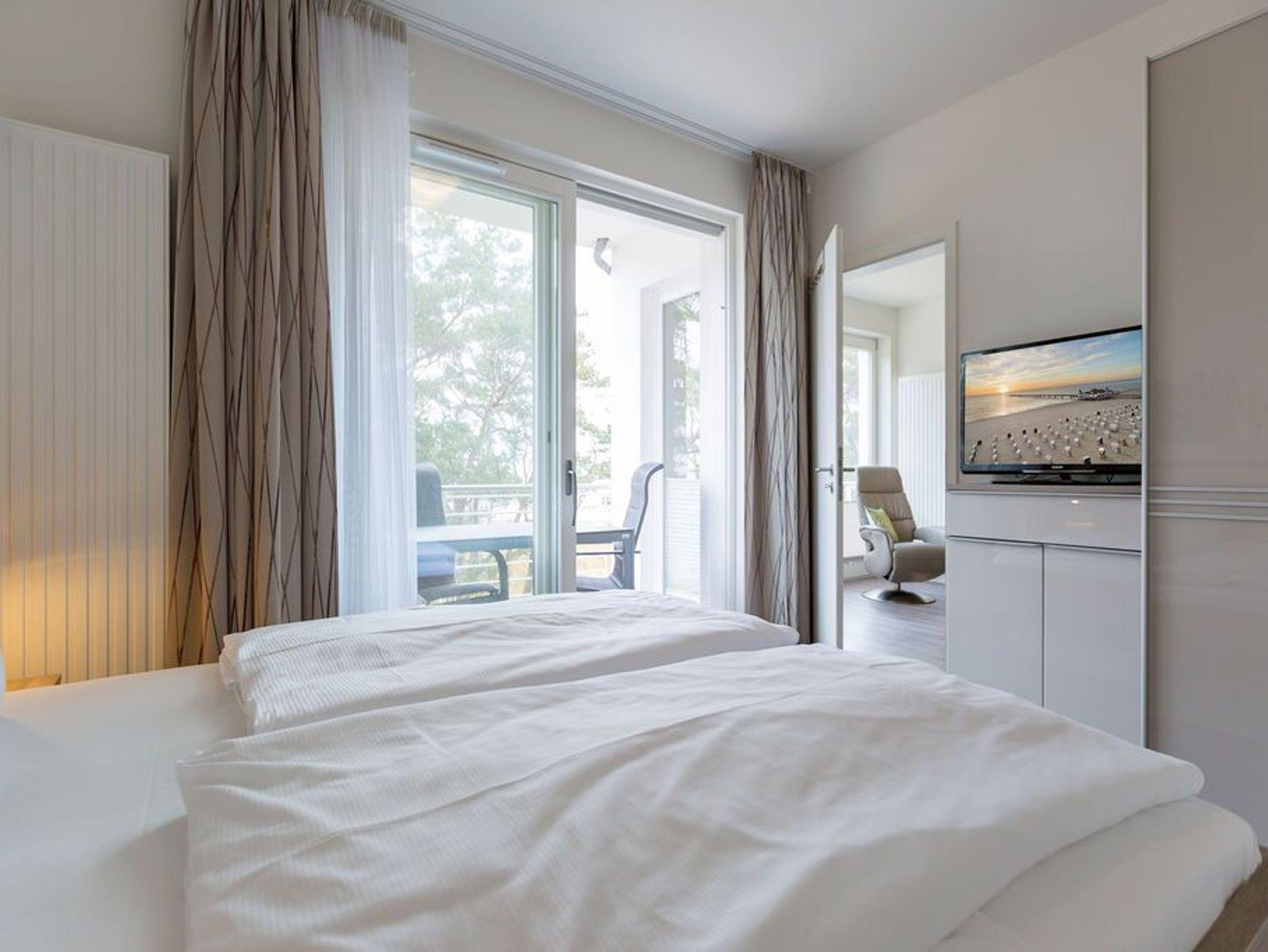 Die Ostsee rauscht geradewegs über den Balkon zum Fenster herein. Denn sie ist in diesem Drei-Zimmer-Wohlfühlparadies zum Greifen nah. Wussten Sie, dass es gesundheitsfördernd und gut für Geist und Seele ist, beim Meeresrauschen einzuschlafen? Auf den 63 Quadratmetern dieser wunderschönen Ferienwohnung in der 2. Etage können es sich bis zu vier Personen und ein Kleinkind bis zwei Jahre (im Kinderreisebett) so richtig gut gehen lassen und Ostseefeeling pur genießen. Frühstück auf dem Balkon (7 Quadratmeter), zu dem Sie sowohl aus dem Wohnzimmer wie auch aus einem der beiden Schlafzimmer Zugang haben, und der Tag beginnt traumhaft. Lassen Sie Ihre Gedanken über das Ostseeblau wandern und jeder Stress wird binnen kürzester Zeit von Ihnen abfallen. Die Einrichtung und die Materialien sind hochwertig und stylisch. Ob im gemütlichen Wohn-Ess-Zimmer oder in den beiden Schlafzimmern ? moderner Wohnkomfort empfängt Sie hier überall. Eine schöne, große Sofalandschaft und ein bequemer Sessel laden zum ausgiebigen Relaxen ein. Ein Flat-TV sorgt für das perfekte Heimkinogefühl. In der offenen Küche finden Sie alles Nötige. Ob Kaffeemaschine, Geschirrspüler oder Induktionsherd ? sämtliche Geräte sind Markengeräte. Auch ein edles Service ist vorhanden. Kochen, Backen, Zubereiten wird hier zum Kinderspiel. Ihre Mahlzeiten zu sich nehmen, das können Sie nicht nur auf dem Balkon, sondern auch am schönen, geräumigen Essplatz. Die bequemen Leder-Freischwinger eignen sich ideal für lange Dinner- und Gesprächsabende. In den beiden Schlafzimmern warten zwei komfortable Doppelbetten (1,80 m x 2,00 m) nur darauf, Ihnen Schlafvergnügen der Extra-Klasse zu bereiten ? inklusive der schönsten Träume. Geräumige Schränke bieten ausreichend Stauraum für die Urlaubsgarderobe. In einem Schlafzimmer gibt es einen Flat-TV. Das ebenfalls sehr geräumige Badezimmer verfügt über eine ebenerdige Dusche, ein WC und ein Waschbecken. Für uneingeschränktes Urlaubsvergnügen ist das WLAN kostenfrei. Die Betten sind bei Anreise bezogen und Handtücher liegen bereit. In der Tiefgarage ist ein Stellplatz im Doppelparker (Fahrzeughöhe max. 1,90 m) für Sie reserviert.