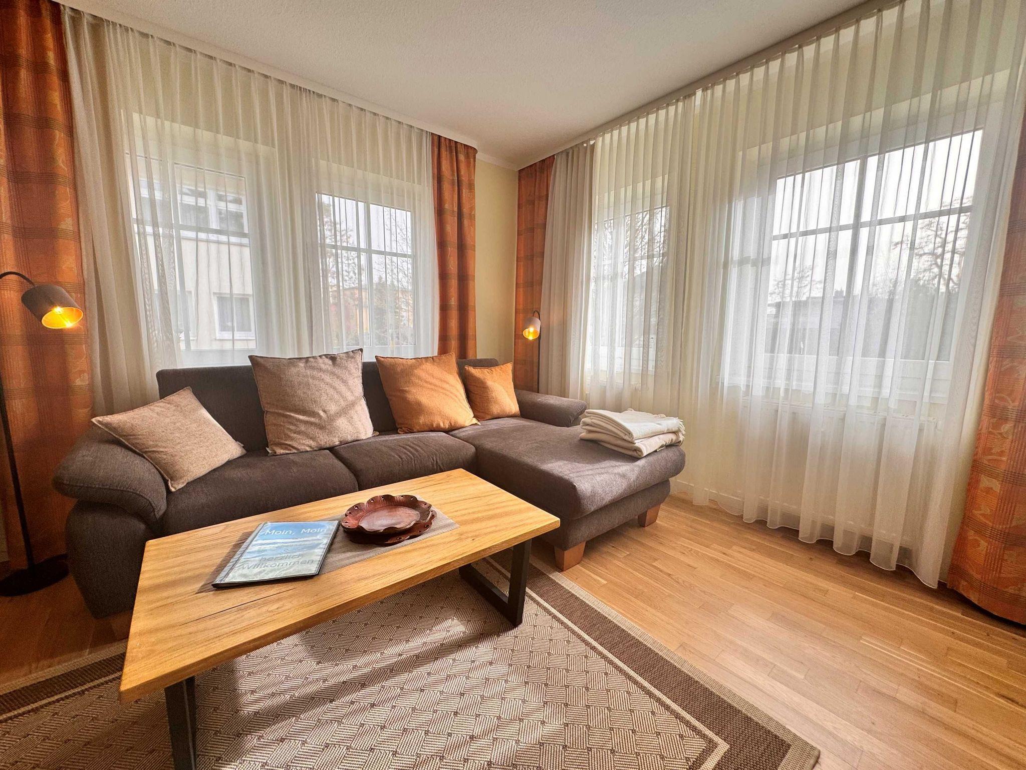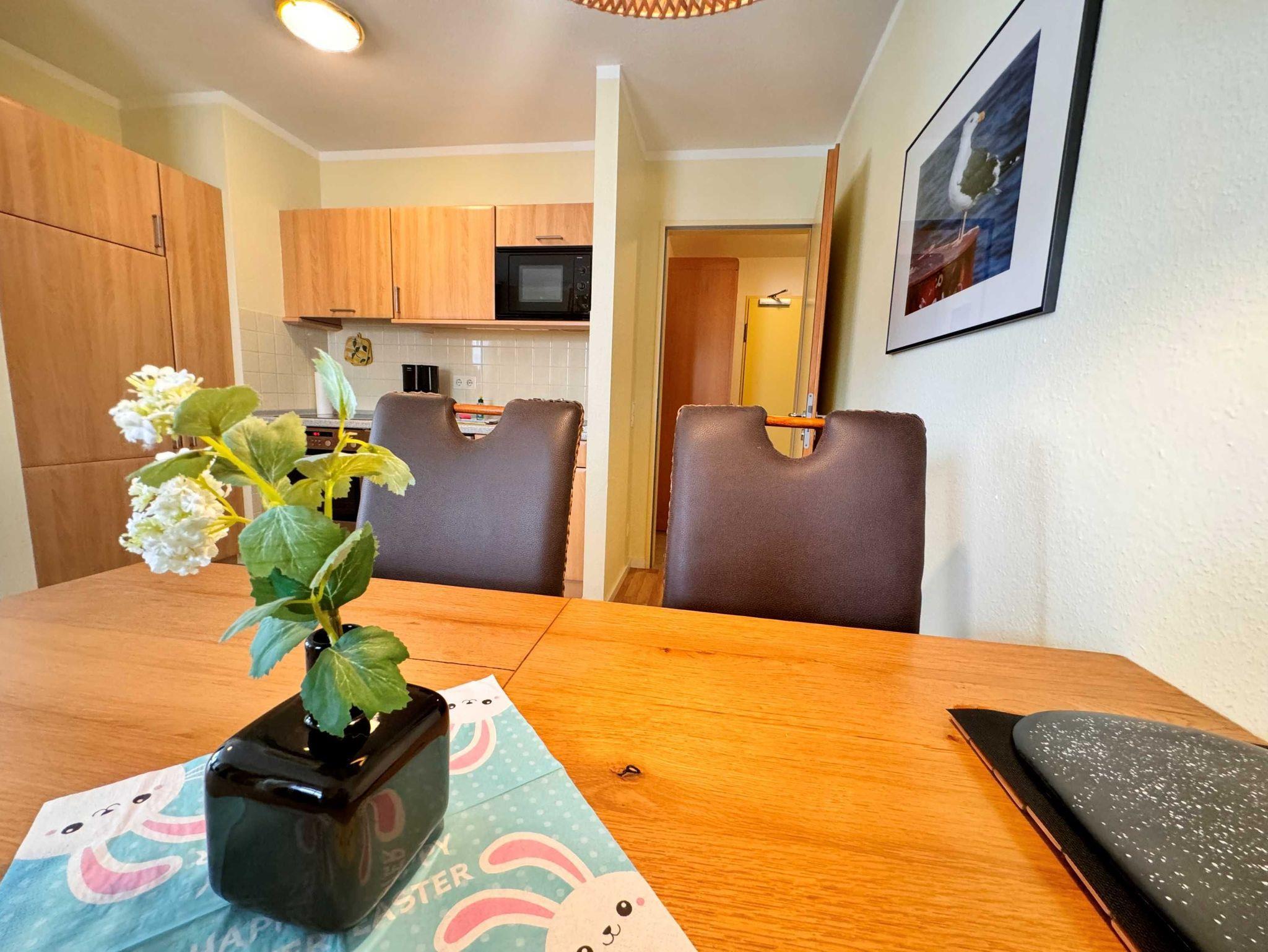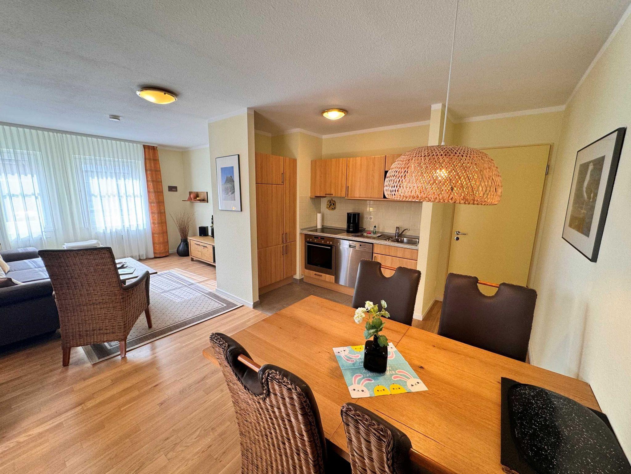 Die 52 qm große 2-Raum-Ferienwohnung befindet sich im 1. Obergeschoss (Südostlage) der Appartementanlage und ist für 2 Personen ausgestattet. Die Wohnung verfügt über ein großes Wohnzimmer mit bequemer Couch und eine Essecke mit 4 Stühlen. Für die Unterhaltung sorgt ein Flachbild-TV und eine Stereo-Anlage. Die vollständig ausgestattete Küchenzeile mit Ceranherd, Backofen, Mikrowelle, Kühlschrank mit Gefrierfach und Geschirrspülmaschine lässt keine Wünsche offen. Im Schlafzimmer befindet sich ein Doppelbett. Das Bad ist mit Dusche/WC sowie Haarfön ausgestattet. Ein Balkon lädt zum Sitzen und Verweilen ein. W-LAN steht Ihnen in der gesamten Wohnung kostenfrei zur Verfügung. Ein Kinderbett mit Wäsche sowie ein Hochstuhl können auf Anfrage gegen eine Gebühr von einmalig 50 € vom Verwalter zur Verfügung gestellt werden.