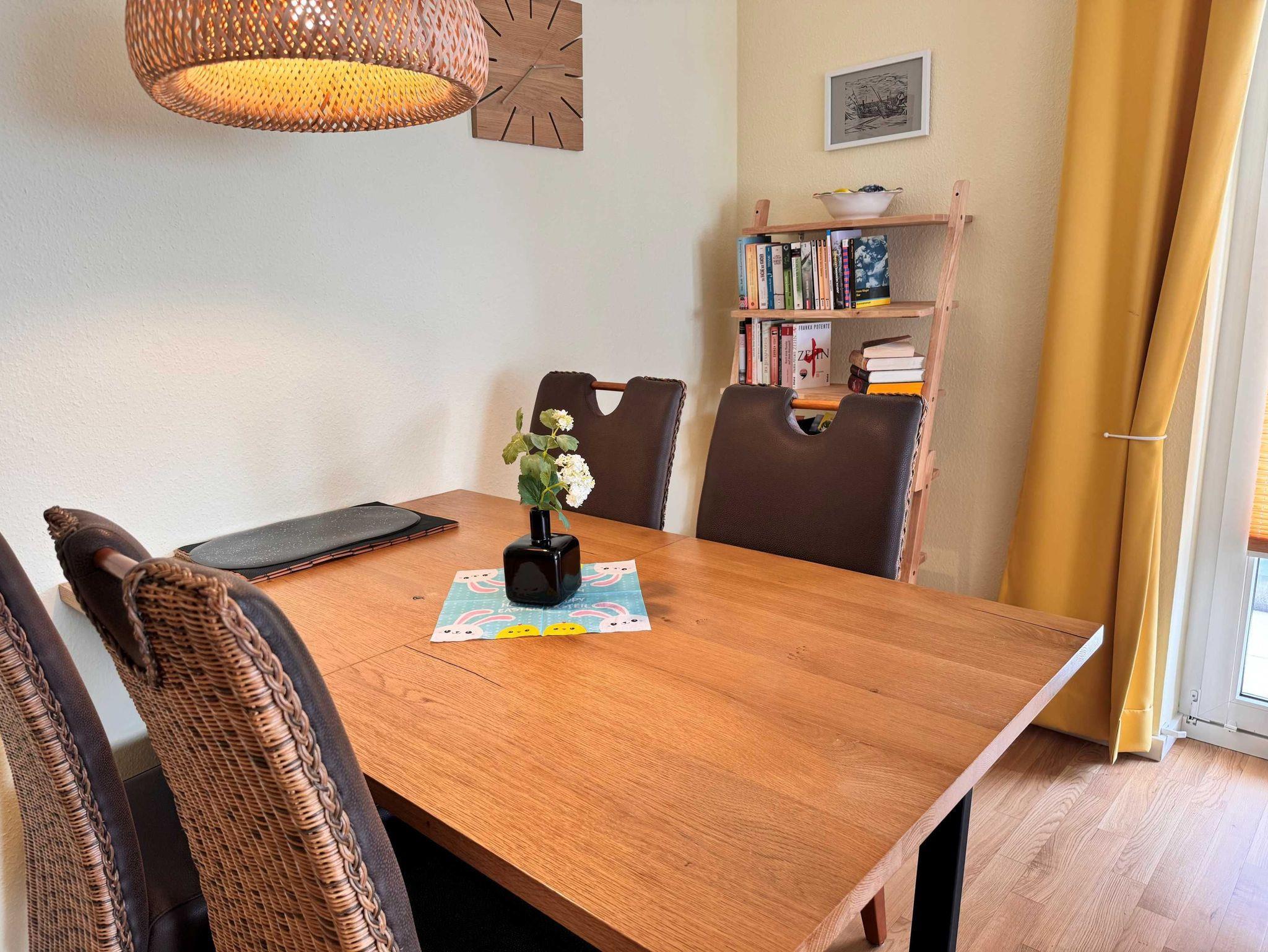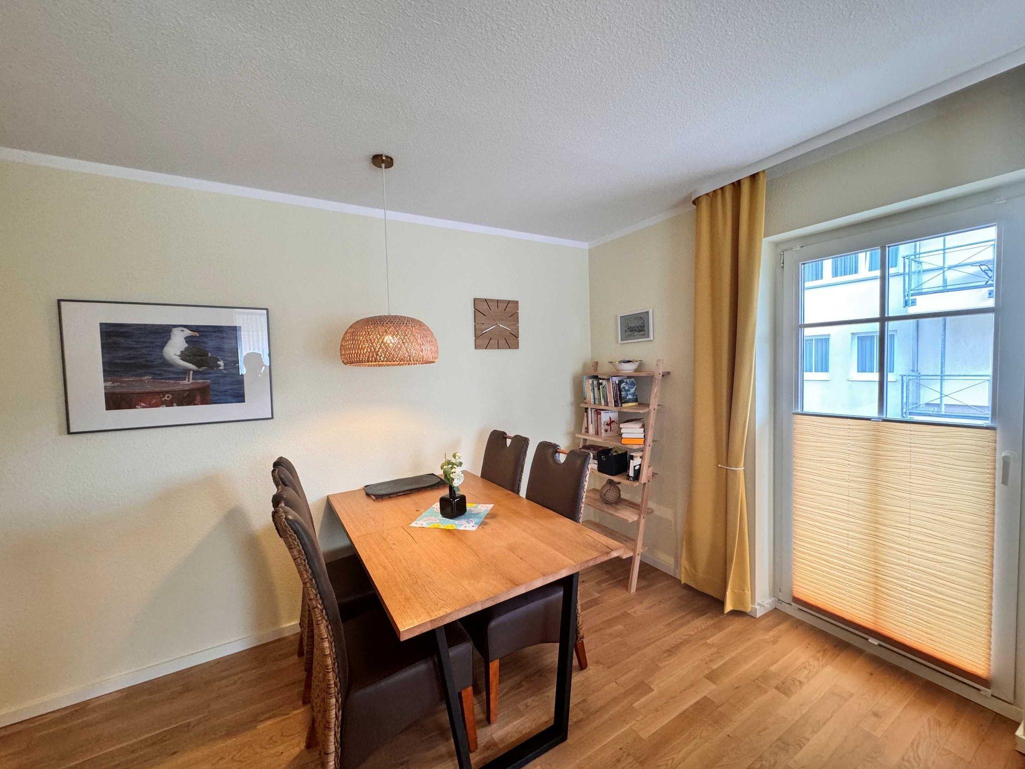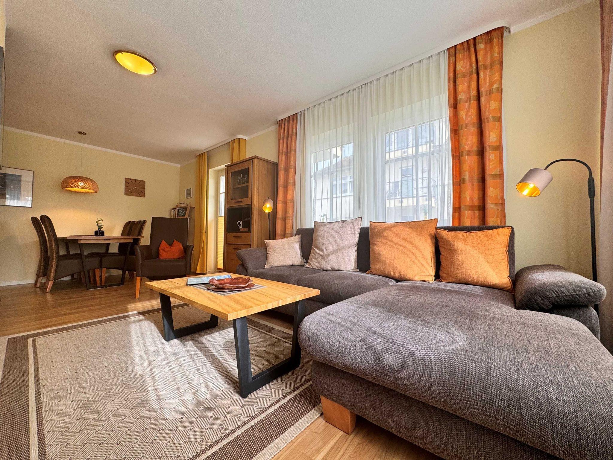 Die 52 qm große 2-Raum-Ferienwohnung befindet sich im 1. Obergeschoss (Südostlage) der Appartementanlage und ist für 2 Personen ausgestattet. Die Wohnung verfügt über ein großes Wohnzimmer mit bequemer Couch und eine Essecke mit 4 Stühlen. Für die Unterhaltung sorgt ein Flachbild-TV und eine Stereo-Anlage. Die vollständig ausgestattete Küchenzeile mit Ceranherd, Backofen, Mikrowelle, Kühlschrank mit Gefrierfach und Geschirrspülmaschine lässt keine Wünsche offen. Im Schlafzimmer befindet sich ein Doppelbett. Das Bad ist mit Dusche/WC sowie Haarfön ausgestattet. Ein Balkon lädt zum Sitzen und Verweilen ein. W-LAN steht Ihnen in der gesamten Wohnung kostenfrei zur Verfügung. Ein Kinderbett mit Wäsche sowie ein Hochstuhl können auf Anfrage gegen eine Gebühr von einmalig 50 € vom Verwalter zur Verfügung gestellt werden.