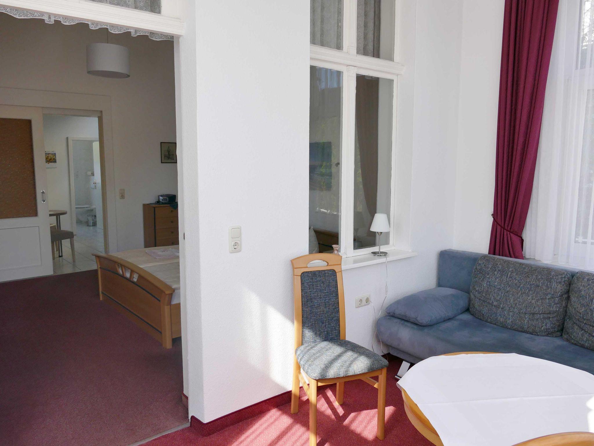 Die Wohnung im Hochparterre mit 60 qm Größe bietet Platz für bis zu 2 Personen, sie ist über einen separaten Eingang (Gartenseite der Pension) zu erreichen. Das Schlafzimmer verfügt über ein Doppelbett. Das gemütlich eingerichtete Wohnzimmer in der Veranda verfügt über eine Sitzecke und Kabel-TV. Die komplett eingerichtete Küche mit Backofen, Herd, Mikrowelle, Kühlschrank mit Gefriermöglichkeit u.v.m. gehört ebenso dazu wie ein Bad mit Dusche/WC.
