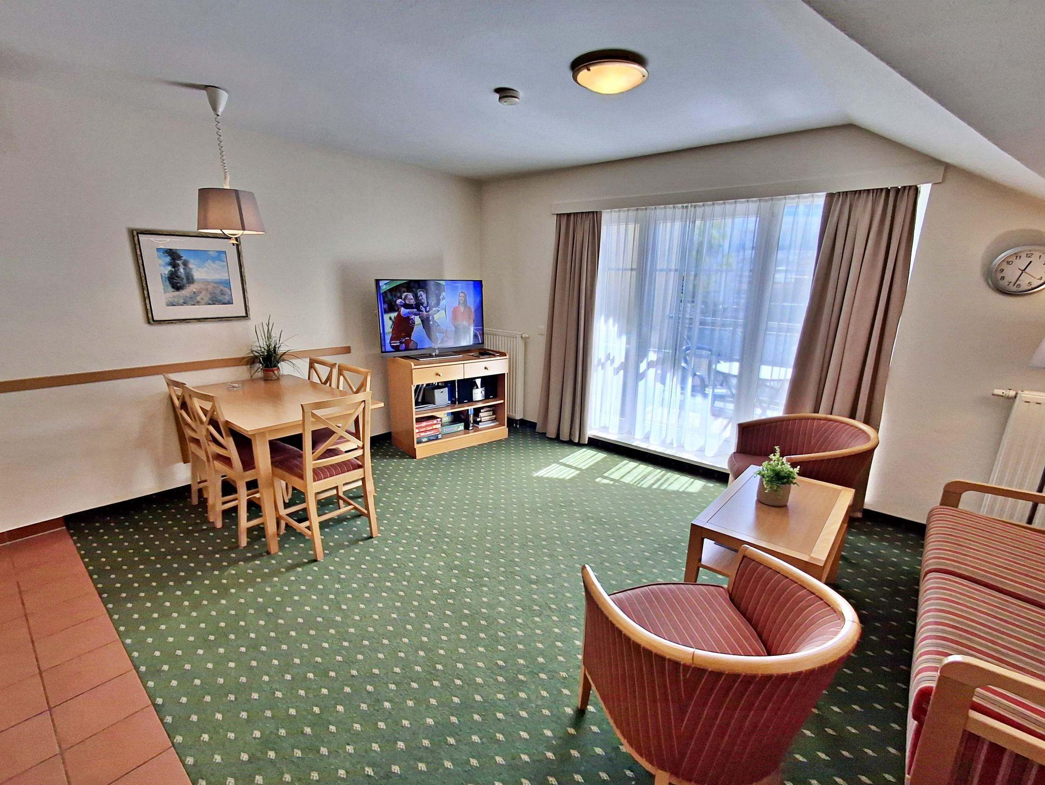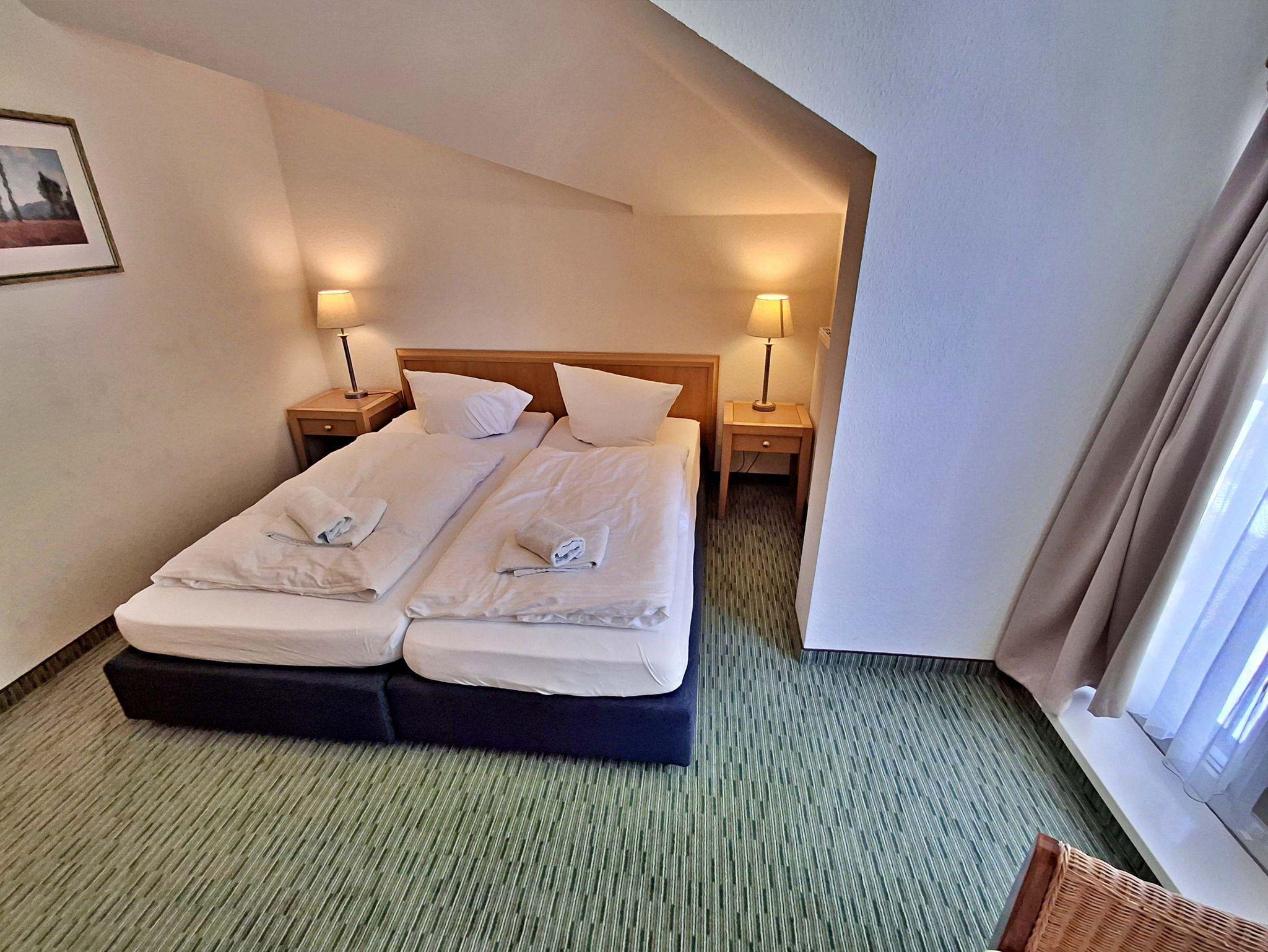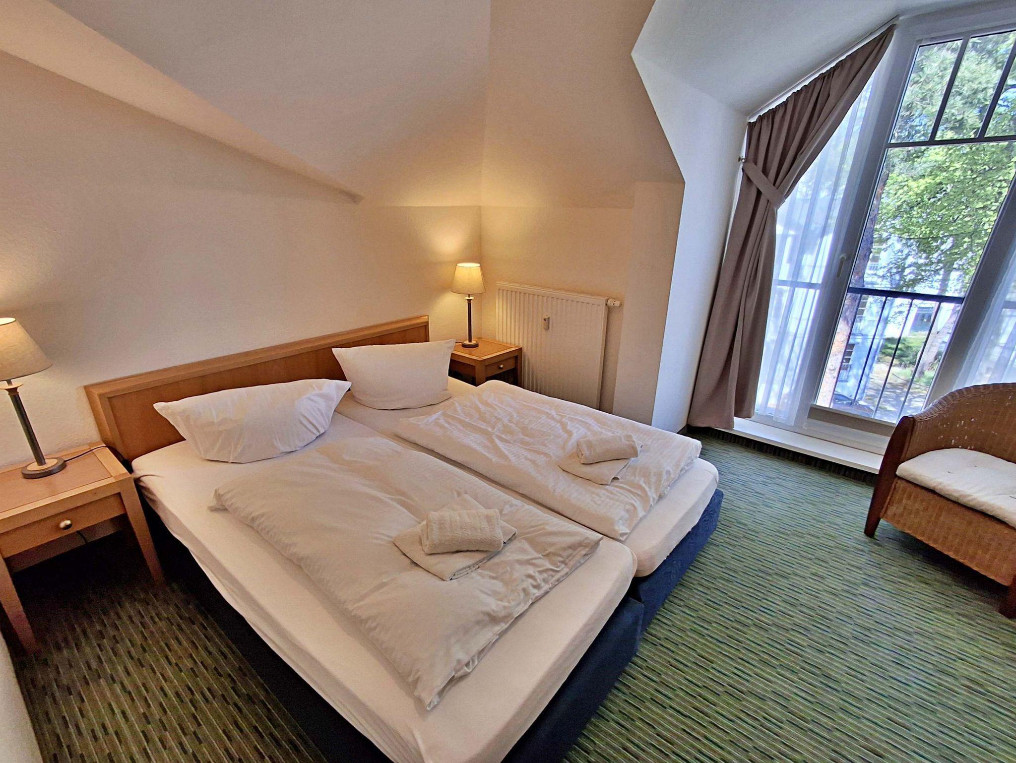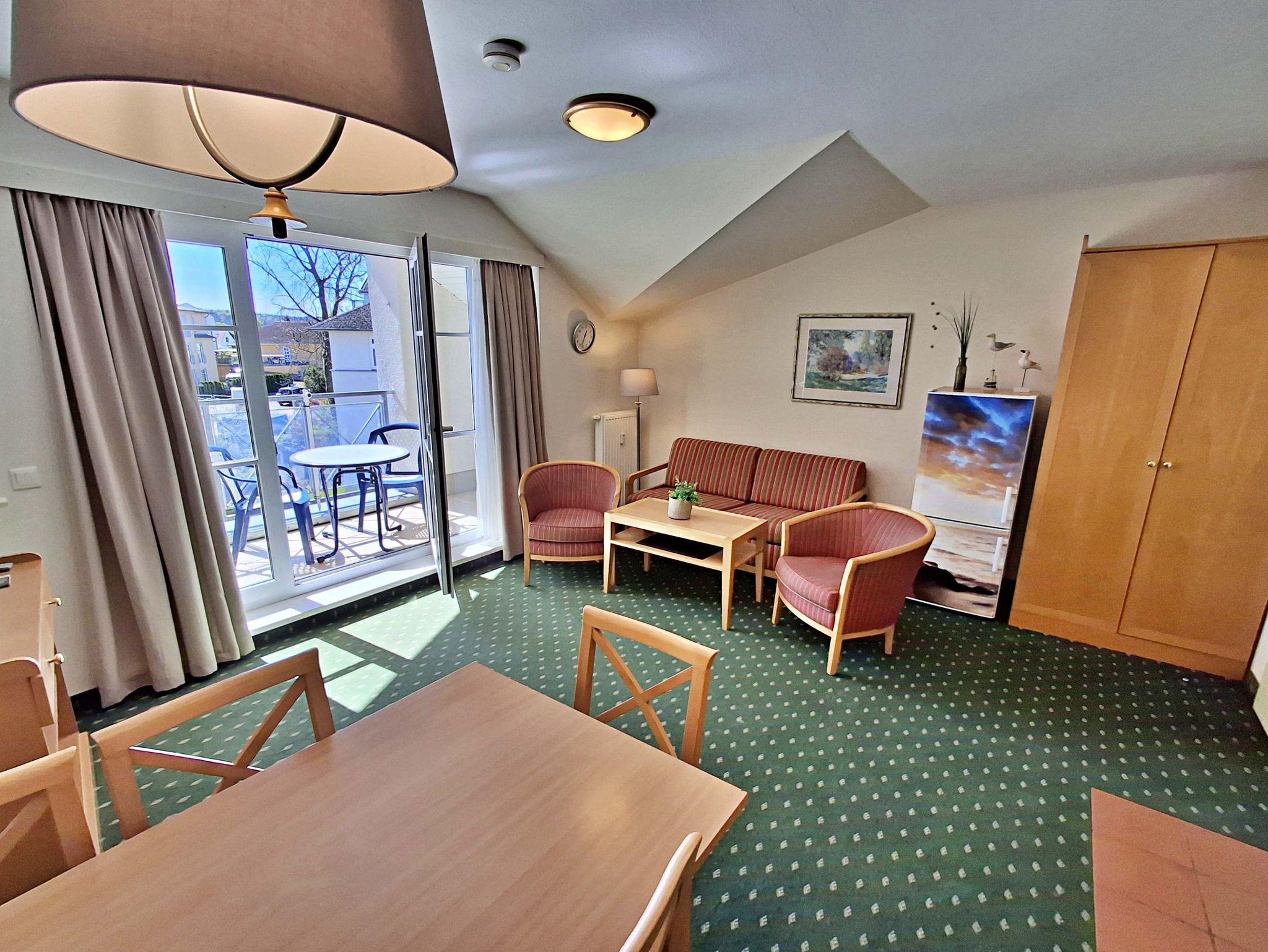 Die 68 qm große 3-Raum-Ferienwohnung (Süd-Ost-Seite) befindet sich im 3. OG der Appartementanlage und ist für 5 Personen (4 Erwachsene und ein Kind bis 10 Jahre) ausgestattet. Der Aufzug fährt bis zum 2. OG. Die Wohnung befindet sich in der 3. Etage. Der Aufzug fährt bis zum 2.OG. Die Wohnung verfügt über ein Wohnzimmer mit Sofa, Sessel sowie Esstisch mit 4 Stühlen. Für die Unterhaltung sorgen ein Flachbild-TV, eine Stereo-Anlage und DVD-Player. Die vollständig ausgestattete Küchenzeile mit Ceranherd, Backofen, Mikrowelle, Spülmaschine und Kühlschrank mit Gefrierfach lässt keine Wünsche offen. Im ersten Schlafzimmer befindet sich ein Doppelbett und im zweiten Schlafzimmer zwei Einzelbetten. Das Tageslicht-Bad ist mit Dusche/WC und Haarfön ausgestattet. Eine Loggia lädt zum Sitzen und Verweilen ein und komplettiert die Ausstattung der Wohnung. WLAN steht in der gesamten Wohnung kostenfrei zur Verfügung.
