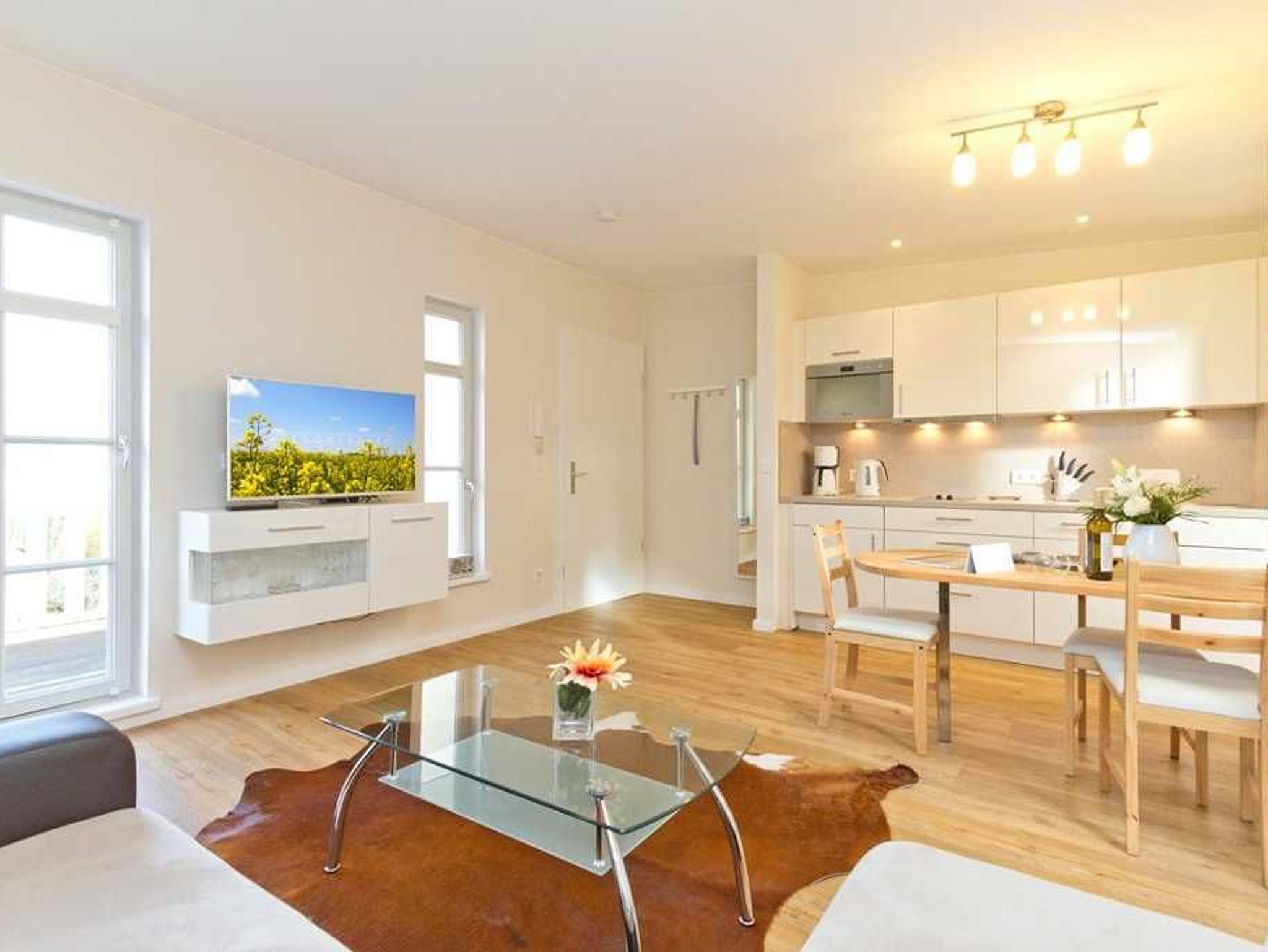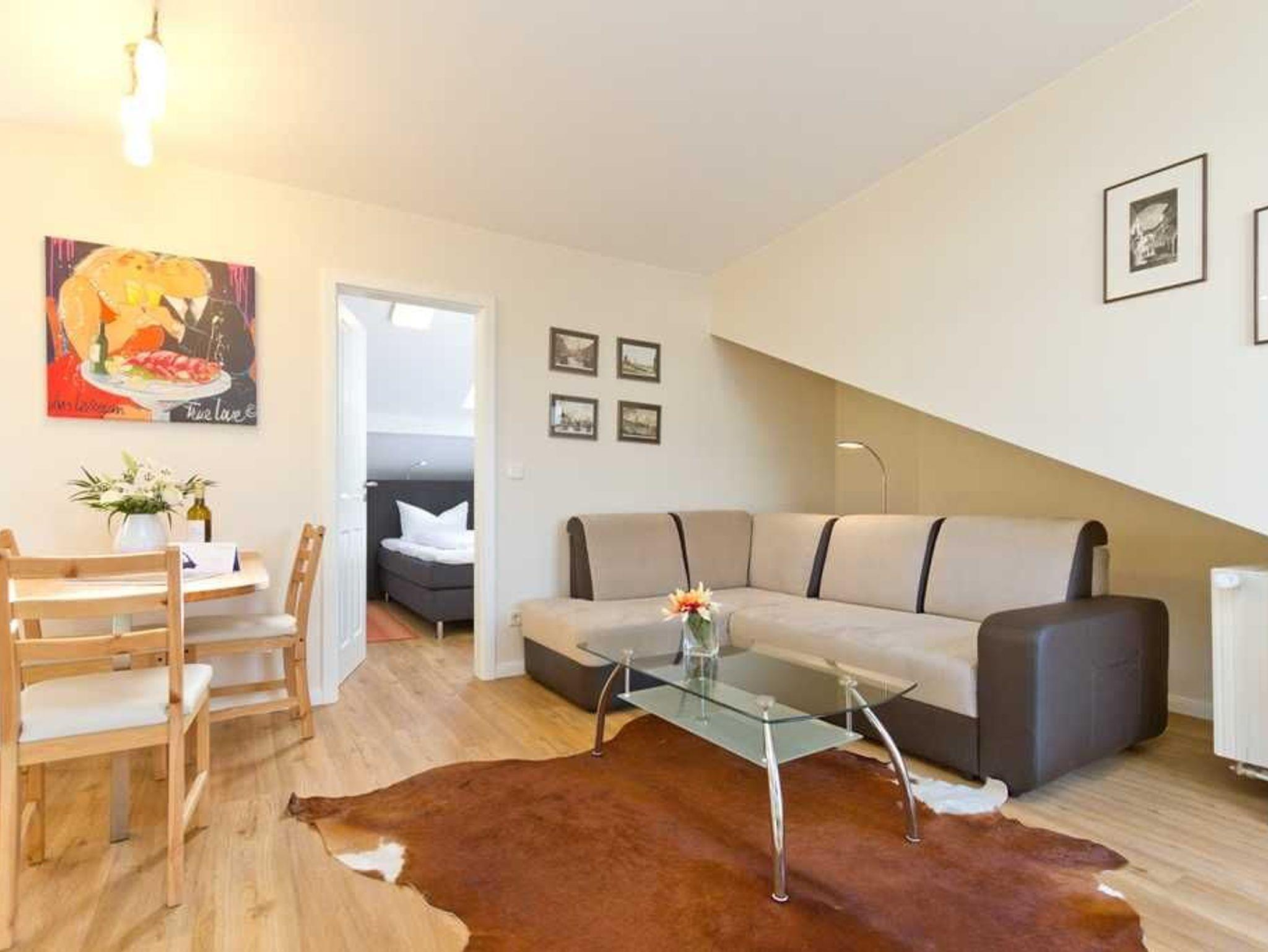 Freuen Sie sich auf einen gemütlichen Wohnraum inkl. Dachschrägen, einem großen Ecksofa, mit einem Essplatz sowie einer offenen Küchenzeile inkl. Backofen, Ceranfeld, Mikrowelle, Kühlschrank und Geschirrspüler. Der angrenzende Balkon lädt zu einem Frühstück unter freiem Himmel oder das Gläschen Wein am Abend ein.