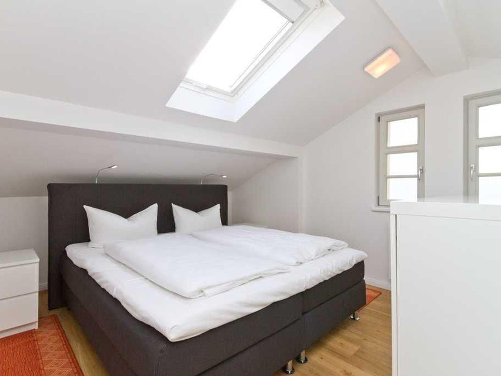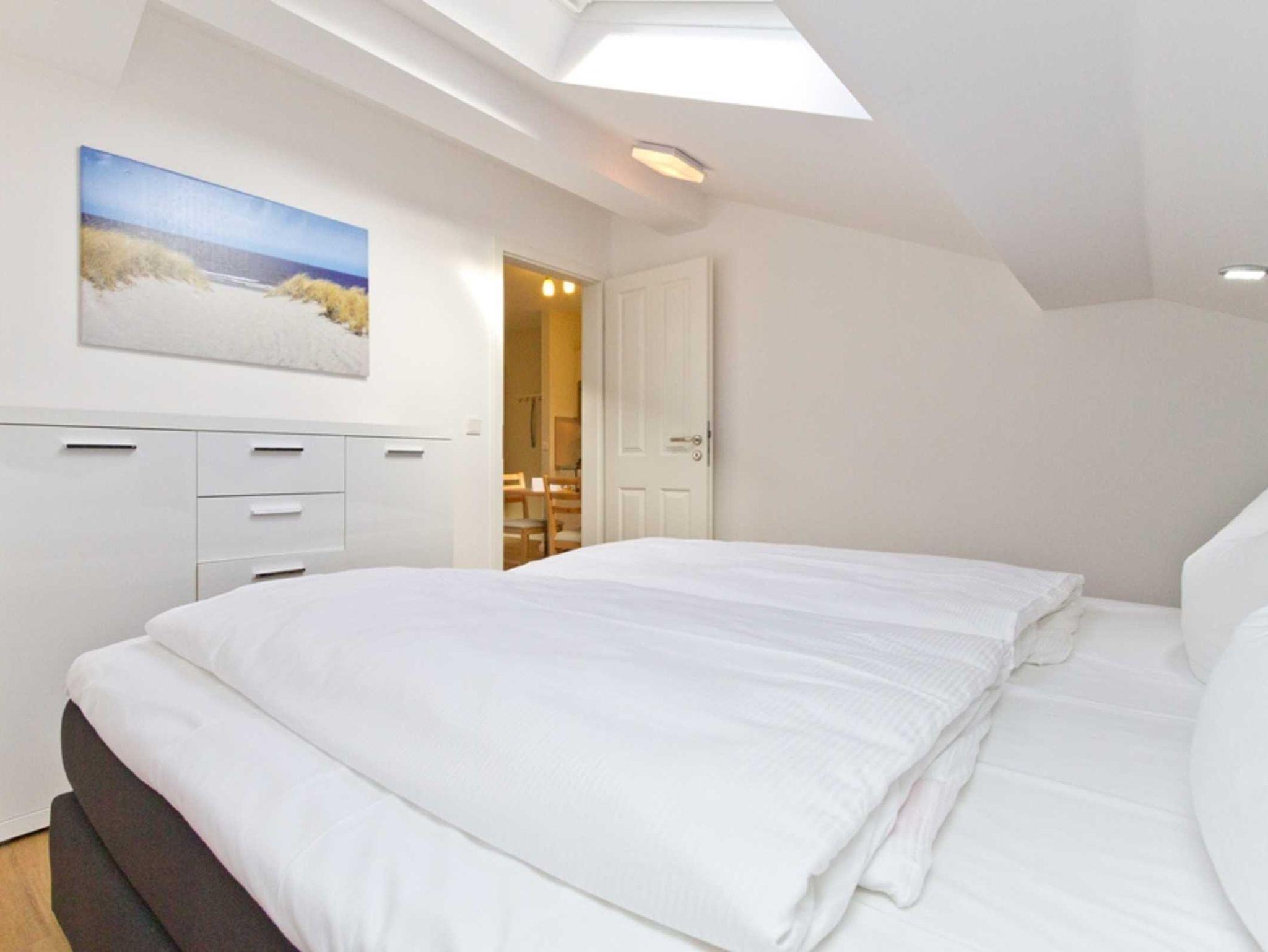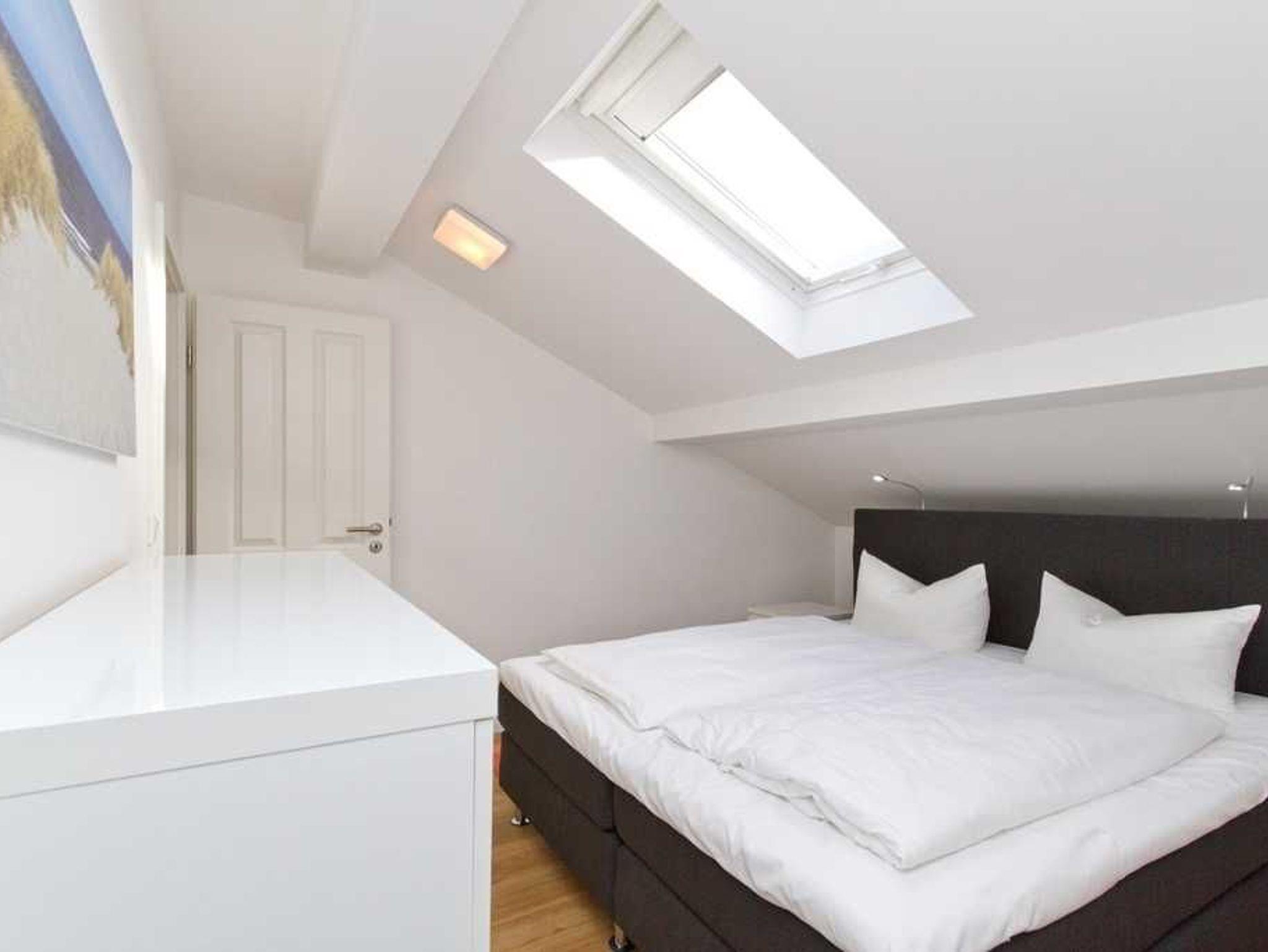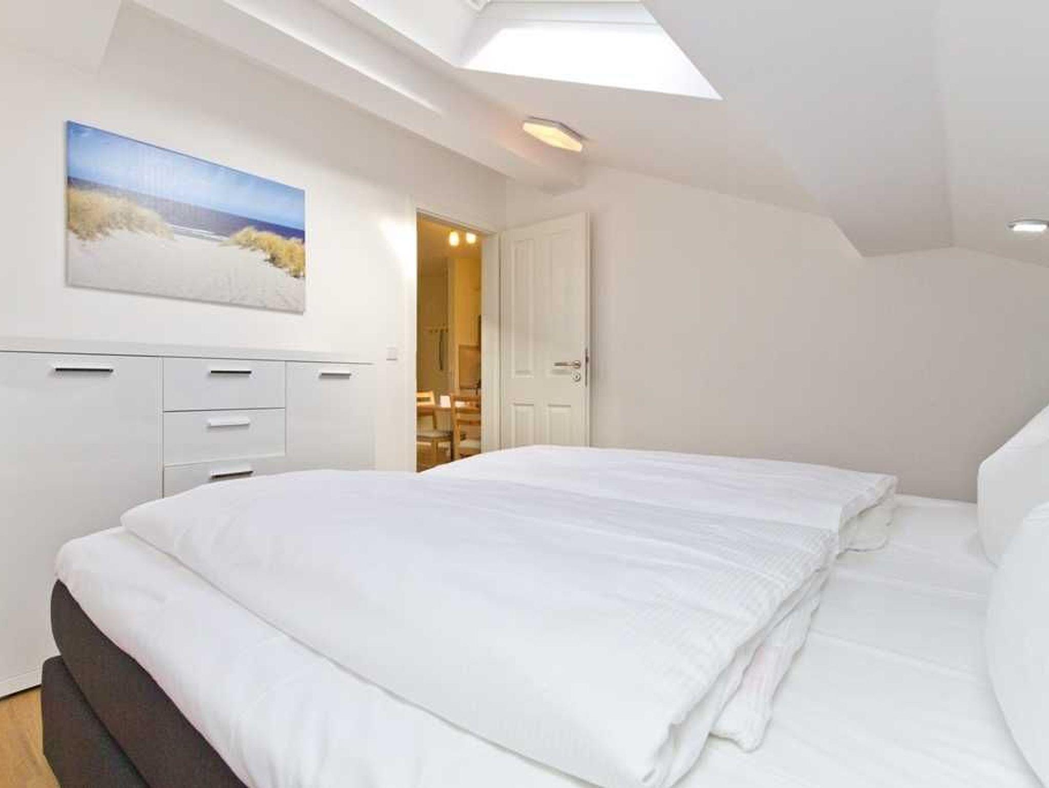 Das Schlafzimmer ist mit einem Boxspringbett (180 cm x 200 cm) ausgestattet. Eine großzügige Kommode freut sich auf Ihre Urlaubsgarderobe.