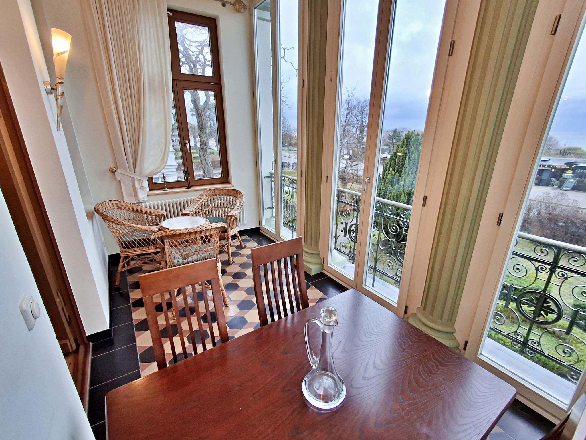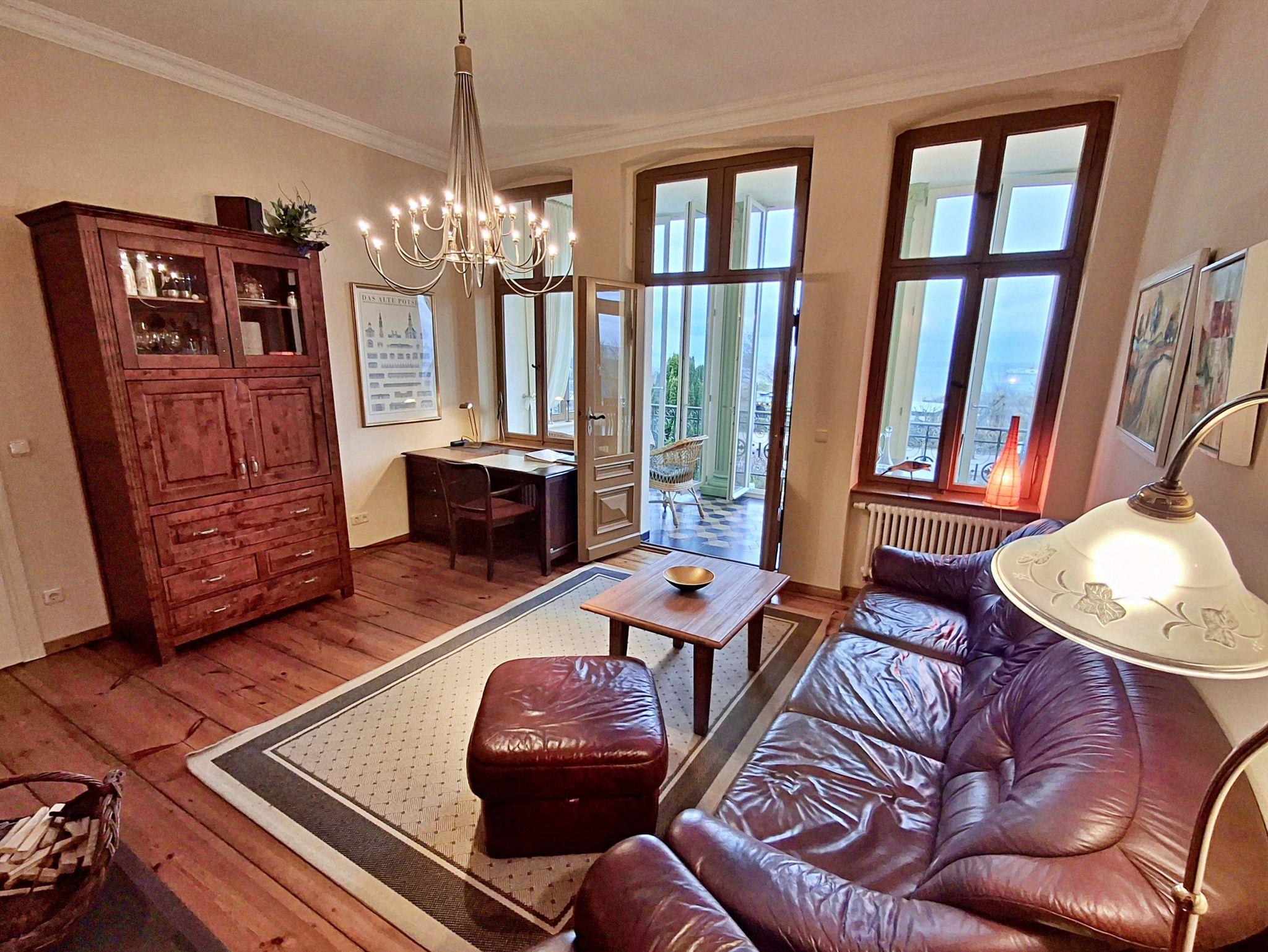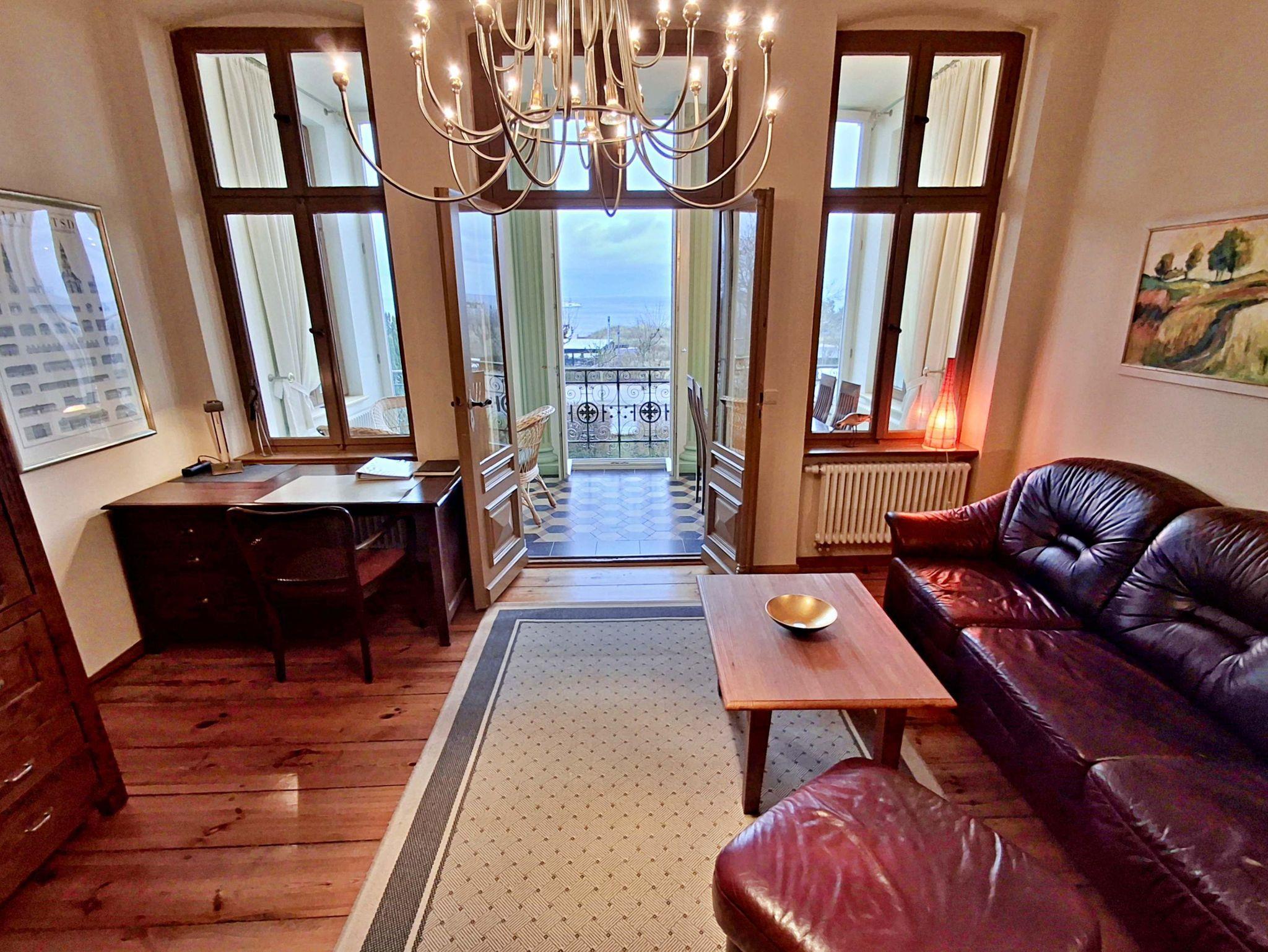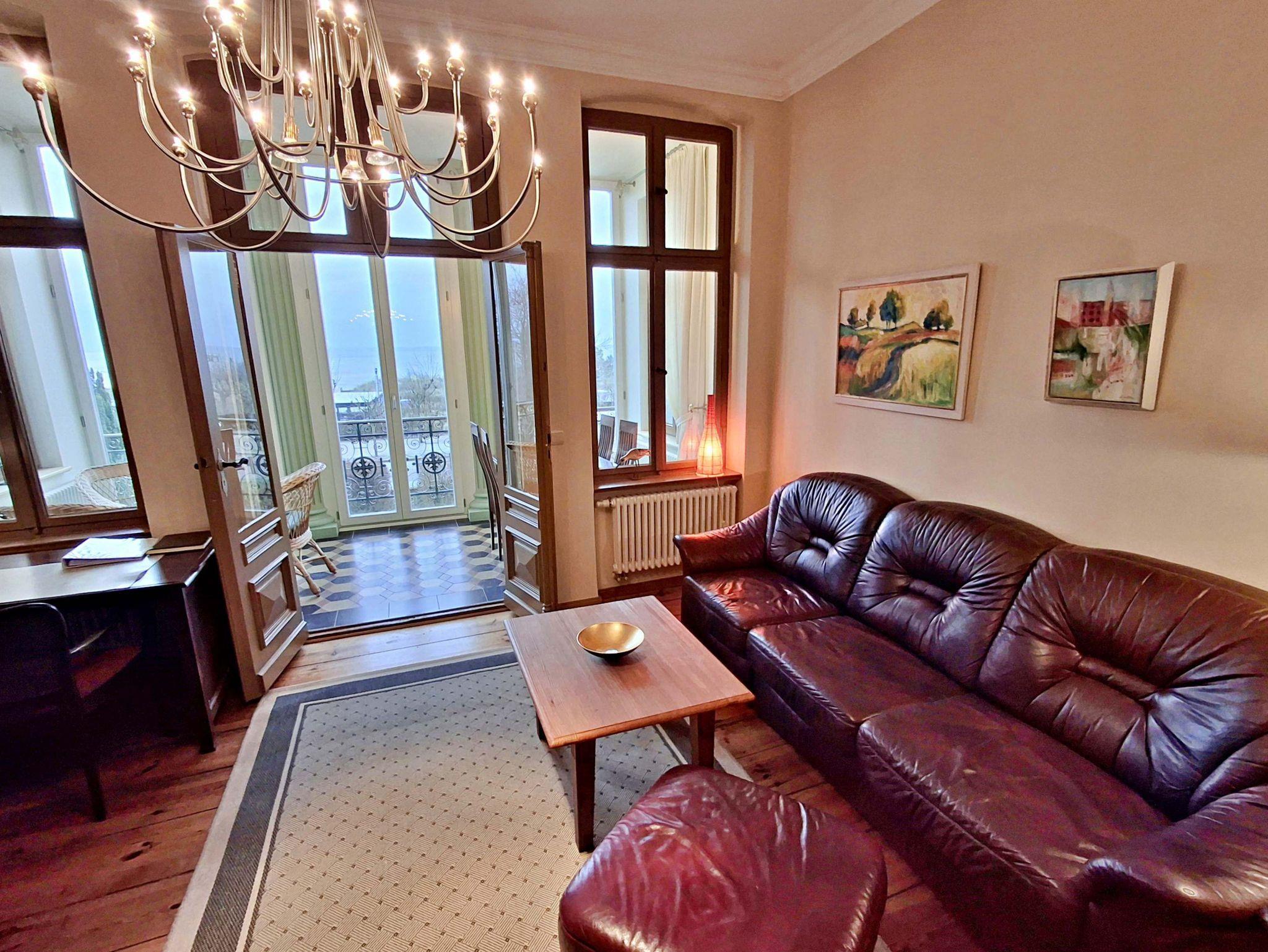 Herzlich willkommen in dieser charmanten Nichtraucher-Wohnung! Mit großzügigen 75 qm im ersten Obergeschoss bietet sie Ihnen ein stilvolles und komfortables Zuhause. Die beeindruckende Deckenhöhe und die denkmalgeschützten Ausstattungsdetails verleihen der Wohnung einen besonderen Charakter. Das helle Wohnzimmer lädt mit seinem Kamin, den eleganten Stuckelementen und dem historischen Dielenboden zum Verweilen ein. Hier finden Sie eine bequeme Sitzgruppe, einen Schreibtisch mit Meerblick, eine kleine Bibliothek sowie einen Flachbild-TV und moderne Audiotechnik, alles stilvoll in einem Schrank integriert. Die Veranda, ausgestattet mit historischen Bodenfliesen und Geländer sowie raumhohen Fenstern, bietet einen atemberaubenden Blick auf das Meer. Genießen Sie entspannte Stunden am Esstisch oder in der kleinen Sitzgruppe. In den beiden Schlafzimmern erwarten Sie gemütliche Doppelbetten, entwerder mit Blick auf das Meer oder einem Südbalkon, sowie ausreichend Stauraum in Kommoden und Kleiderschränken. Die separate, voll ausgestattete Küche lässt keine Wünsche offen und bietet Ihnen alles, was Sie für die Zubereitung Ihrer Lieblingsgerichte benötigen, einschließlich Ceranherd, Backofen, Geschirrspüler und Mikrowelle Das Badezimmer ist mit einer Badewanne und WC ausgestattet. Zusätzlich profitieren Sie von einem Parkplatz am Haus, einer eigenen Abstellkammer auf dem Grundstück sowie einer Waschmaschine und einem Trockner, die den Komfort dieser Wohnung abrunden. WLAN steht Ihnen in der gesamten Wohnung kostenfrei zur Verfügung. Bitte beachten Sie, dass eine Kaution in Höhe von 100 Euro für die Funk-Fernbedienung zum Befahren der Promenade erhoben wird.