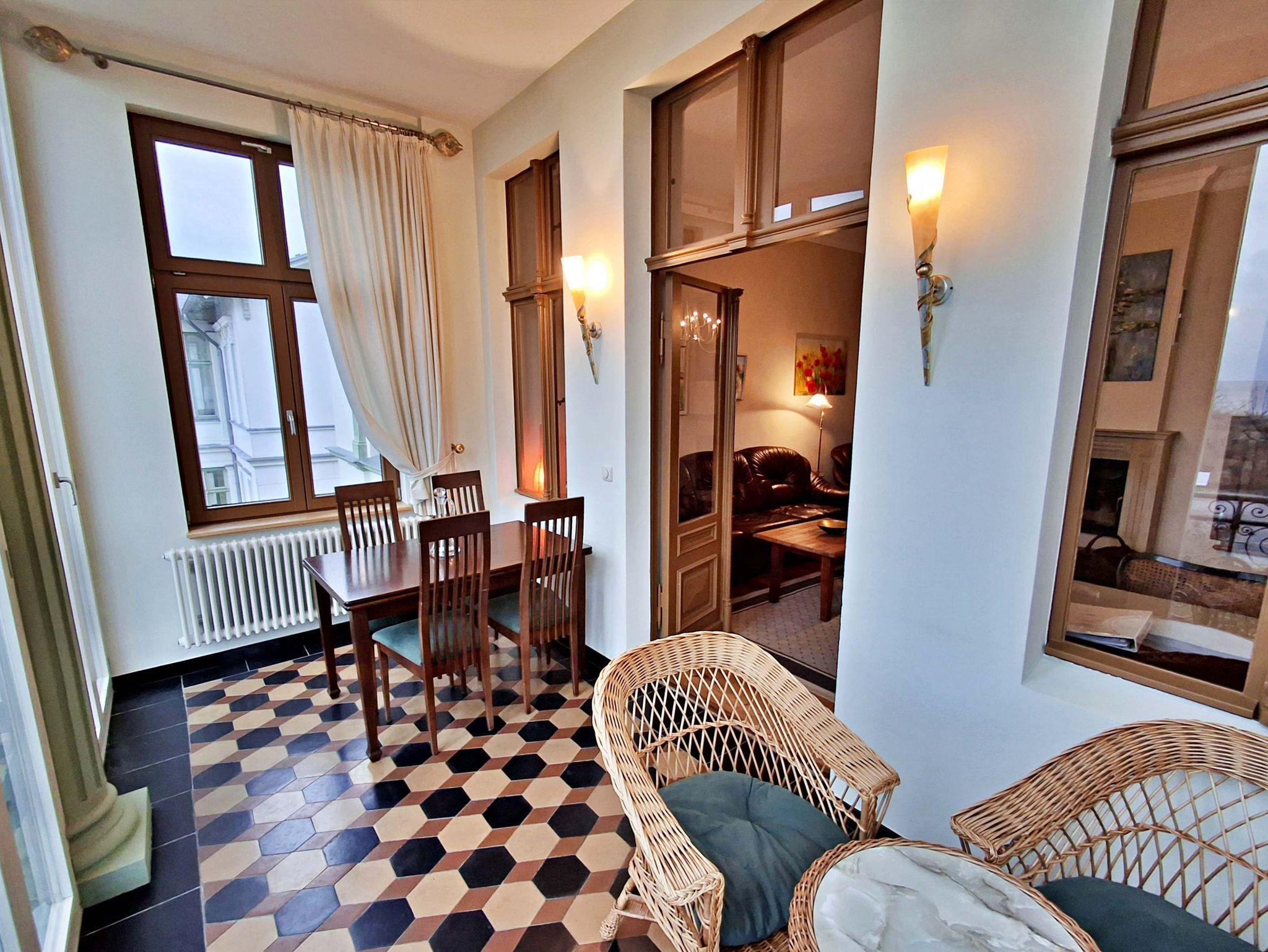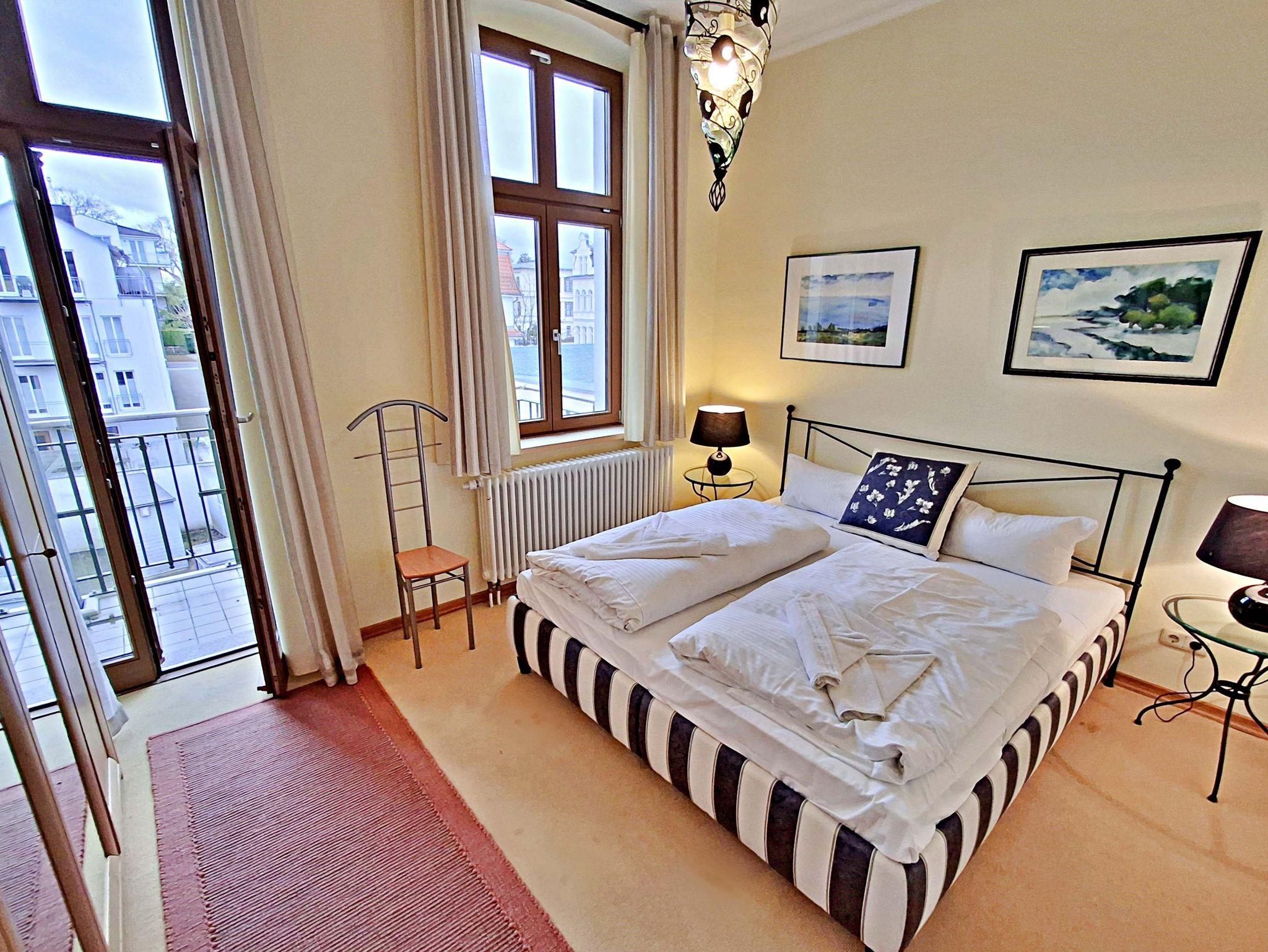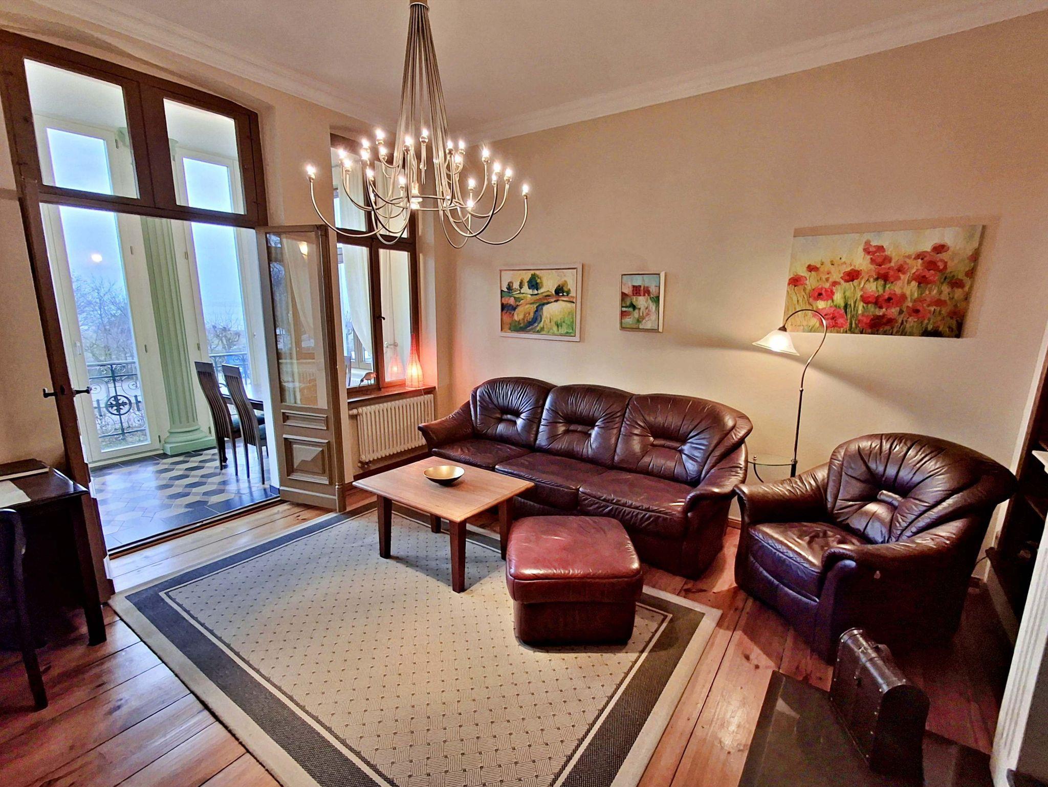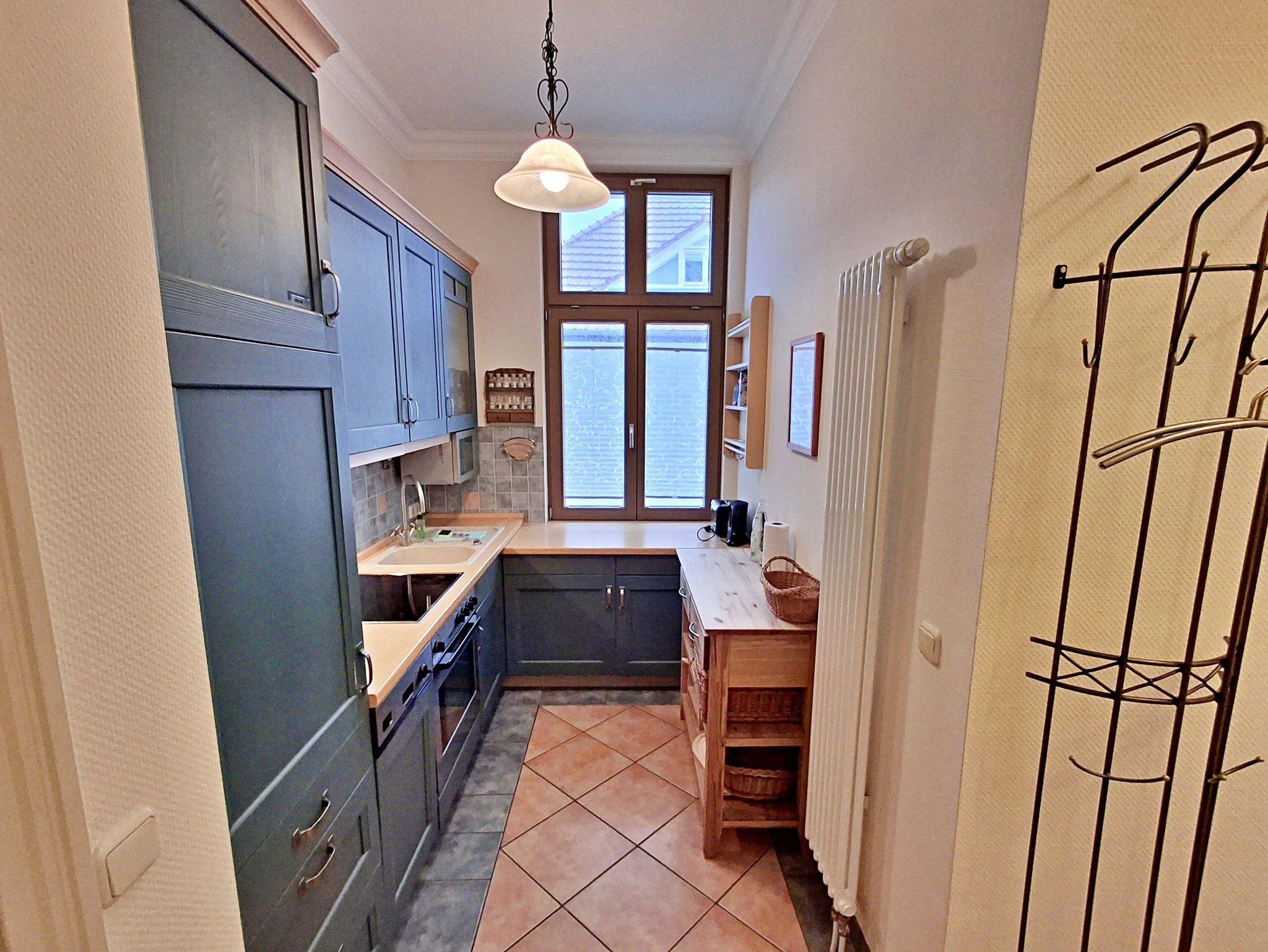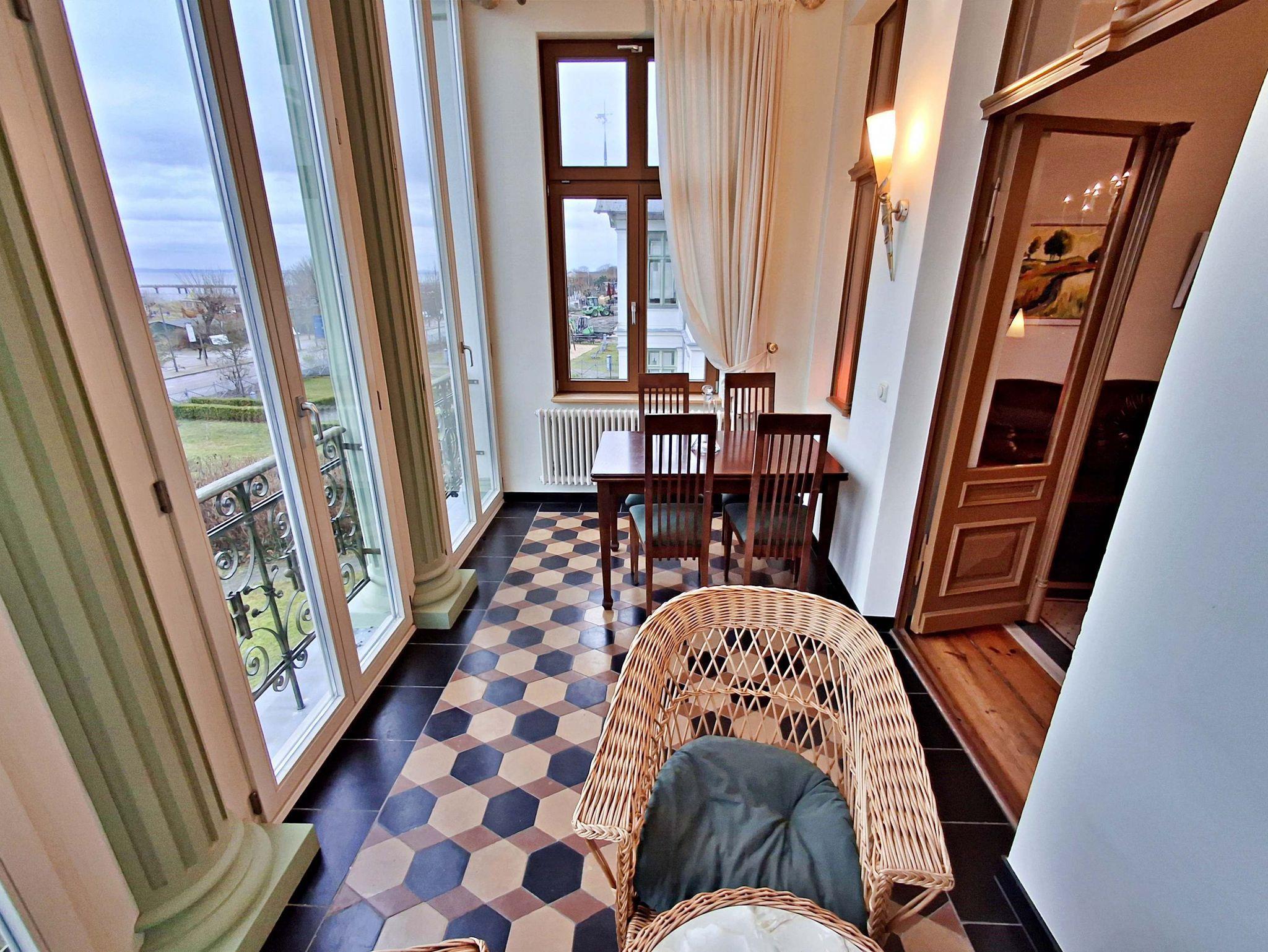 Herzlich willkommen in dieser charmanten Nichtraucher-Wohnung! Mit großzügigen 75 qm im ersten Obergeschoss bietet sie Ihnen ein stilvolles und komfortables Zuhause. Die beeindruckende Deckenhöhe und die denkmalgeschützten Ausstattungsdetails verleihen der Wohnung einen besonderen Charakter. Das helle Wohnzimmer lädt mit seinem Kamin, den eleganten Stuckelementen und dem historischen Dielenboden zum Verweilen ein. Hier finden Sie eine bequeme Sitzgruppe, einen Schreibtisch mit Meerblick, eine kleine Bibliothek sowie einen Flachbild-TV und moderne Audiotechnik, alles stilvoll in einem Schrank integriert. Die Veranda, ausgestattet mit historischen Bodenfliesen und Geländer sowie raumhohen Fenstern, bietet einen atemberaubenden Blick auf das Meer. Genießen Sie entspannte Stunden am Esstisch oder in der kleinen Sitzgruppe. In den beiden Schlafzimmern erwarten Sie gemütliche Doppelbetten, entwerder mit Blick auf das Meer oder einem Südbalkon, sowie ausreichend Stauraum in Kommoden und Kleiderschränken. Die separate, voll ausgestattete Küche lässt keine Wünsche offen und bietet Ihnen alles, was Sie für die Zubereitung Ihrer Lieblingsgerichte benötigen, einschließlich Ceranherd, Backofen, Geschirrspüler und Mikrowelle Das Badezimmer ist mit einer Badewanne und WC ausgestattet. Zusätzlich profitieren Sie von einem Parkplatz am Haus, einer eigenen Abstellkammer auf dem Grundstück sowie einer Waschmaschine und einem Trockner, die den Komfort dieser Wohnung abrunden. WLAN steht Ihnen in der gesamten Wohnung kostenfrei zur Verfügung. Bitte beachten Sie, dass eine Kaution in Höhe von 100 Euro für die Funk-Fernbedienung zum Befahren der Promenade erhoben wird.