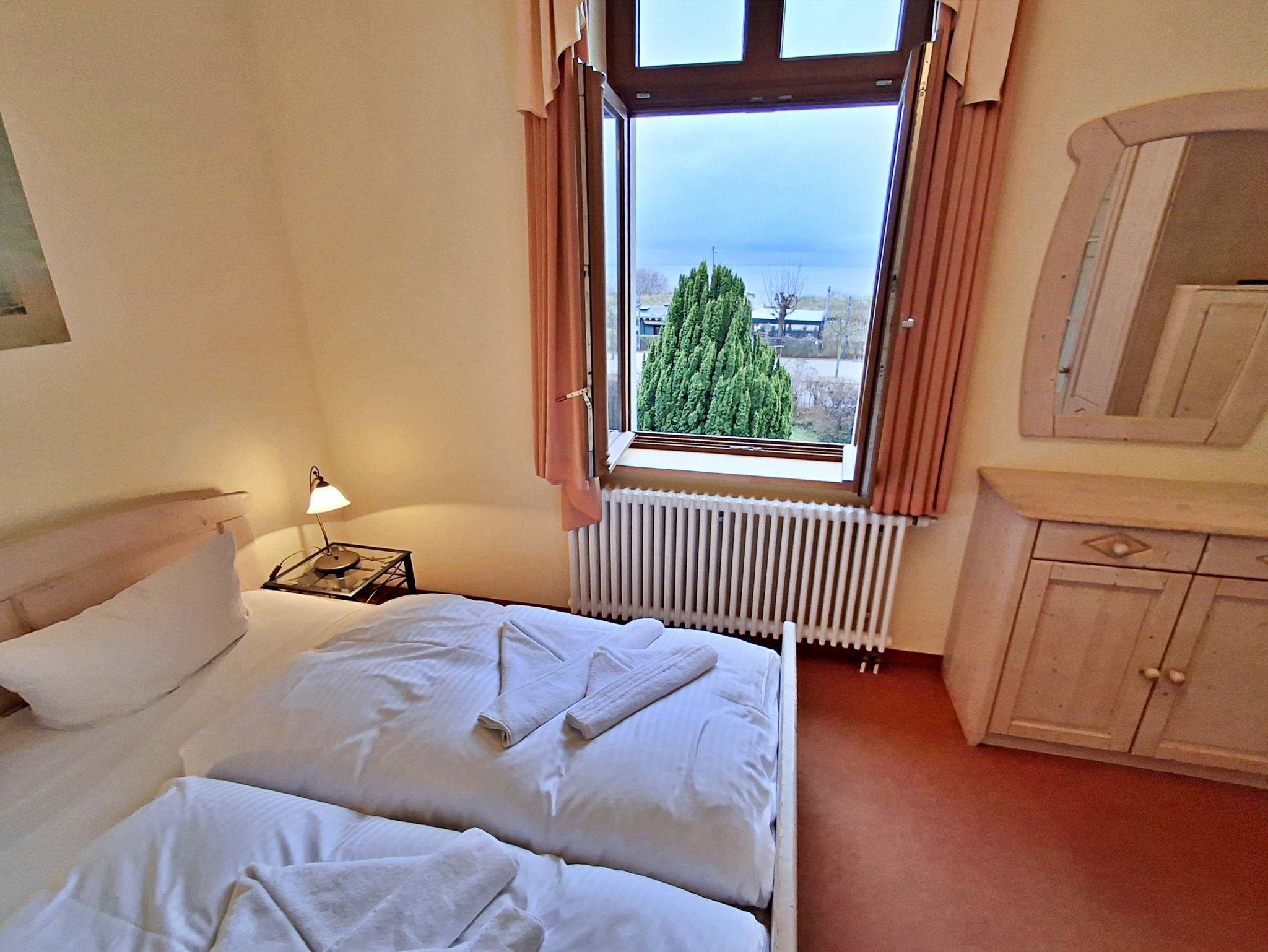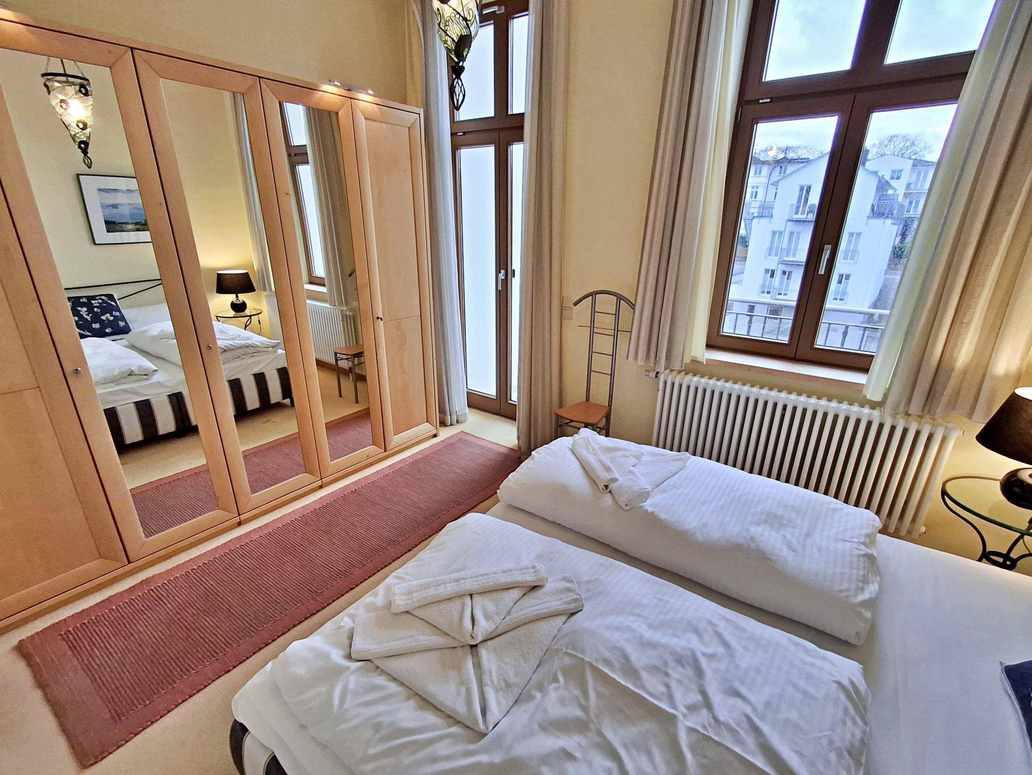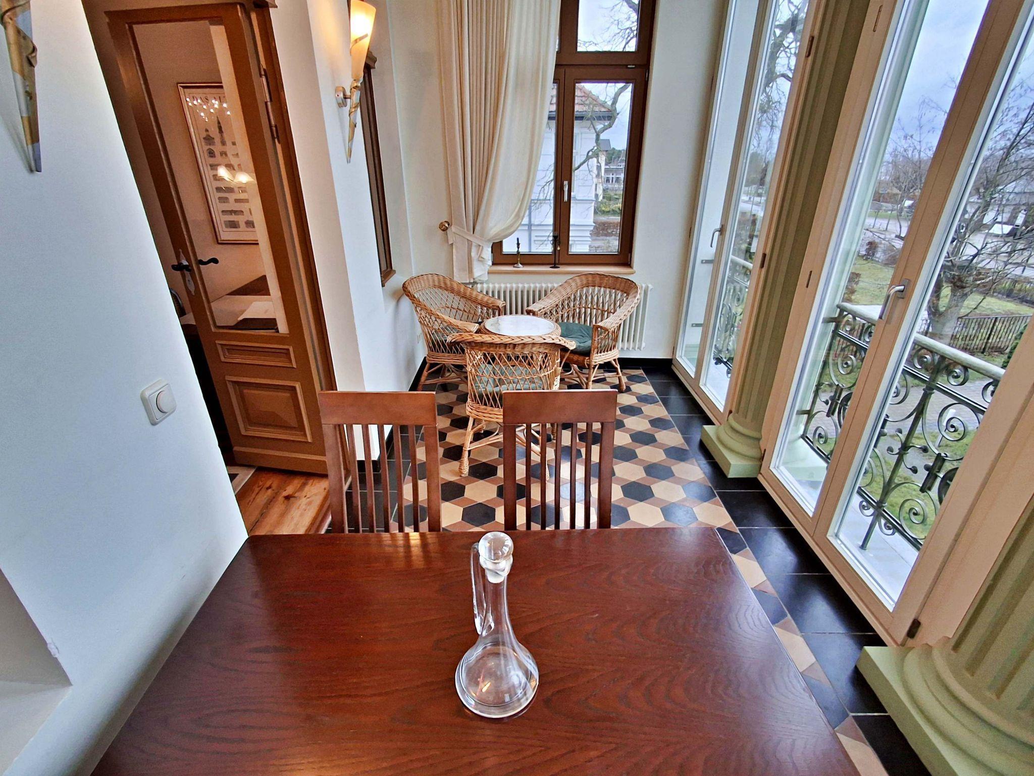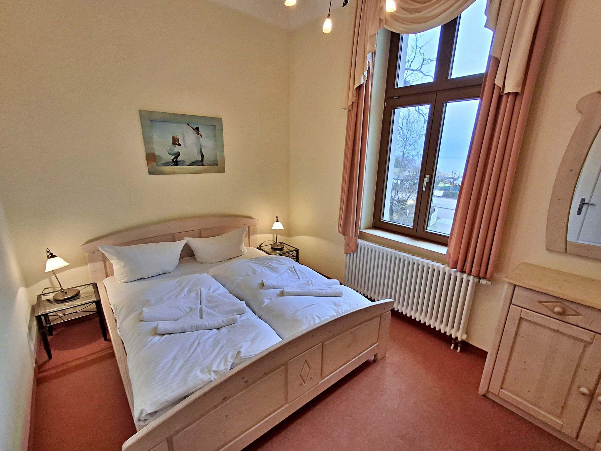 Herzlich willkommen in dieser charmanten Nichtraucher-Wohnung! Mit großzügigen 75 qm im ersten Obergeschoss bietet sie Ihnen ein stilvolles und komfortables Zuhause. Die beeindruckende Deckenhöhe und die denkmalgeschützten Ausstattungsdetails verleihen der Wohnung einen besonderen Charakter. Das helle Wohnzimmer lädt mit seinem Kamin, den eleganten Stuckelementen und dem historischen Dielenboden zum Verweilen ein. Hier finden Sie eine bequeme Sitzgruppe, einen Schreibtisch mit Meerblick, eine kleine Bibliothek sowie einen Flachbild-TV und moderne Audiotechnik, alles stilvoll in einem Schrank integriert. Die Veranda, ausgestattet mit historischen Bodenfliesen und Geländer sowie raumhohen Fenstern, bietet einen atemberaubenden Blick auf das Meer. Genießen Sie entspannte Stunden am Esstisch oder in der kleinen Sitzgruppe. In den beiden Schlafzimmern erwarten Sie gemütliche Doppelbetten, entwerder mit Blick auf das Meer oder einem Südbalkon, sowie ausreichend Stauraum in Kommoden und Kleiderschränken. Die separate, voll ausgestattete Küche lässt keine Wünsche offen und bietet Ihnen alles, was Sie für die Zubereitung Ihrer Lieblingsgerichte benötigen, einschließlich Ceranherd, Backofen, Geschirrspüler und Mikrowelle Das Badezimmer ist mit einer Badewanne und WC ausgestattet. Zusätzlich profitieren Sie von einem Parkplatz am Haus, einer eigenen Abstellkammer auf dem Grundstück sowie einer Waschmaschine und einem Trockner, die den Komfort dieser Wohnung abrunden. WLAN steht Ihnen in der gesamten Wohnung kostenfrei zur Verfügung. Bitte beachten Sie, dass eine Kaution in Höhe von 100 Euro für die Funk-Fernbedienung zum Befahren der Promenade erhoben wird.