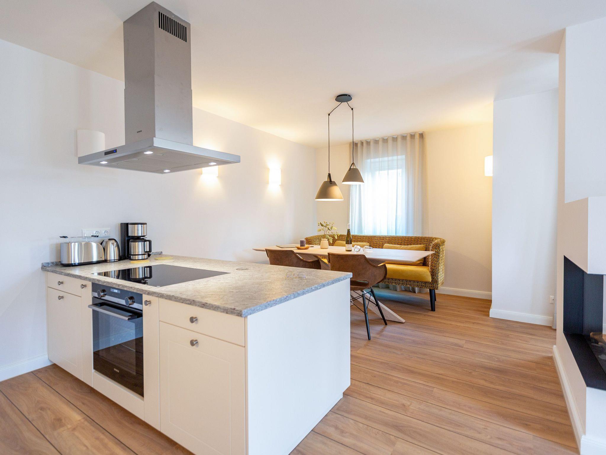 In diesen 2021 errichteten Häusern trifft Helligkeit auf Moderne und bietet Ihnen in seinen stilvoll eingerichteten Zwei- bis Drei-Zimmer Appartements Komfort auf höchster Ebene. Die offen gestalteten Wohn-Ess-Bereiche überzeugen durch ein stylisches Ambiente und ihr großzügiges Raumkonzept. Die teilweise mit Kochinseln ausgestatteten Küchen integrieren sich perfekt in den ebenso schlichten wie modernen Wohnraum. Alle Appartements verfügen über zwei Bäder oder ein Bad und ein zusätzliches Gäste-WC. Um Ihre Auszeit am Meer zusätzlich zu verschönern, wurden alle Appartements mit Gaskamin und Finnischer Sauna ausgestattet. Genießen Sie von den großzügigen Balkonen und Terrassen den Ausblick auf die parkähnliche Grünanlage oder verbringen Sie Ihren Abend auf dem frei zur Verfügung stehenden Grillplatz mit Sitzecke und Grill. Ein kostenloser PKW-Stellplatz in der Tiefgarage (Einfahrtshöhe 1,95m, Anfahrt über die Straße ?Kieferngrund? Höhe Hausnummer 17) gehört ebenso zum Komfort dieser Appartement-Häuser wie kostenfreies W-Lan. Für E-Autos steht am Objekt eine E-Ladesäule mit 2 Ladeplätzen (gesamt 22 kW) auf dem Grundstück kostenpflichtig zur Verfügung. Eine Waschmaschine und ein Trockner können Sie gegen Gebühr über die kostenlose App WeWash nutzen.
