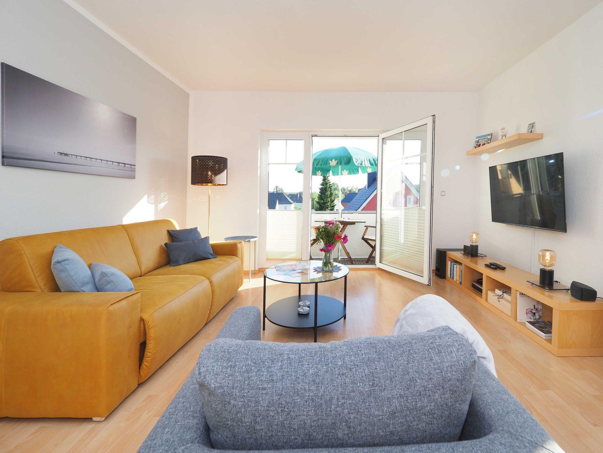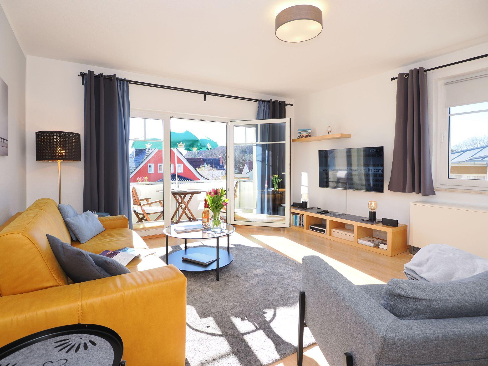 Diese helle und freundliche 58 qm große Nichtraucher-Wohnung befindet sich im 1. OG mit einer Treppe (ohne Fahrstuhl) und verfügt über ein gemütliches Wohnzimmer mit Couch, Sessel, Musikanlage und Flachbild-TV. Von hier aus gelangen Sie auf den Balkon (Südseite) auf dem Sie den Tag am Meer gemütlich ausklingen lassen können. In der großen, separaten voll ausgestatteten Küche mit einer schönen Sitzecke können Sie morgens Ihr Frühstück genießen. Das Schlafzimmer hat ein Doppelbett und Verdunklungsvorhänge sorgen für einen ruhigen Schlaf. Das Tageslicht-Bad mit Dusche komplettiert die moderne Ausstattung dieser Wohnung. Gratis W-LAN steht Ihnen während des Aufenthaltes zur Verfügung. Ihren eigenen Pkw können Sie gern hinter dem Haus parken. Ihre Fahrräder finden in dem abgeschlossenen Fahrradabstellraum Platz.