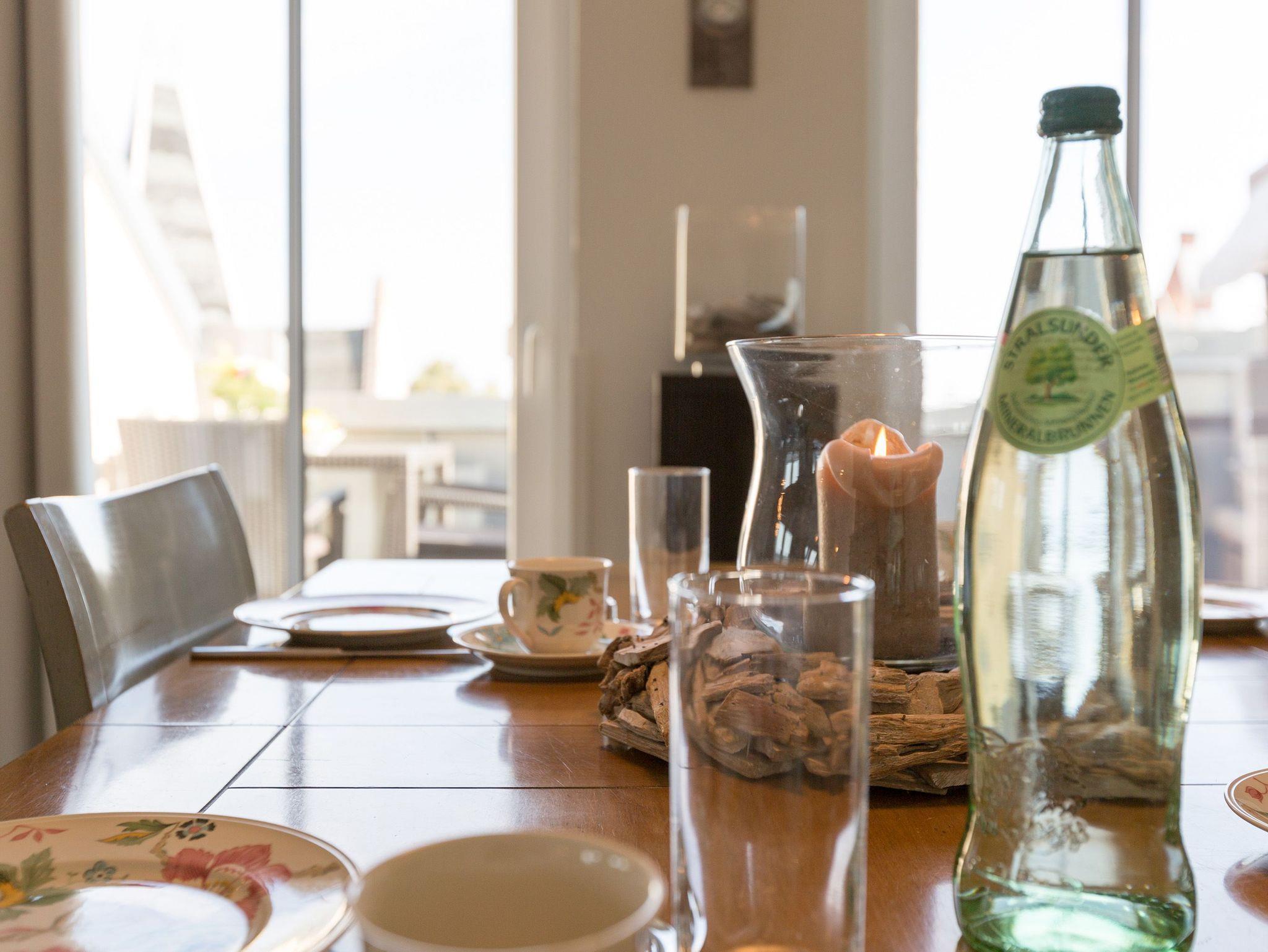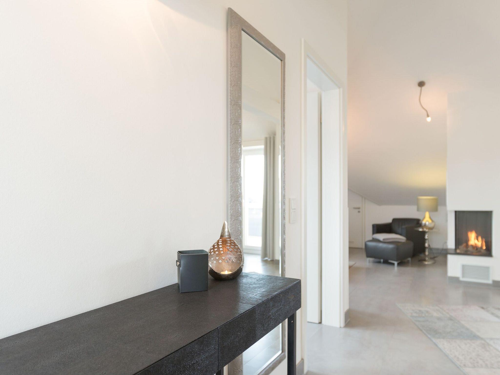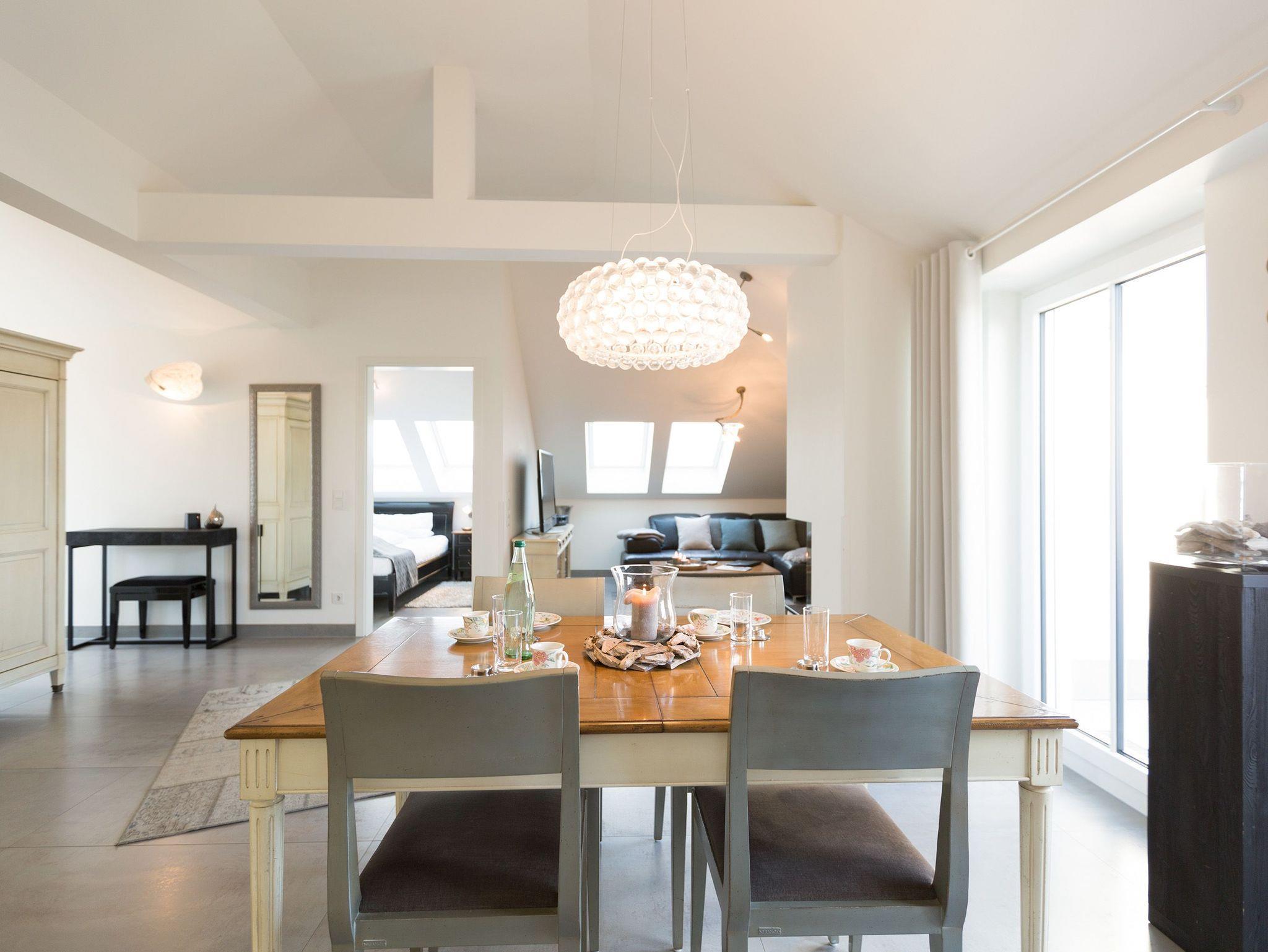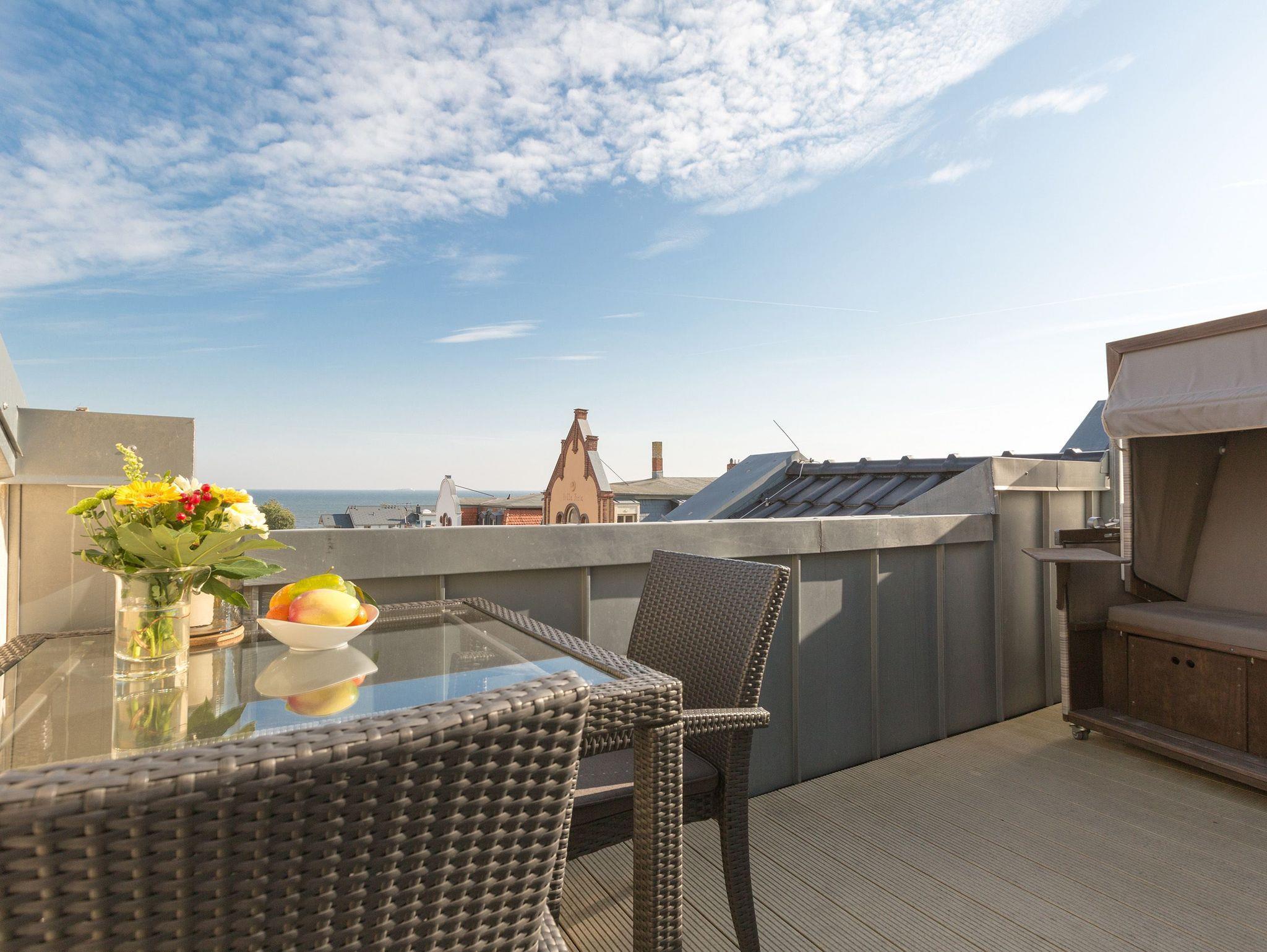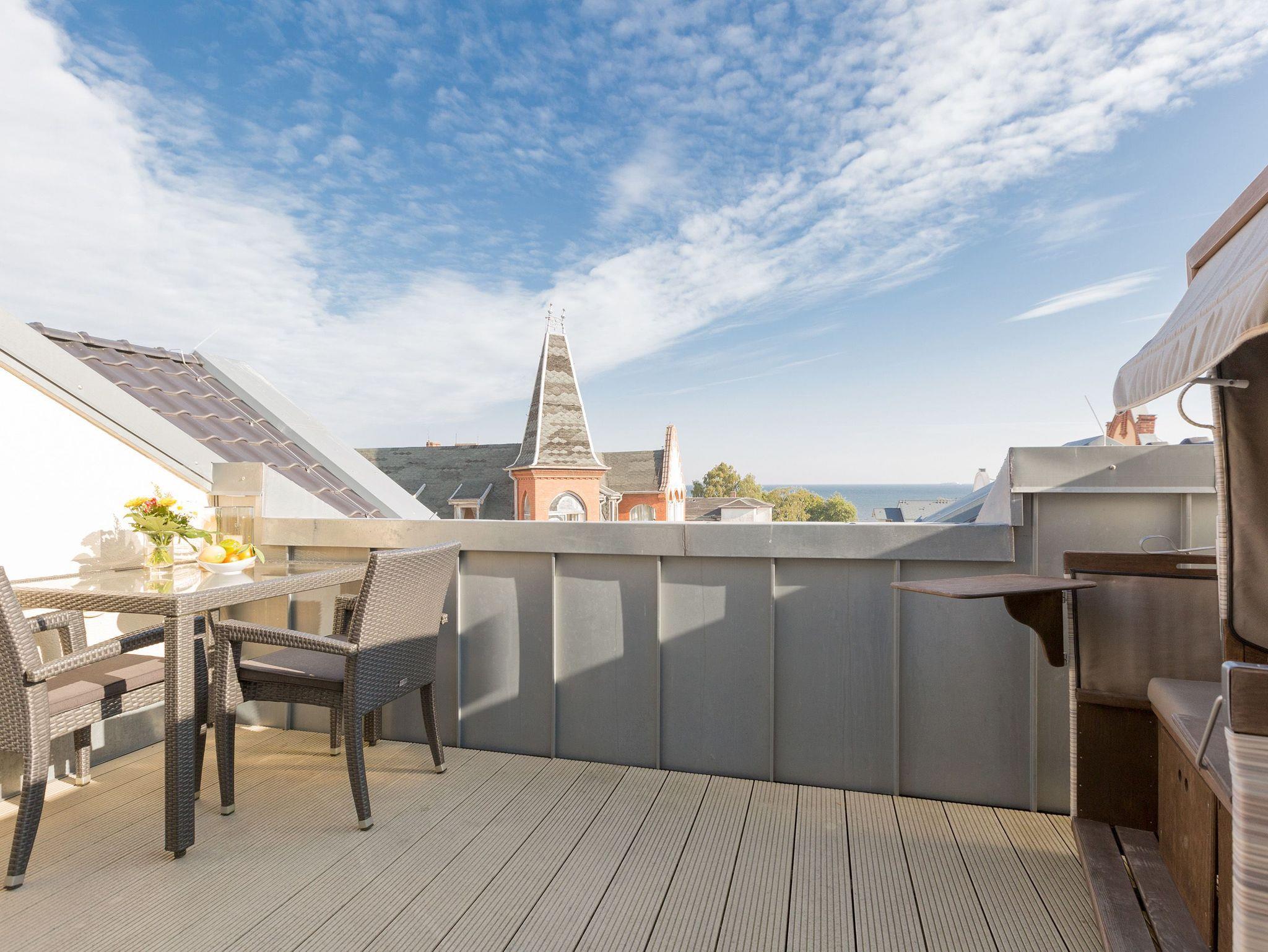 Voilà - ganz oben unter dem Dach des Vorderhauses erwartet Sie nicht nur ein schöner Blick auf die Ostsee, sondern auch eine perfekt gestylte, luxuriöse 2-Raum-Ferienwohnung auf großzügigen 75 qm (buchbar für 2 Personen [&] 1 Kleinkind bis 3 Jahre im Kinderreisebett). Wunderschöne französische Möbel aus der Manufaktur Grange und aparte Stoffe von Joop, kombiniert mit modernem Design ergeben hier ein harmonisches Ambiente zum Wohlfühlen. Schon beim Eintreten in den Flurbereich offeriert sich Ihnen ein großer Wohnbereich mit angrenzender offener Küche und Essplatz, von dem man über den Balkon auf das Meer schaut. Auf diesem uneinsehbaren Balkon steht Ihnen neben Gartenmöbeln auch ein komfortabler XXL-Strandkorb (Volllieger) zur Verfügung. Das gemütliche Flair der bequemen Ledergarnitur im Wohnbereich wird durch Loewe-Flat und Blue-Ray-Player komplettiert. Ein besonderes Highlight ist der Gaskamin, der per Fernbedienung mühelos zu bedienen ist. Ein harmonisches Schlafzimmer (absolut[nbsp] abdunkelbar) mit Doppelbett (1,80m x 2,00m), Loewe-Flat und Einbauschrank, ein exponiertes Dornbracht Bad mit großer ebenerdiger Echtglasdusche, puristischen Formen beim Waschtisch und WC, sowie ein kleiner sonniger Südwestbalkon vervollkommnen das Domizil. Für Ihren Komfort sind die Betten bei der Anreise bezogen und Handtücher liegen bereit. Ein Pkw-Stellplatz steht in der Tiefgarage zur Verfügung. Eine Waschmaschine in der Wohnung ist gegen Gebühr nutzbar. Auf Wunsch stellen wir ein Kinderreisebett ( ohne zusätzliche Matratze [&] Bettzeug) und einen Kinderhochstuhl gegen einen Aufpreis zur Verfügung. Das WLAN-Netz ist kostenfrei nutzbar. Ganz neu: Vital [&] köstlich bieten wir Ihnen exklusiv in diesem Appartement belebtes GRANDER Trinkwasser für mehr Lebensenergie und gesteigertes Wohlbefinden an.