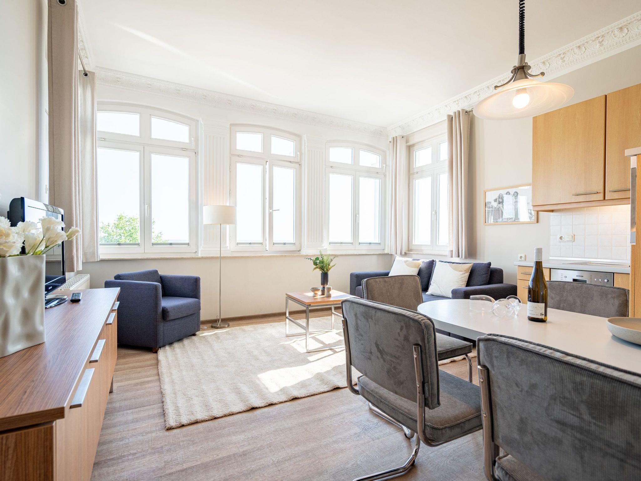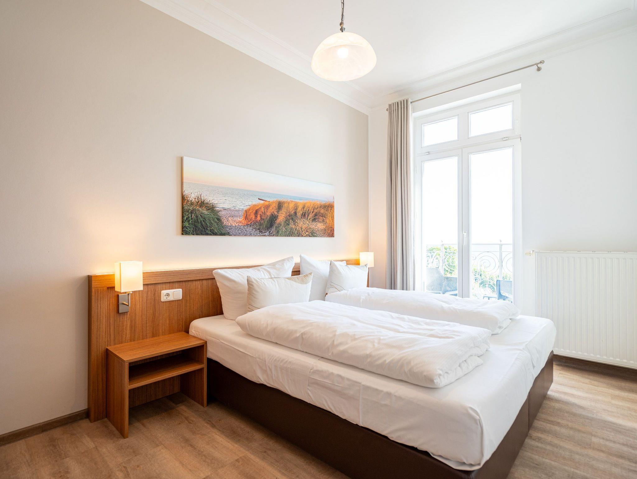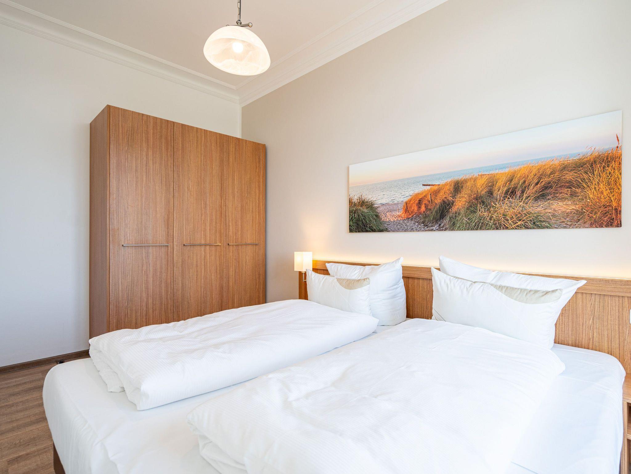 Die 3-Raum-Ferienwohnung Nr. C12 in der Villa Seedüwel bietet auf 52 qm Platz für 2 bis 4 Personen und befindet sich im 2. Obergeschoss. Der offene Wohnbereich besticht durch einen traumhaften Blick auf die Seebrücke und die Ostsee. Hier finden Sie eine gut ausgestattete Küchenzeile mit einem 2-Platten-Cerankochfeld, einer Mikrowelle und einem Kühlschrank mit Gefrierfach sowie einen Essplatz für vier Personen, eine gemütliche Sitzgruppe und einen Flat-TV. Das erste Schlafzimmer verfügt über ein komfortables Doppelbett (1,80 m x 2,00 m) und einen Kleiderschrank. Von hier aus gelangen Sie auf den kleinen Nord-Ost-Balkon, der einen schönen Blick auf die Ostsee bietet. Das zweite Schlafzimmer ist mit einem Etagenbett (0,90 m x 2,00 m) ausgestattet. Das innenliegende Bad umfasst eine Dusche und ein Waschbecken, zudem gibt es ein separates WC. Ein Stellplatz in der Tiefgarage ( Einfahrthöhe 2,03m) des benachbarten Hauses „Strandterrasse“ ist für Sie reserviert. WLAN steht Ihnen kostenfrei zur Verfügung.