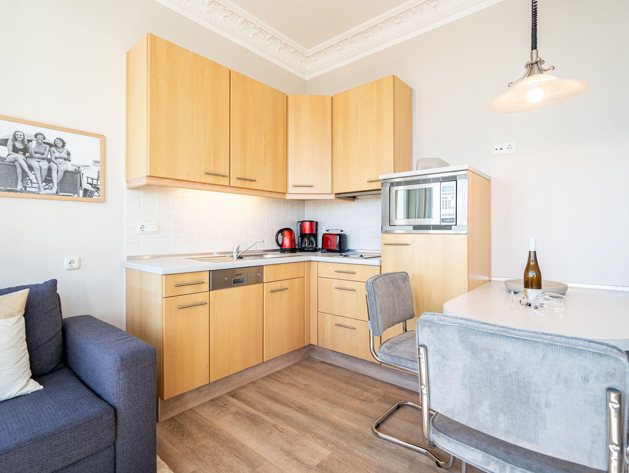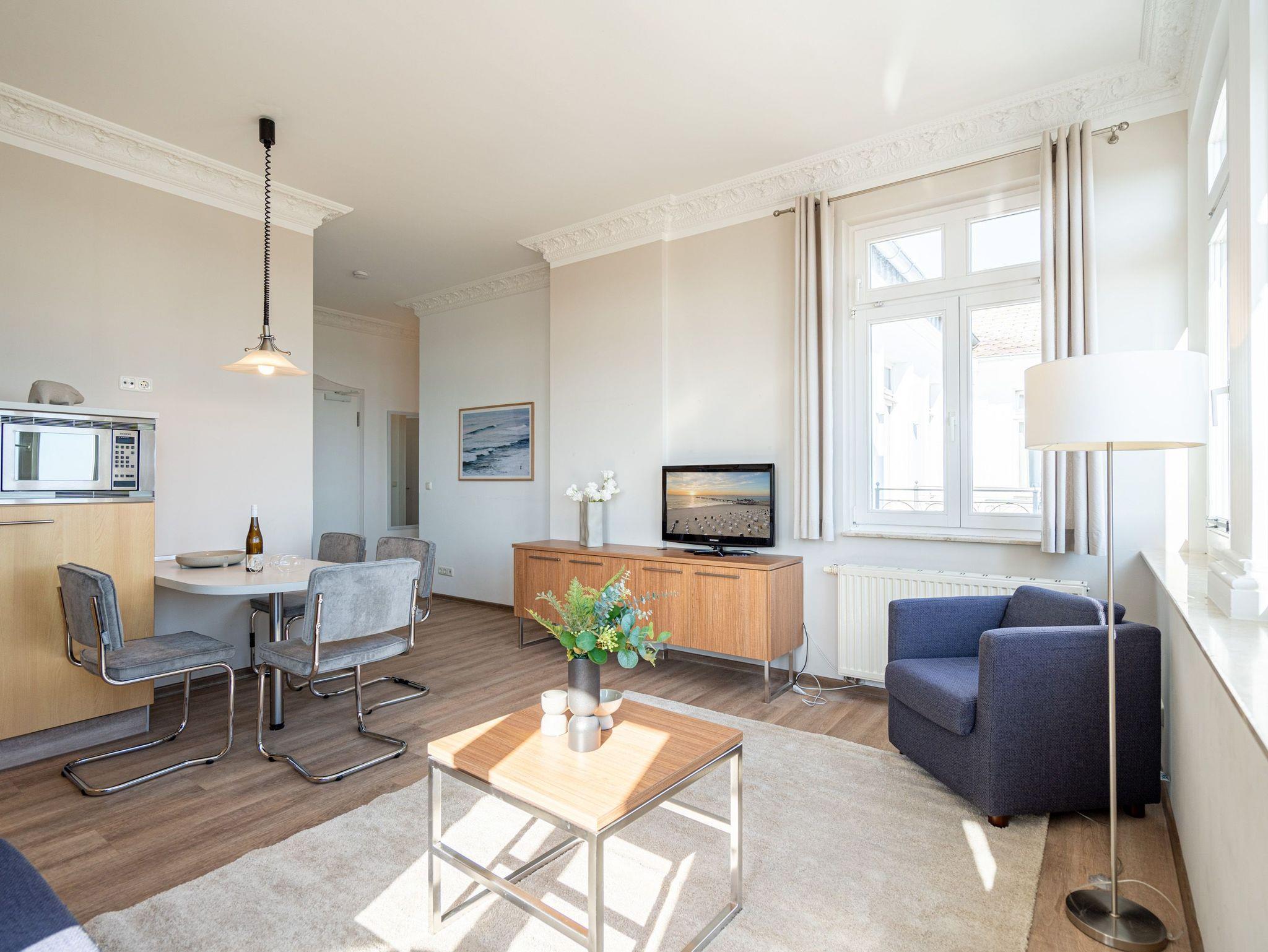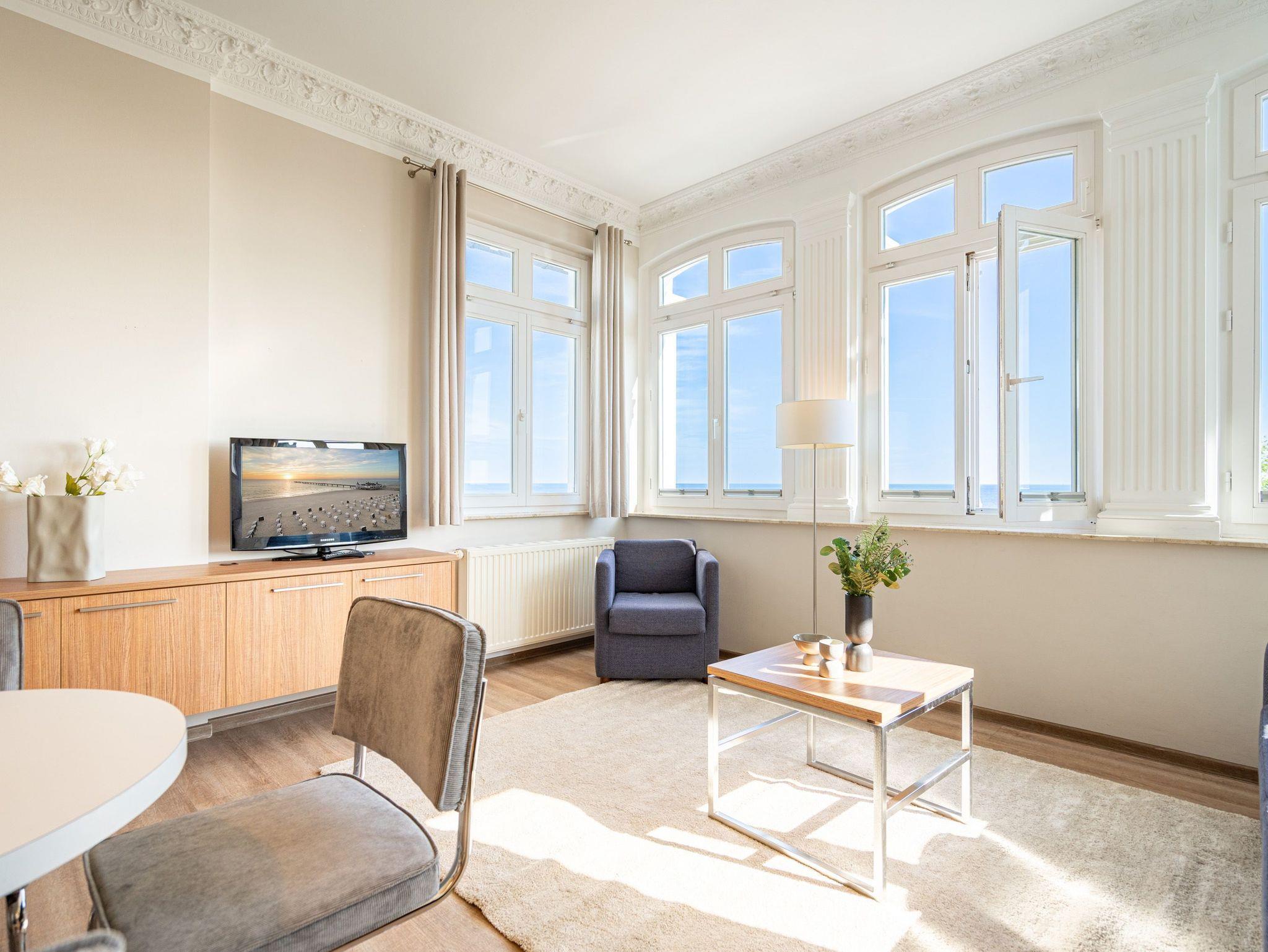 Die 3-Raum-Ferienwohnung Nr. C12 in der Villa Seedüwel bietet auf 52 qm Platz für 2 bis 4 Personen und befindet sich im 2. Obergeschoss. Der offene Wohnbereich besticht durch einen traumhaften Blick auf die Seebrücke und die Ostsee. Hier finden Sie eine gut ausgestattete Küchenzeile mit einem 2-Platten-Cerankochfeld, einer Mikrowelle und einem Kühlschrank mit Gefrierfach sowie einen Essplatz für vier Personen, eine gemütliche Sitzgruppe und einen Flat-TV. Das erste Schlafzimmer verfügt über ein komfortables Doppelbett (1,80 m x 2,00 m) und einen Kleiderschrank. Von hier aus gelangen Sie auf den kleinen Nord-Ost-Balkon, der einen schönen Blick auf die Ostsee bietet. Das zweite Schlafzimmer ist mit einem Etagenbett (0,90 m x 2,00 m) ausgestattet. Das innenliegende Bad umfasst eine Dusche und ein Waschbecken, zudem gibt es ein separates WC. Ein Stellplatz in der Tiefgarage ( Einfahrthöhe 2,03m) des benachbarten Hauses „Strandterrasse“ ist für Sie reserviert. WLAN steht Ihnen kostenfrei zur Verfügung.