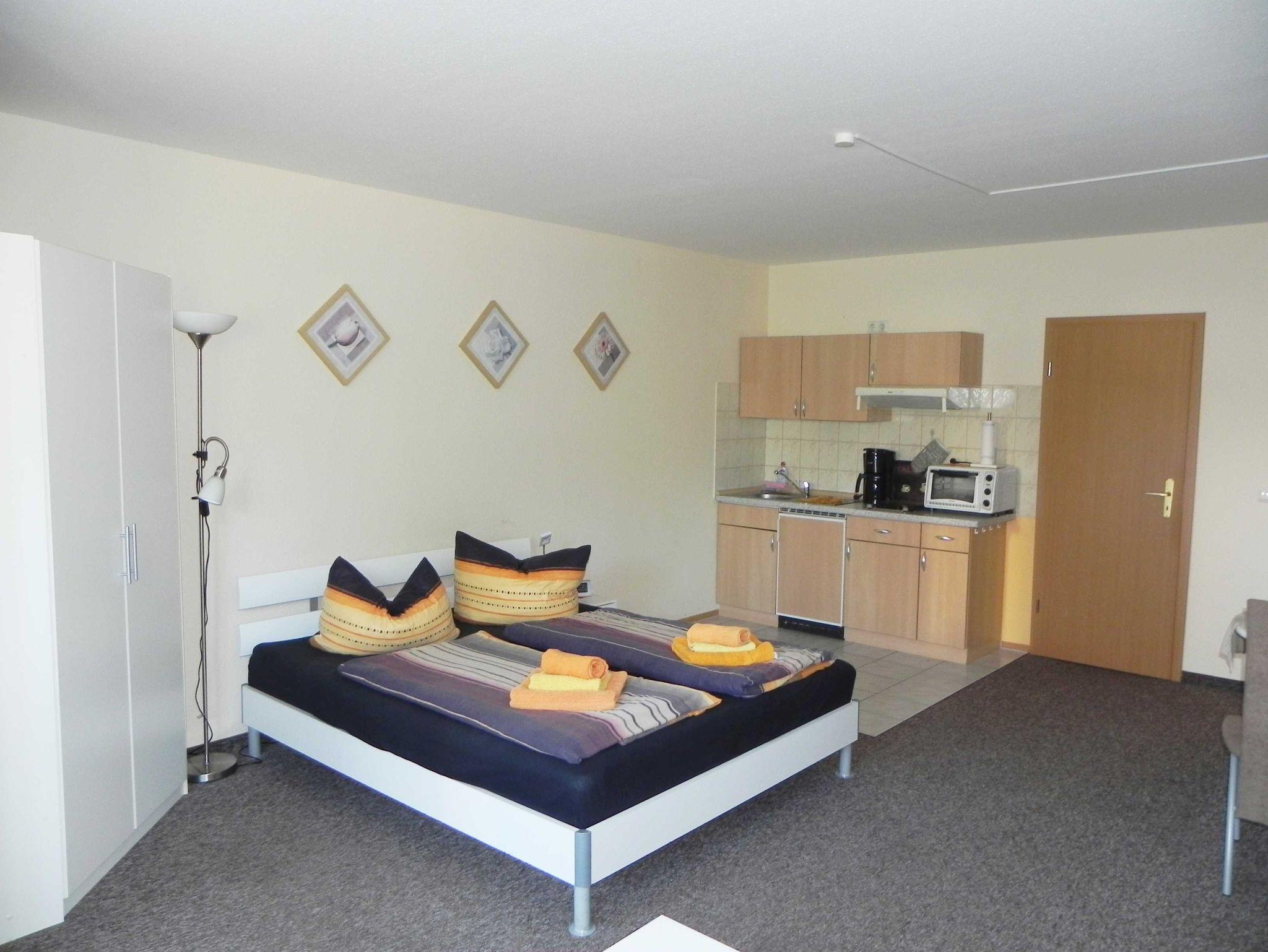 Die kleine und feine 1-Raum-Ferienwohnung im Erdgeschoss bietet mit seinen 35 qm einen idealen Rückzugsort für bis zu 4 Erwachsenen. Der helle Wohn-/Schlafbereich verfügt über ein bequemes Doppelbett, Kleiderschrank, Flachbild-TV und eine gemütliche Couch (ausziehbar, kann als Aufbettungsmöglichkeit für 2 Personen genutzt werden). Mit einer Pantry-Küche mit 2 Kochfeldern, Kühlschrank, Mini-Backofen, Kaffeemaschine, Wasserkocher, Geschirr sowie einem Essplatz für 4 Personen bietet diese Wohnung gute Voraussetzungen für das gemütliche Frühstück oder das kleine Abendessen. Das Badezimmer ist funktional gestaltet: mit Dusche und WC. Eine Terrasse direkt vor der Wohnung lädt schon morgens dazu ein Ihren Kaffee zu genießen oder den Abend bei einem Glas Wein ausklingen zu lassen.