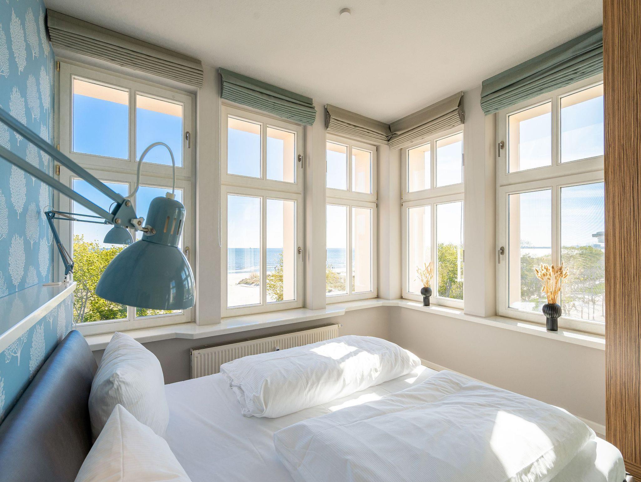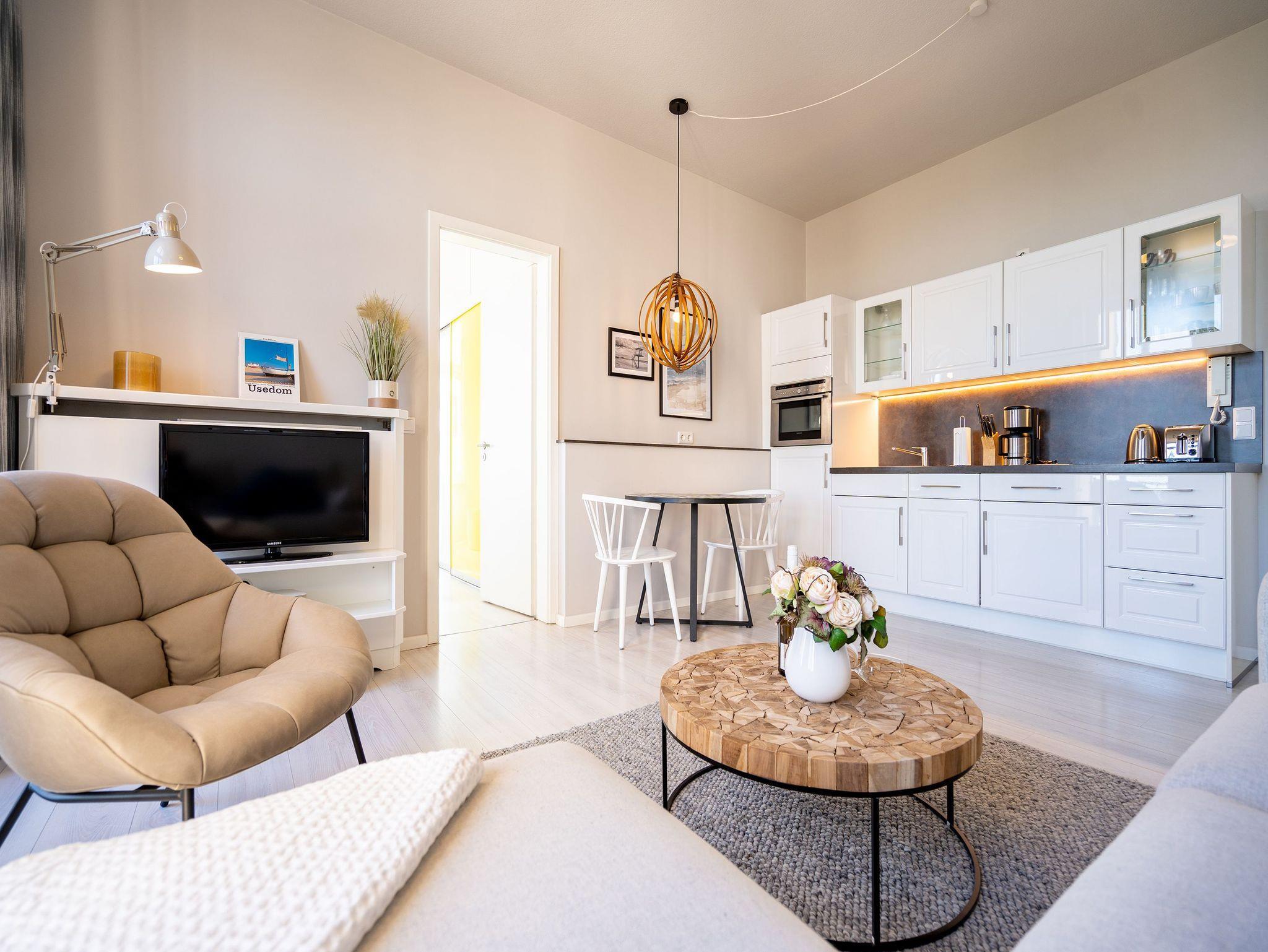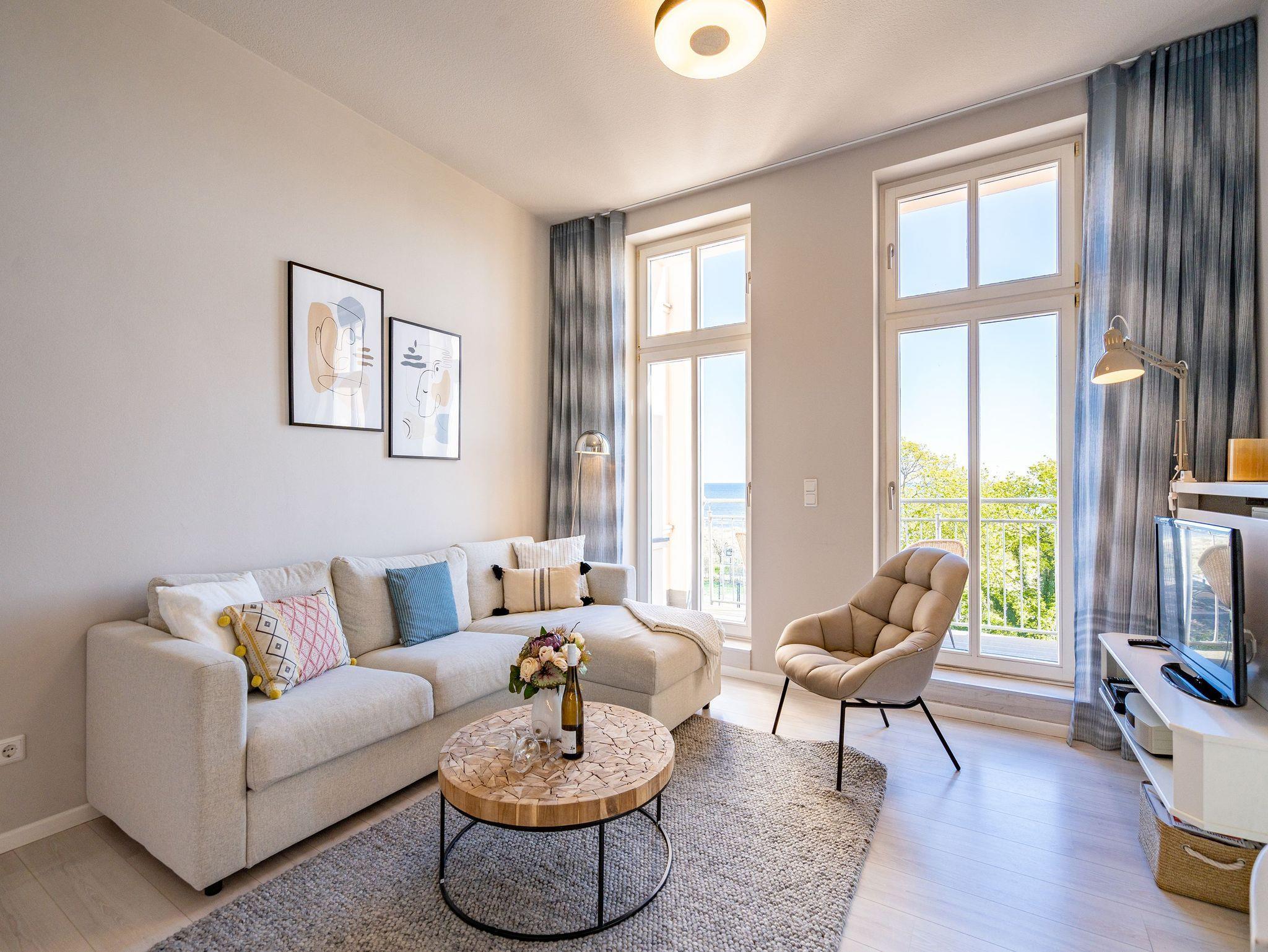 Willkommen an der Ostsee! In der Ferienwohnung 11 im 2. Obergeschoss der Villa Anna erwartet Sie jede Menge Ausblick auf´s Meer. Und nicht nur das! Eine stilsichere, neue Einrichtung, geschmackvolle Farben und Stoffe arrangiert auf gemütlichen 45 qm Wohnfläche bieten perfektes Urlaubsziel für 2 Personen und 1 Baby. Dem modernen Wohnbereich mit Meerblick sind die komplett ausgestattete Küchenzeile und ein schöner Essplatz angeschlossen. Das Schlafzimmer ist ein Traum, vom erhöhten Bett ( 1,80m x 2m) genießt man den freien Blick auf die Ostsee, die Swinemünder Bucht und die Ahlbecker Promenade. Wer will, kann natürlich auch dem Smart-TV Aufmerksamkeit schenken. Der Zugang zum Bad mit Badewanne und Dusche versteckt sich hinter den Einbauten des Schlafzimmers. Auch vom Balkon hat man einen wunderschönen Ausblick auf die Ostsee. Für Ihren Komfort sind die Betten bei der Anreise bezogen und Handtücher liegen bereit (Erstausstattung). Auf Wunsch stellen wir für unsere kleinen Gäste ein Kinderreisebett (ohne zusätzliche Matratze [&] Bettzeug) und einen Kinderhochstuhl ( gegen einen Aufpreis) zur Verfügung. Ein Pkw-Stellplatz in der Doppelparkgarage ( max. Einfahrthöhe 1,50 m / Breite: 1,90m / max. Länge 5m / 2000 kg ) steht am Haus zur Verfügung. Das WLAN-Netz im Haus ist kostenfrei nutzbar.