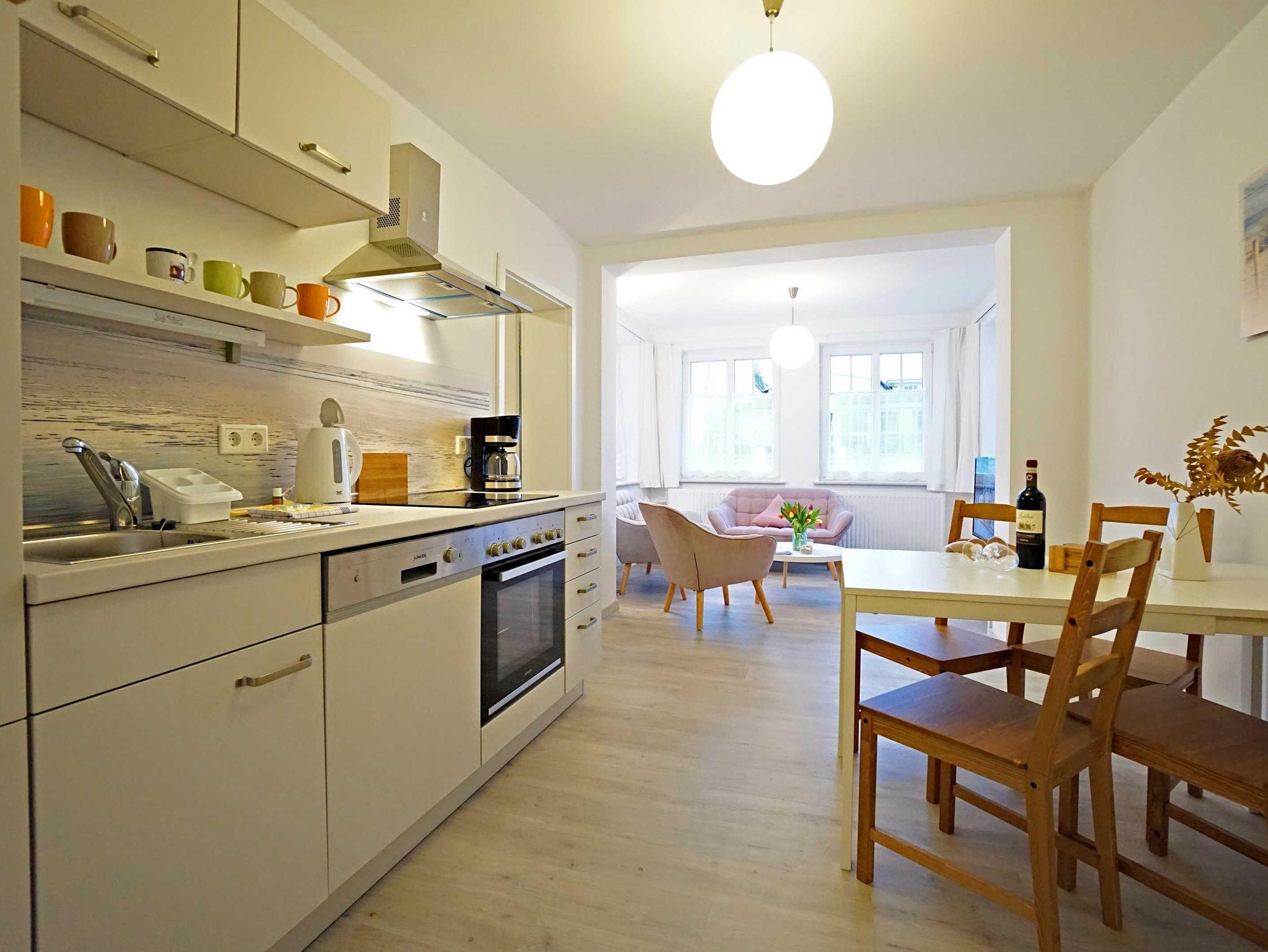 an der Dünenstraße, um den Charme der Kaiserbäder eindrucksvoll und unverfälscht widerzuspiegeln. Das historische Ambiente bietet beste Voraussetzungen für einen gelungenen Urlaub. Die Wohnungen sind modern und komfortabel eingerichtet und verfügen jeweils über 2 Schlafzimmer, Diele, Bad,Wohnzimmer mit Küchenzeile.